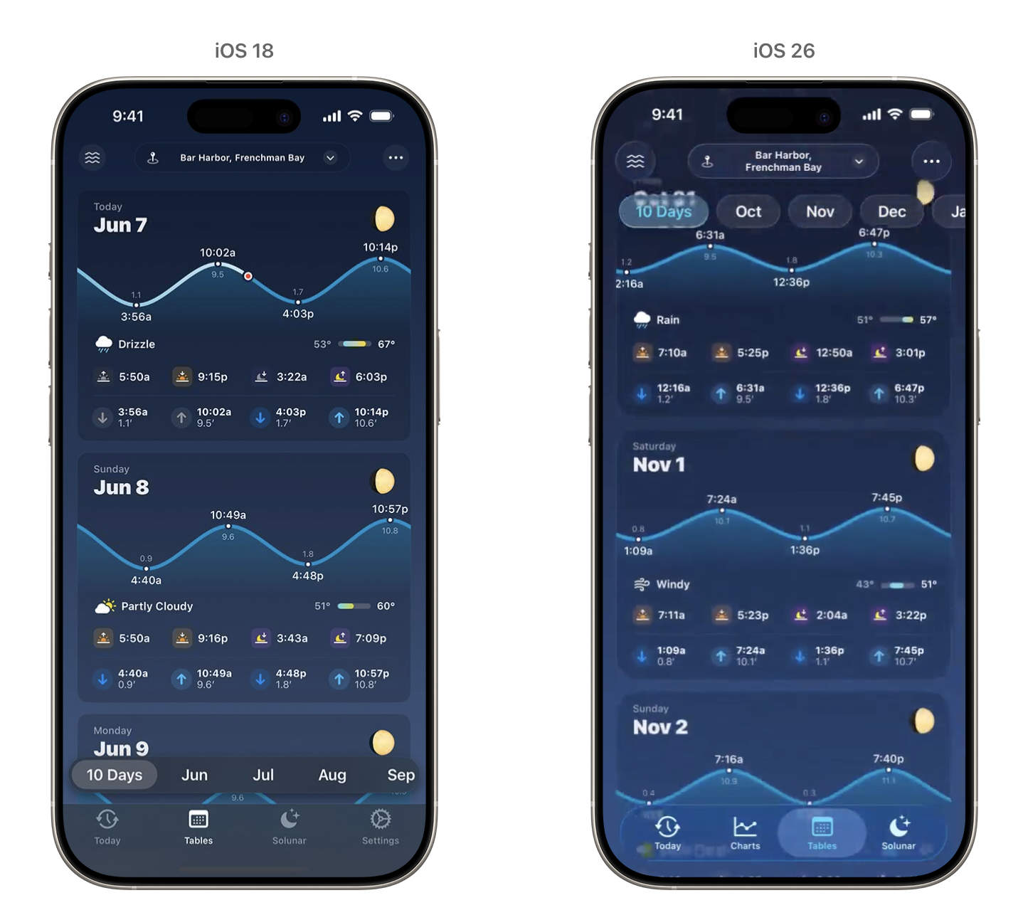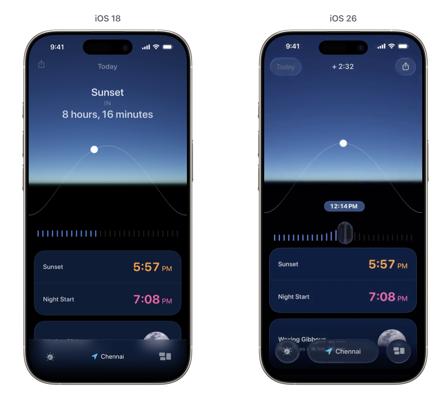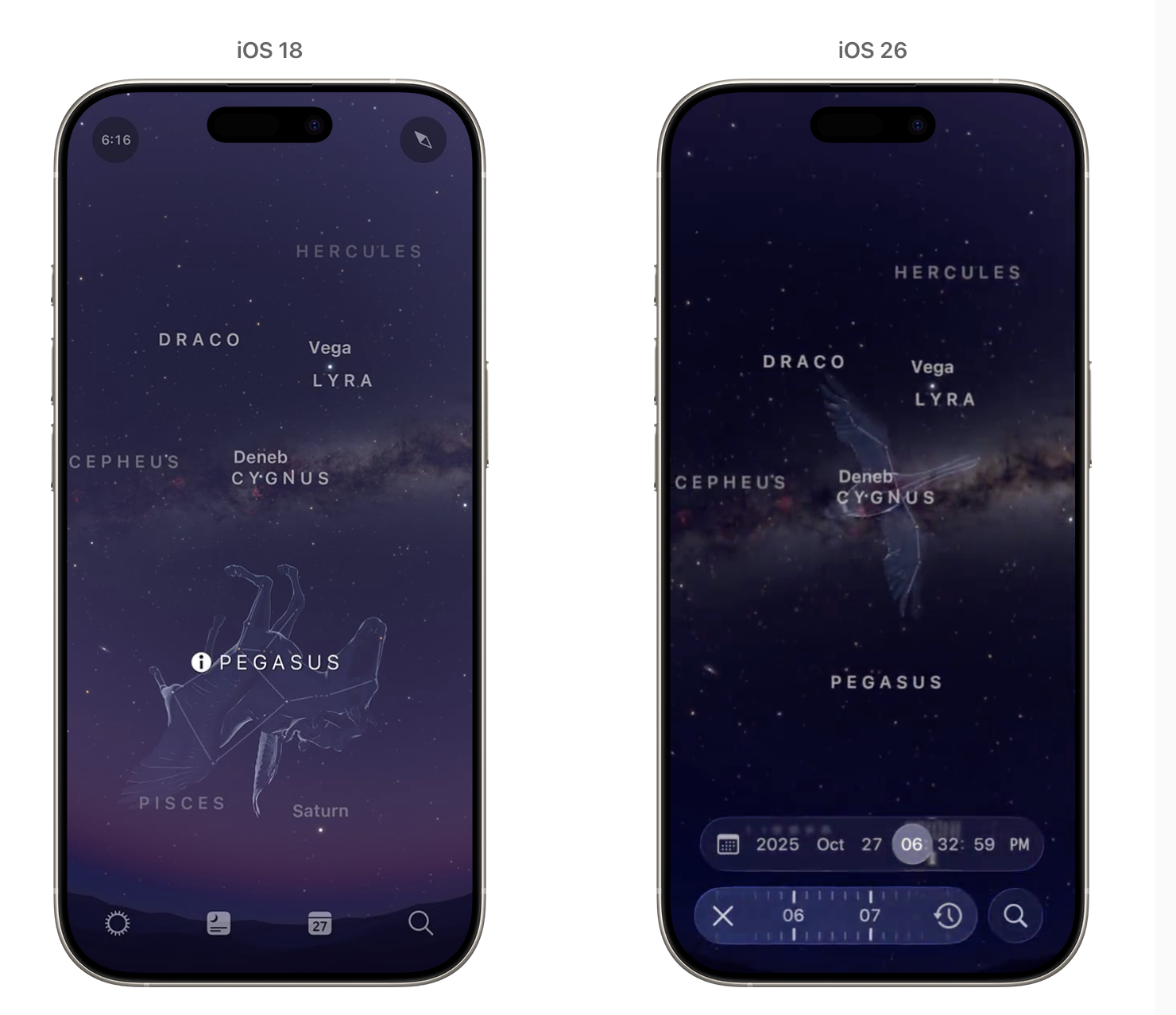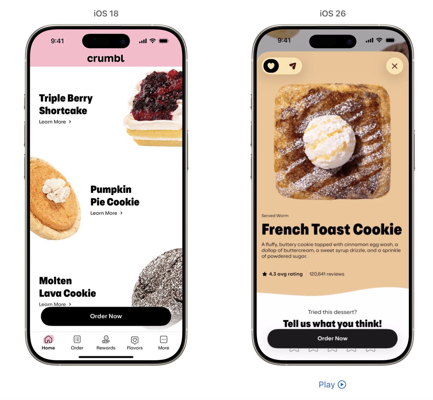 V galerii Apple ukazuje, jak aplikace v iOS 18 vypadaly dříve, a porovnává je s jejich současnou podobou v iOS 26. Vývojáři přecházejí například od klasických spodních navigačních lišt k minimalistickým ovládacím prvkům. Používají nové „Liquid Glass“ posuvníky, tlačítka a kontextová okna typu popover. Ukázky zahrnují aplikace pro iPhone, iPad, Apple Watch i Mac. Mezi vystavenými příklady jsou populární tituly jako Crumbl, Tide Guide, Lumy, Sky Guide, Linearity Curve, Photoroom, OmniFocus 4, CNN, či Lucid Motors. Apple na svém webu zdůrazňuje, že „Liquid Glass“ není jen o vzhledu, ale o přirozené interakci mezi uživatelem a rozhraním. Vizuální změny mají podporovat přehlednost, snížit vizuální zátěž a zároveň zvýraznit klíčové informace. Galerie s ukázkami je dostupná přímo na webu Apple Developer.