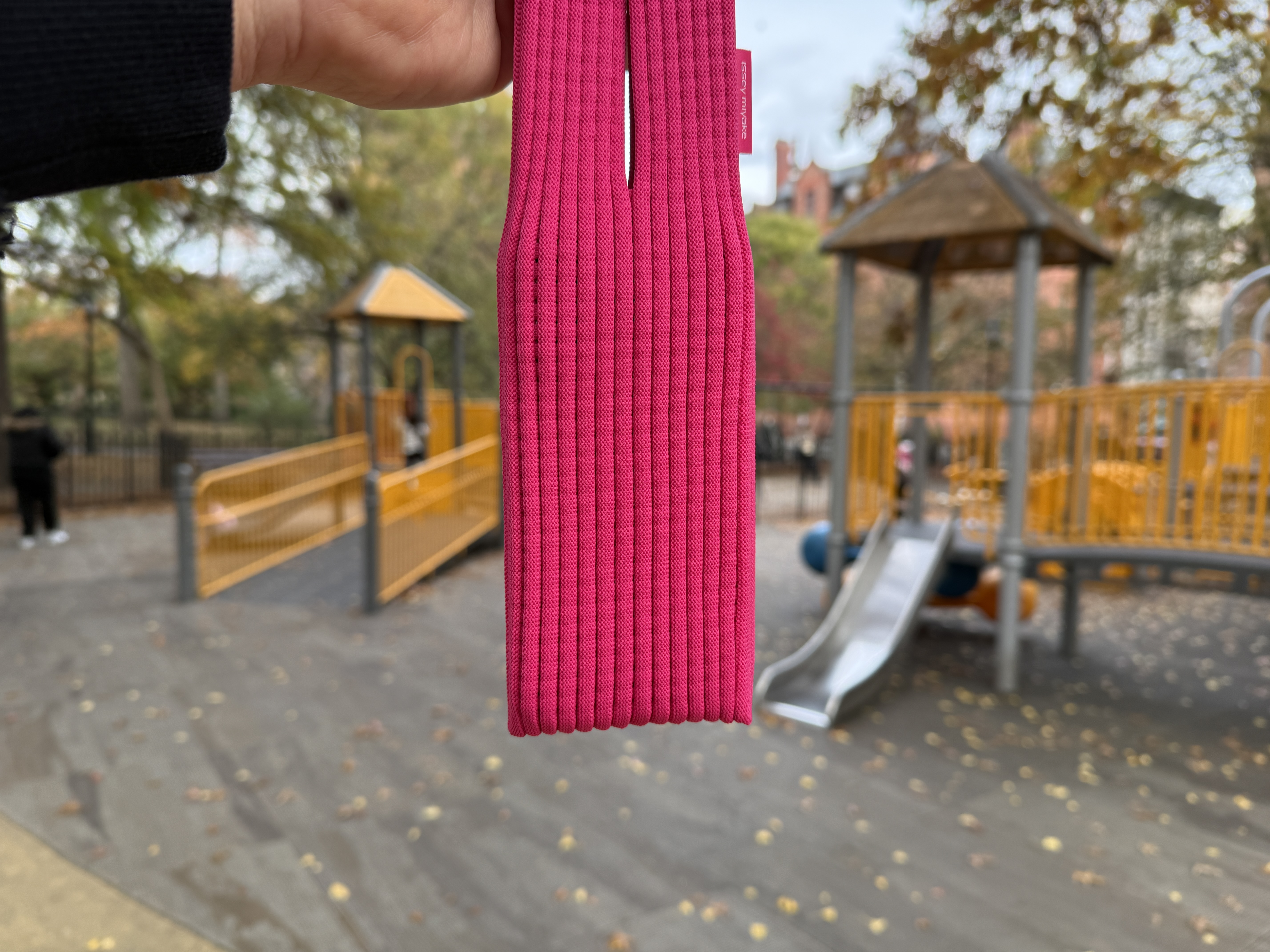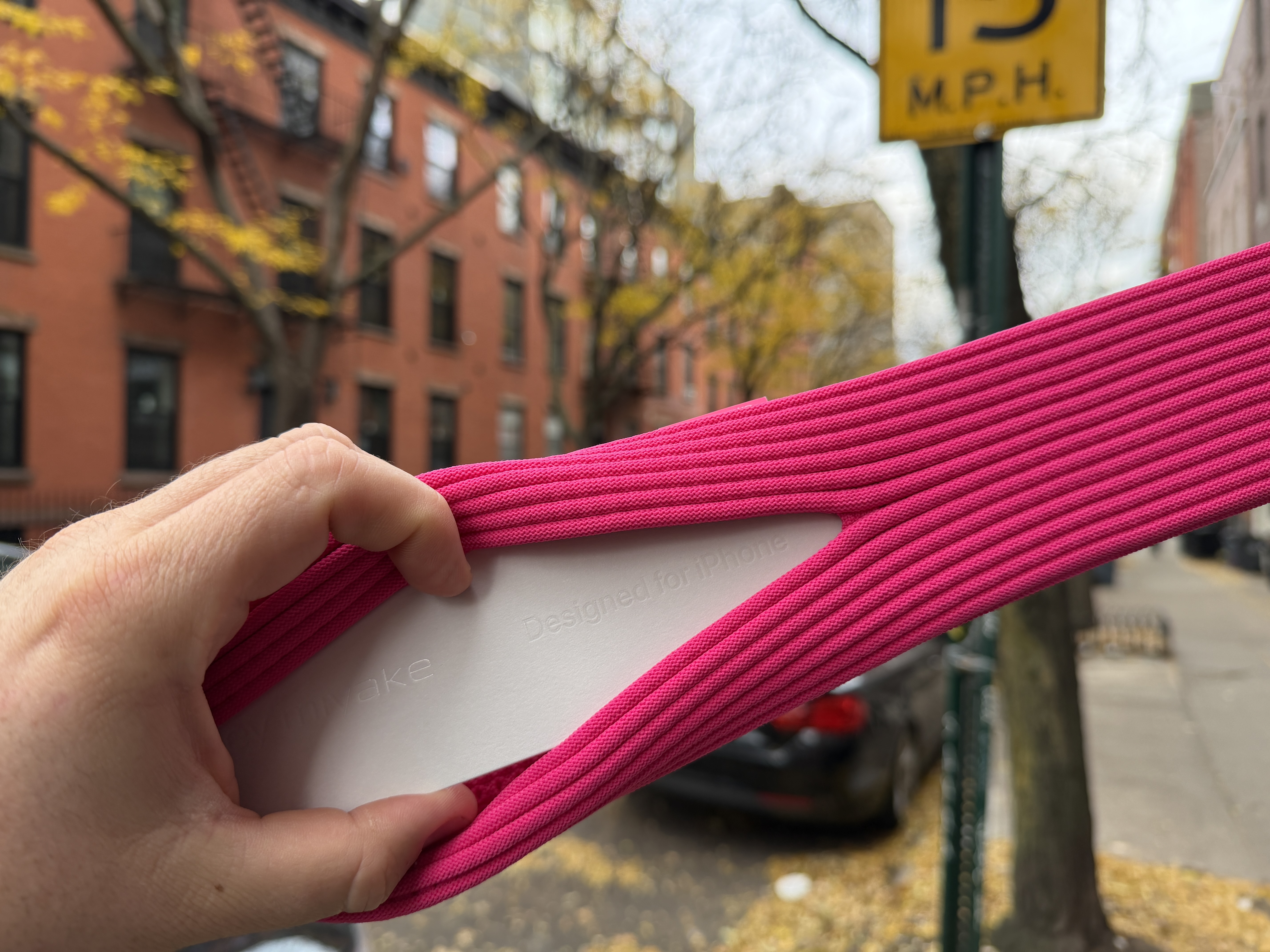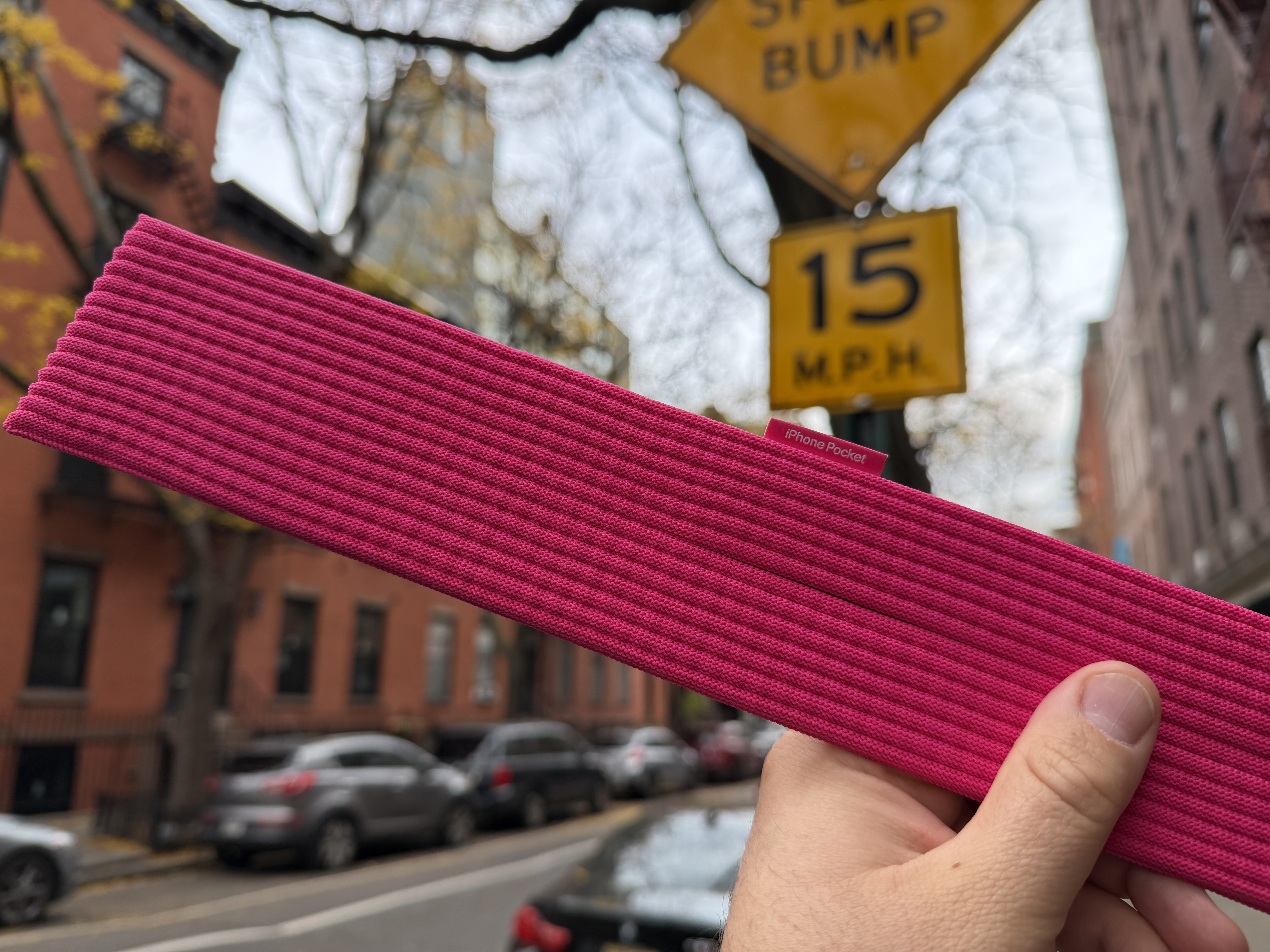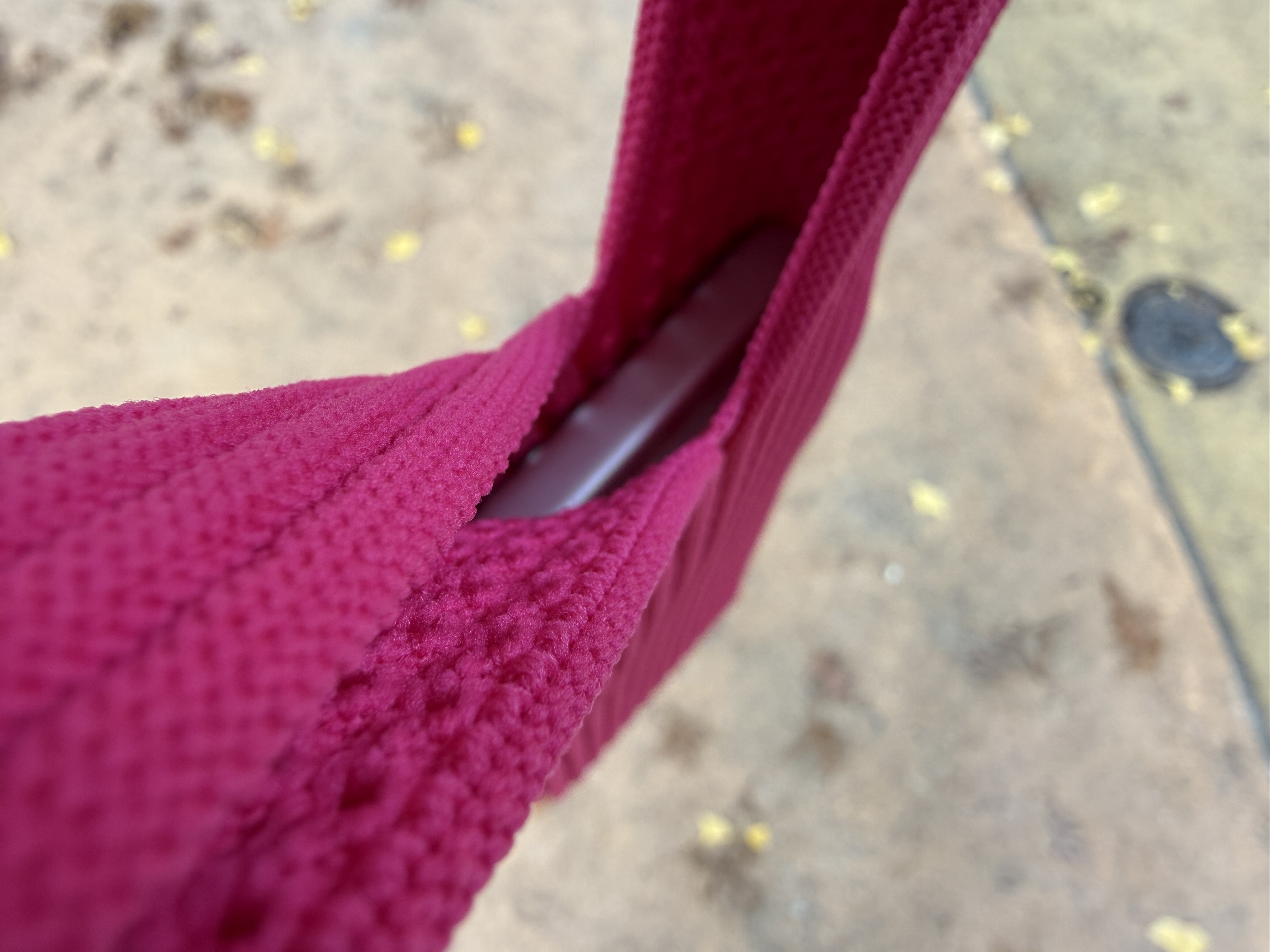 Bavit se o kvalitě zpracování je zbytečné, pokud se podíváte na fotografie, hned na první pohled vám musí být jasné, že zde se bavíme o kvalitní hi-tech tkanině, která patří mezi to nejlepší, co textilní průmysl dokáže v dnešní době vyprodukovat. Četl jsem posměšky o tom, jak se jedná o kus hadru a podobně, ale zde se jedná naopak o to nejlepší, co lze vyrobit. Celý iPhone Pocket je vyrobený pomocí 3D pletené konstrukce, která dokáže pojmout nejen iPhone, ale klidně i klíče, AirPody a peněženku, a to díky tomu, že ji můžete velmi jednoduše roztáhnout. Látka se však stále stahuje, proto obepne dokonale cokoli, co do této kapsičky dáte, a je jedno, co to bude. Zároveň, díky smršťování látky, nemusíte mít obavu, že by vám telefon nebo cokoli dalšího jednoduše vypadlo, a i když jsme měli ze začátku obavy, po pár minutách jsme zjistili, že je prakticky nemožné, aby telefon z kapsičky vypadl, aniž byste to chtěli. Látka je velmi příjemná na dotek a zajímavé na ní je to, že pokud je kapsička prázdná, prakticky vypadá pouze jako kus látky, bez toho, aniž by byla vidět ona kapsa nebo naopak poutko, za které je možné ji připnout prakticky kamkoli vás napadne. Jednoduše provléknete kolem smyčky samotnou kapsičku s telefonem a můžete ji pověsit kamkoli chcete, ať už je to kabelka, řídítka kola, kočárek, zápěstí nebo cokoli, co vás jen napadne.