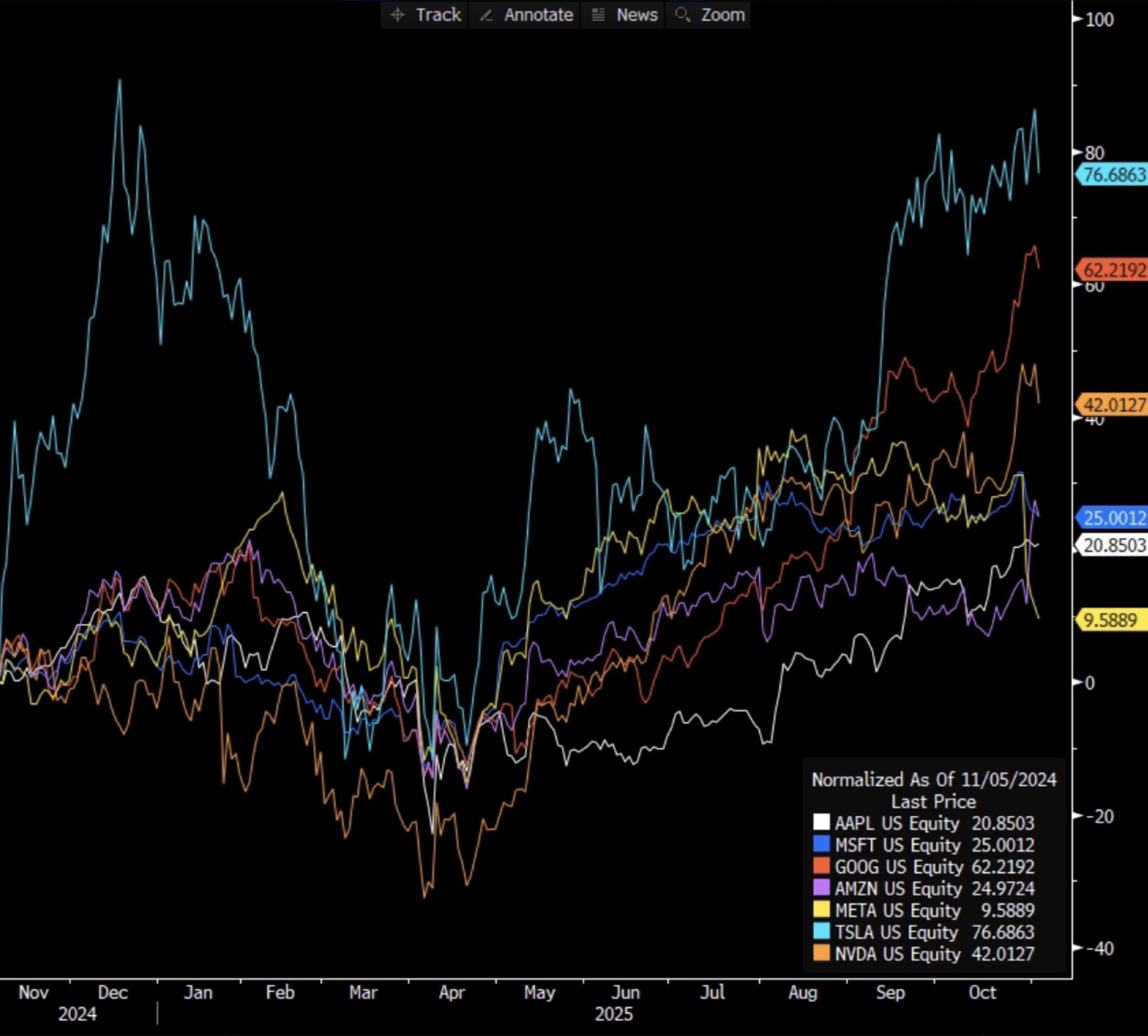 Tisková zpráva: Výsledková sezóna je téměř za námi a své hospodářské výsledky, s výjimkou Nvidie, už zveřejnily všechny velké technologické společnosti. Také tentokrát platí, že všechny firmy kromě Tesly dosáhly za minulý kvartál velmi dobrých výsledků. Zhodnocení akcií skupiny Magnificent 7 za poslední rok můžete vidět na obrázku níže. Bez započítání dividend se zhodnocení akcií pohybuje mezi 10 a 77 %. Právě na výsledky těchto velkých technologických firem se podívali Tomáš Vranka, Jarda Brychta a Marek Nemky v rámci posledního dílu pořadu Povídání o trzích od XTB.