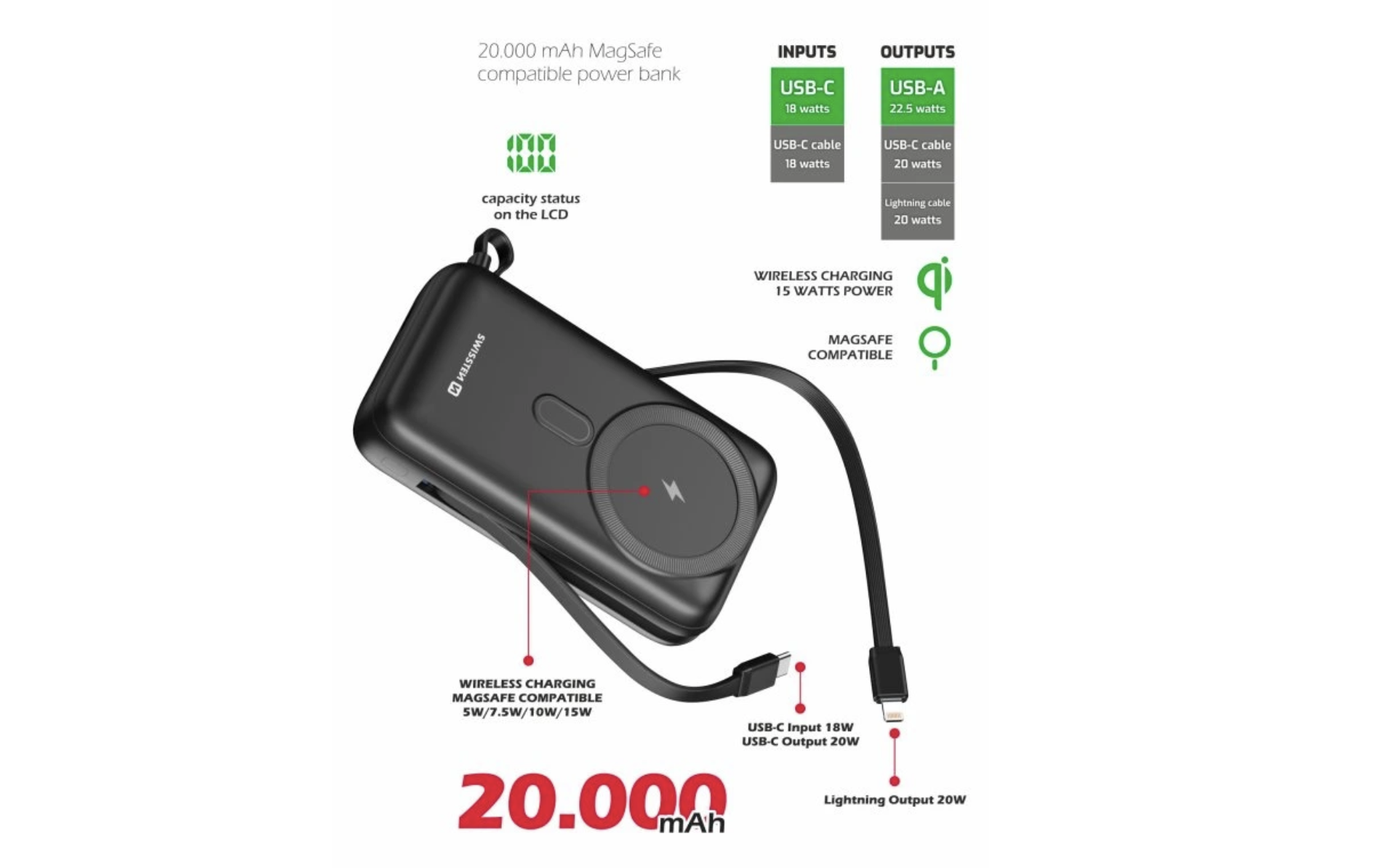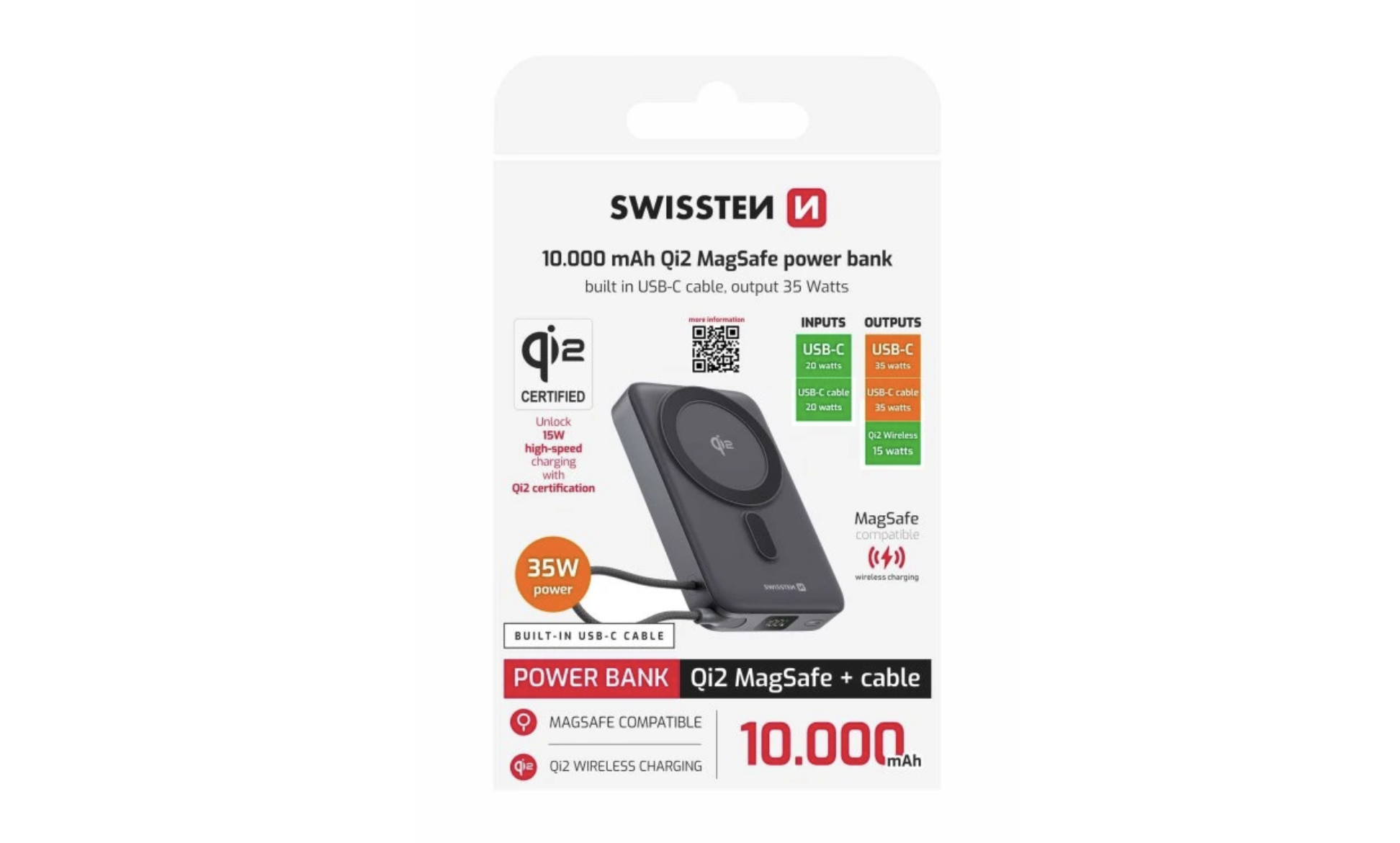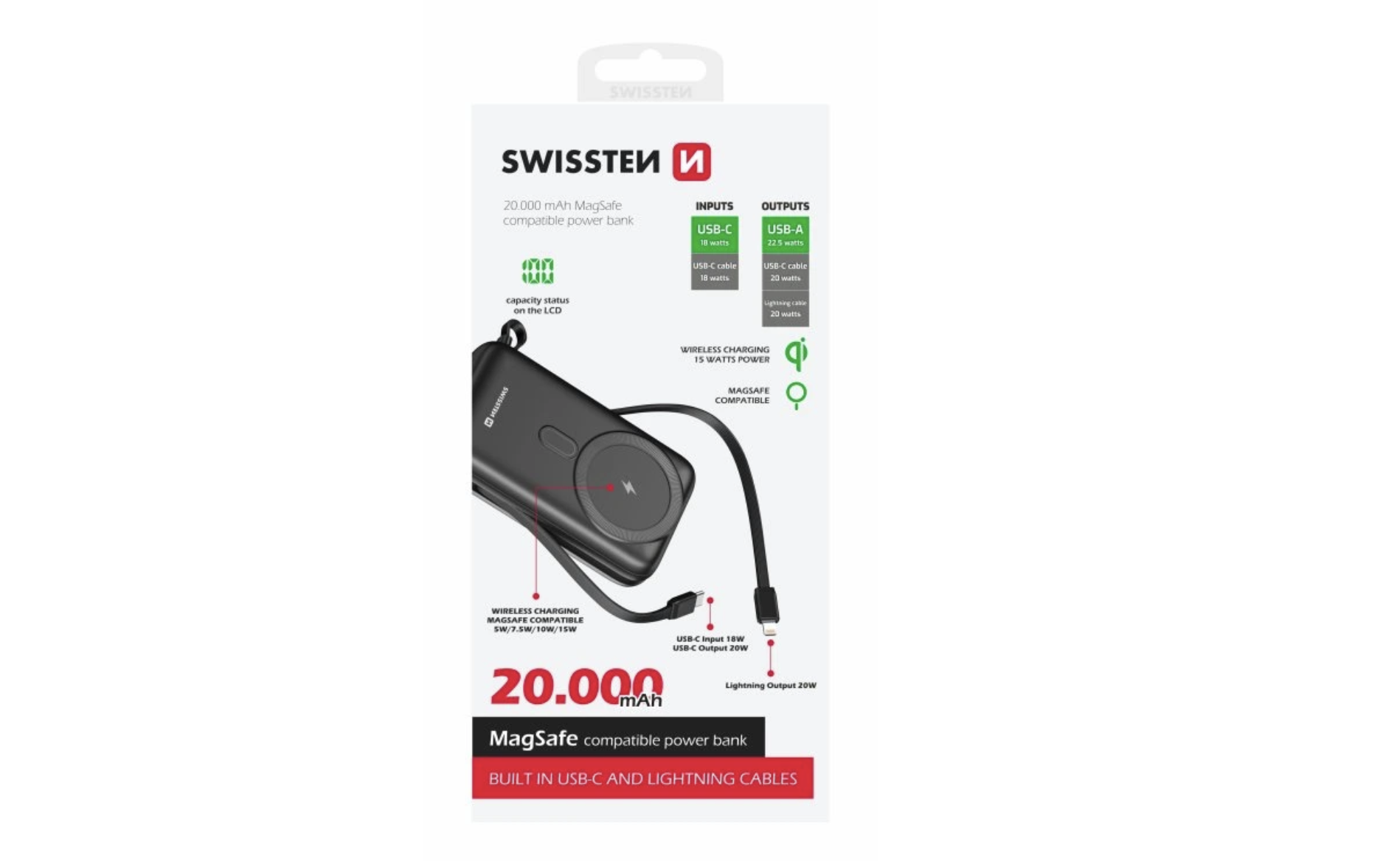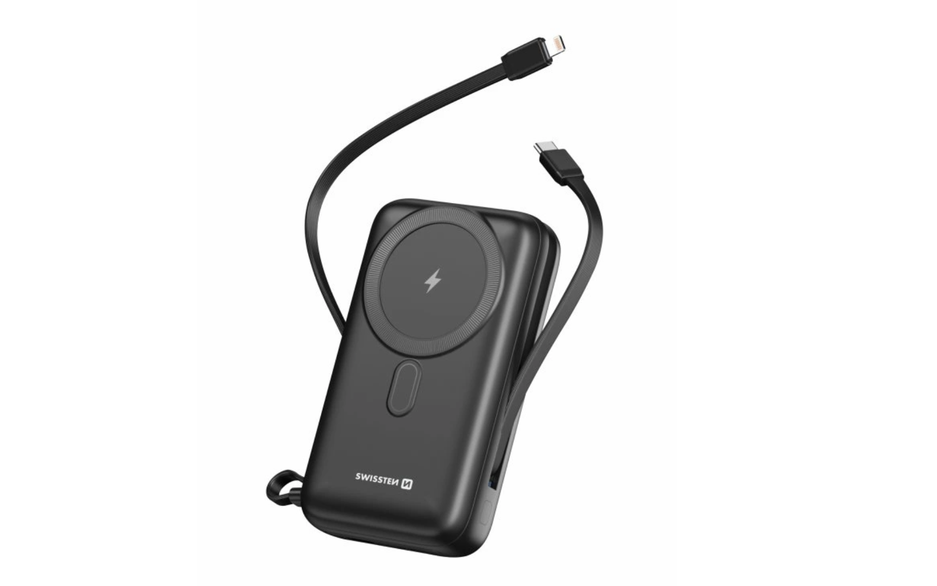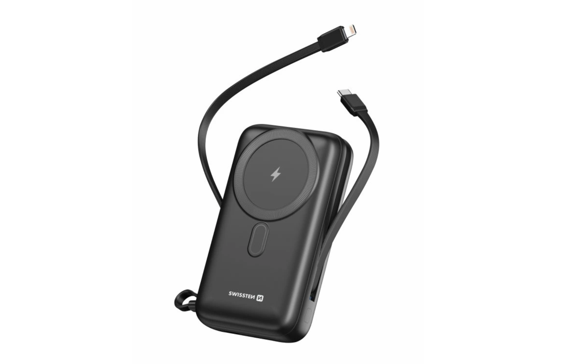 Další varianta powerbanky Swissten s kapacitou 20 000 mAh přináší kombinaci bezdrátového nabíjení, integrovaných kabelů a praktické konstrukce. Nabízí kabely USB-C i Lightning, takže snadno nabijete zařízení různých značek. Podpora Qi a MagSafe umožňuje pohodlné bezdrátové nabíjení, přičemž magnetické vystředění zajišťuje stabilitu. Díky více výstupům můžete nabíjet současně více zařízení. Tento model je skvělým společníkem na cestách i v běžném provozu. Cena je 1099 korun.