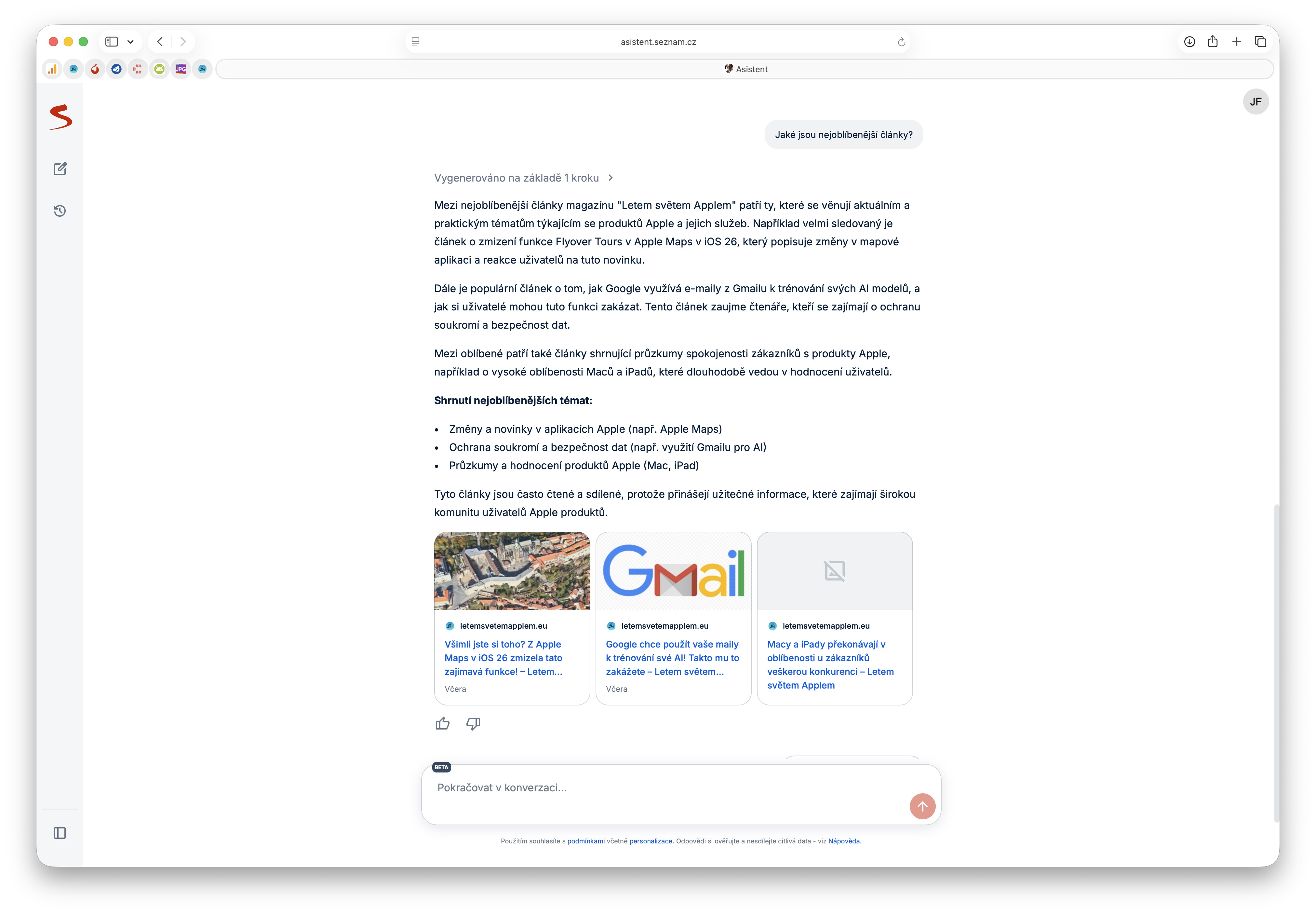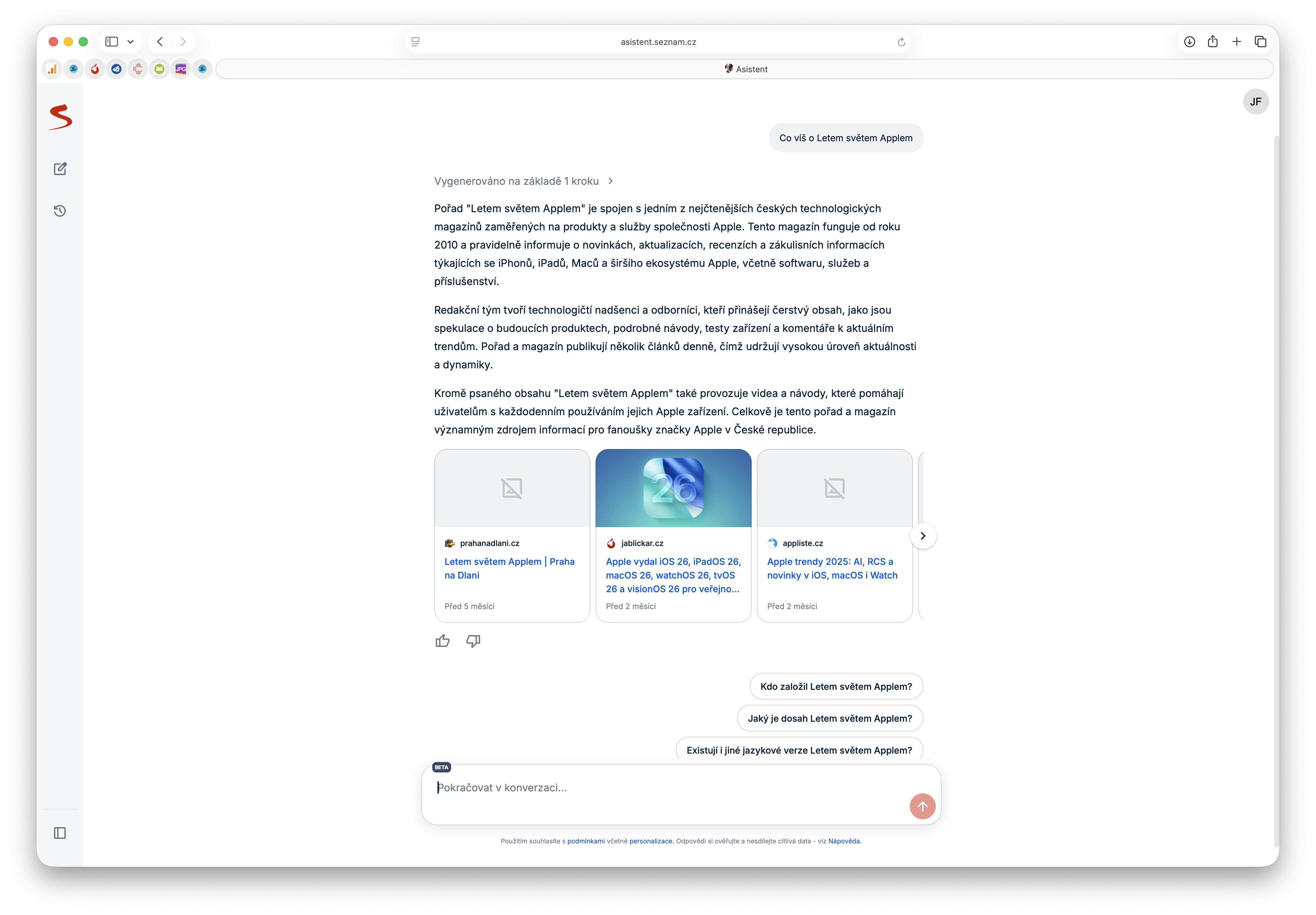 Cíl Seznamu je jednoduchý – konkrétně ušetřit váš čas. Asistent má pochopit zadání, projít relevantní informace a předložit přehlednou odpověď, která nebude jen rychlá, ale hlavně použitelná. Jak potvrzuje i Radoslav Mikeš ze Seznamu, současná verze se zaměřuje především na orientaci ve velkém množství obsahu a zpravodajství. Do budoucna ale počítá s integrací do nákupních služeb, porovnávání produktů i propojení s oborovými weby. Výsledkem by měla být vstupní brána ke všemu důležitému na Seznamu bez zbytečného přeskakování mezi službami.