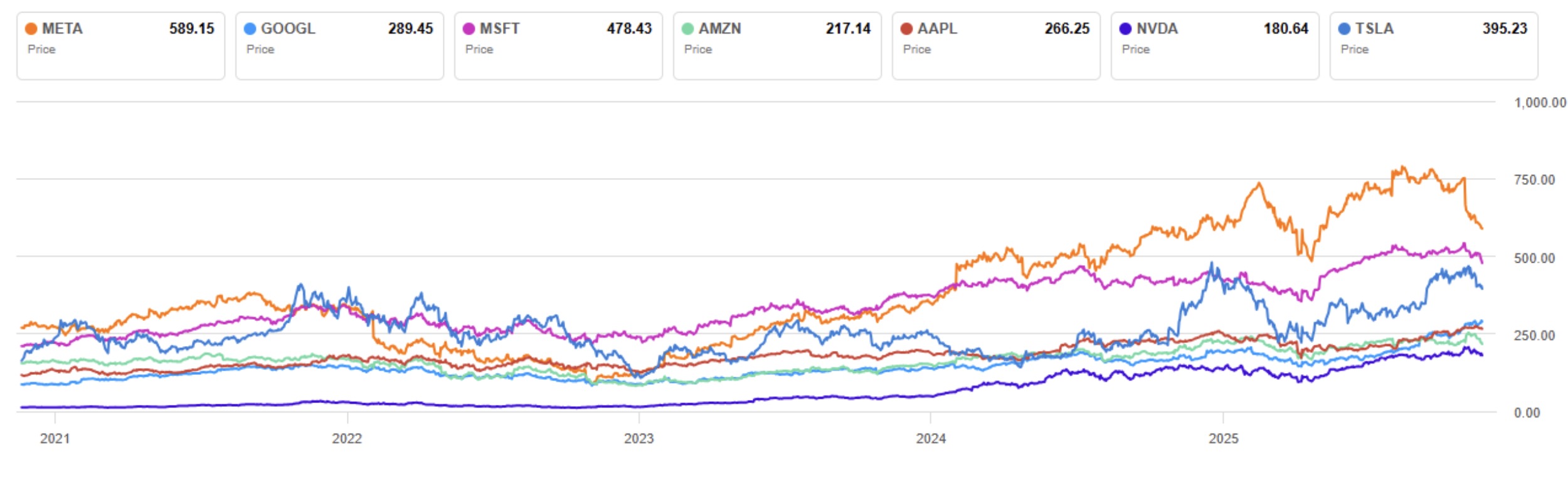 Výkonnost akcií Magnificent 7 za posledních 5 let. Zdroj: seekingalpha.com. Minulá výkonnost není spolehlivým ukazatelem budoucí výkonnosti.