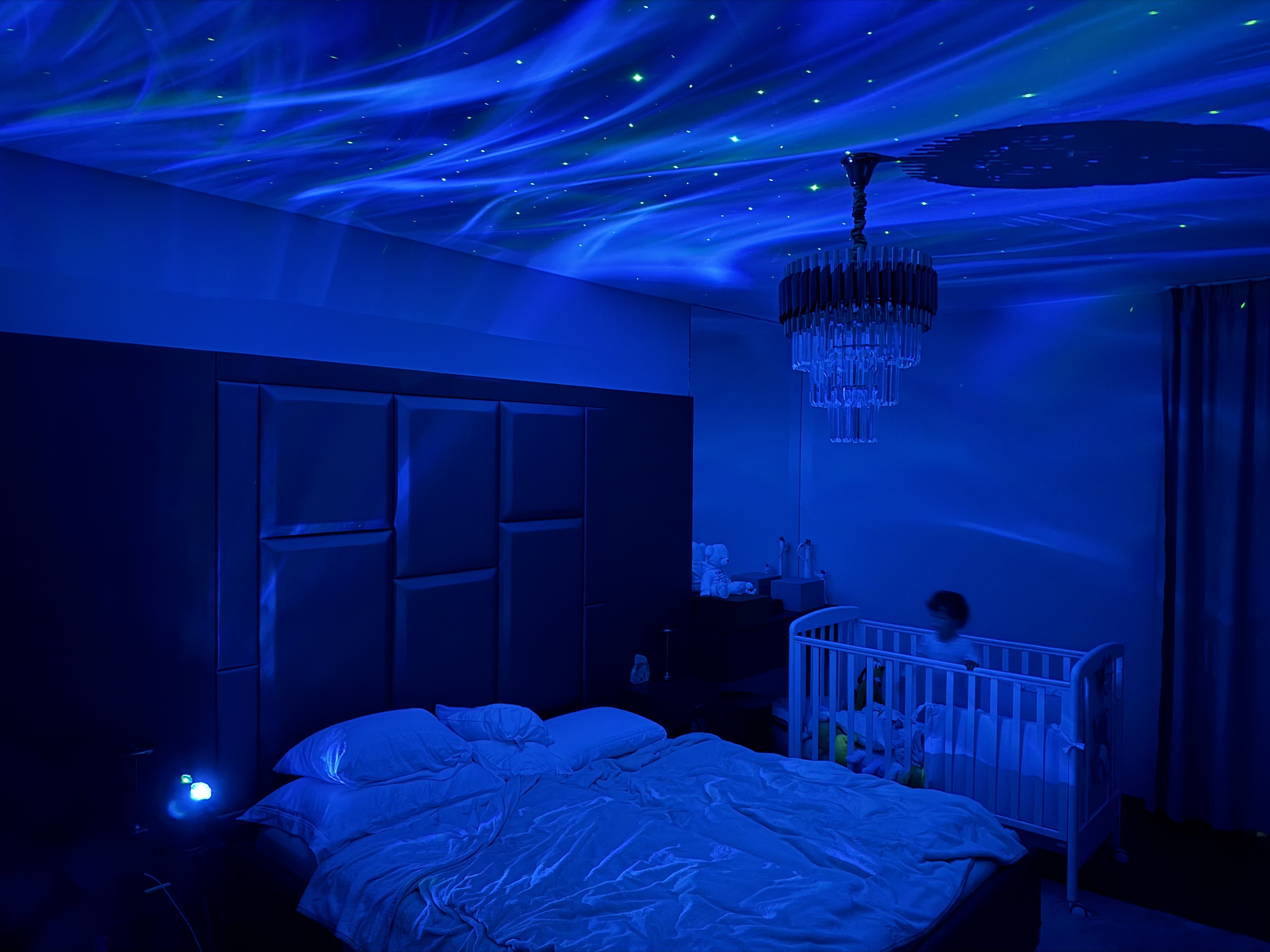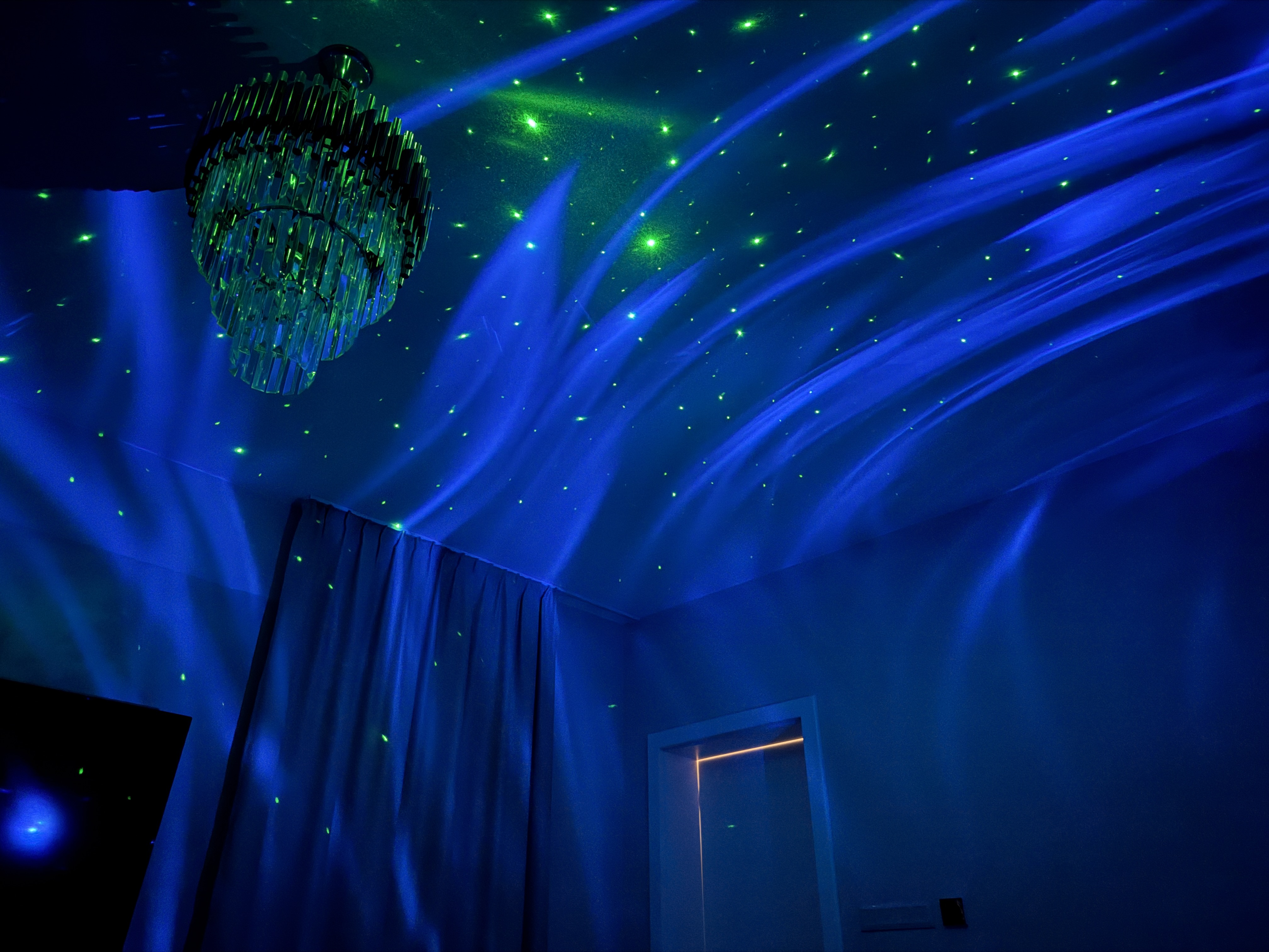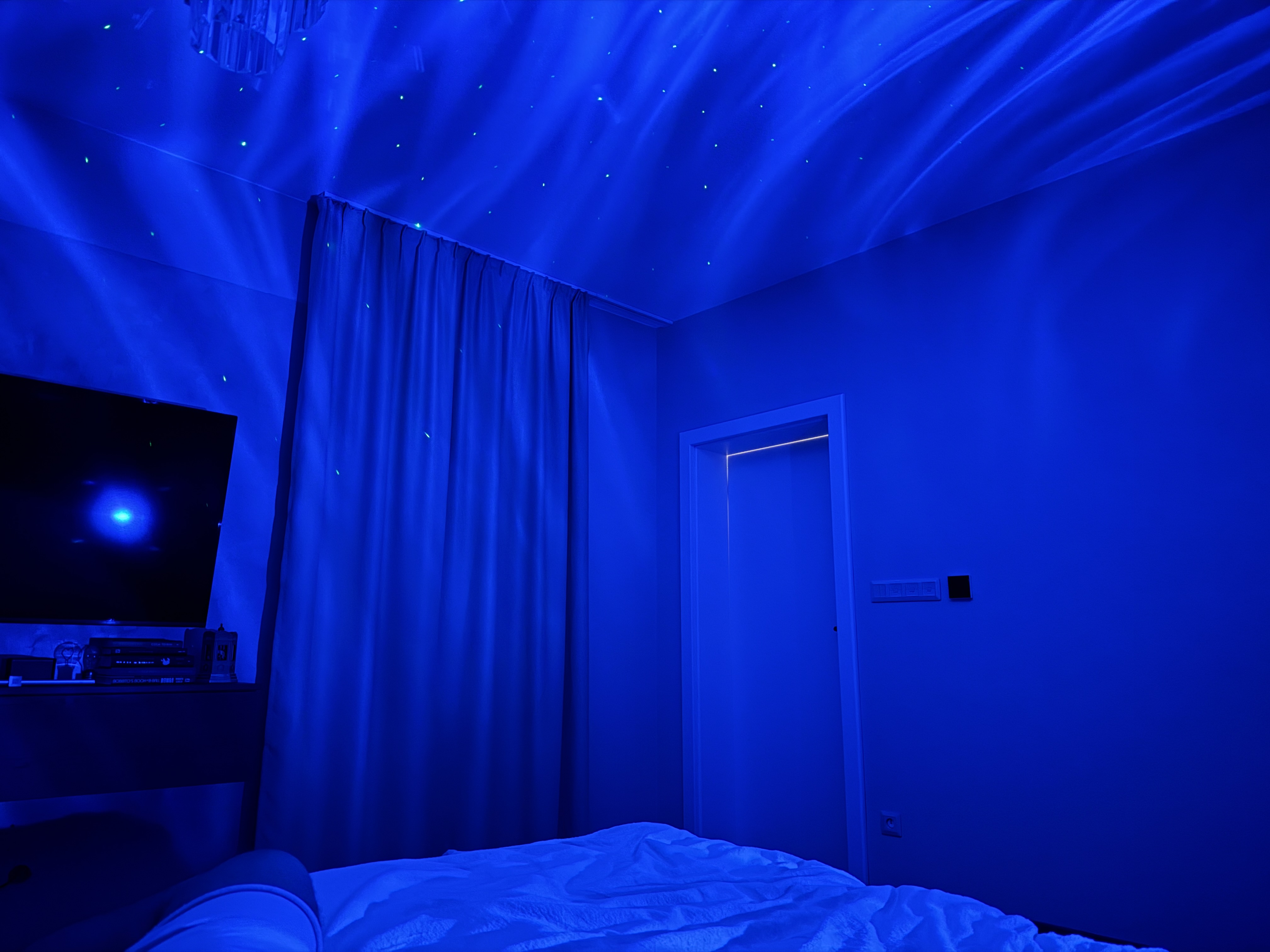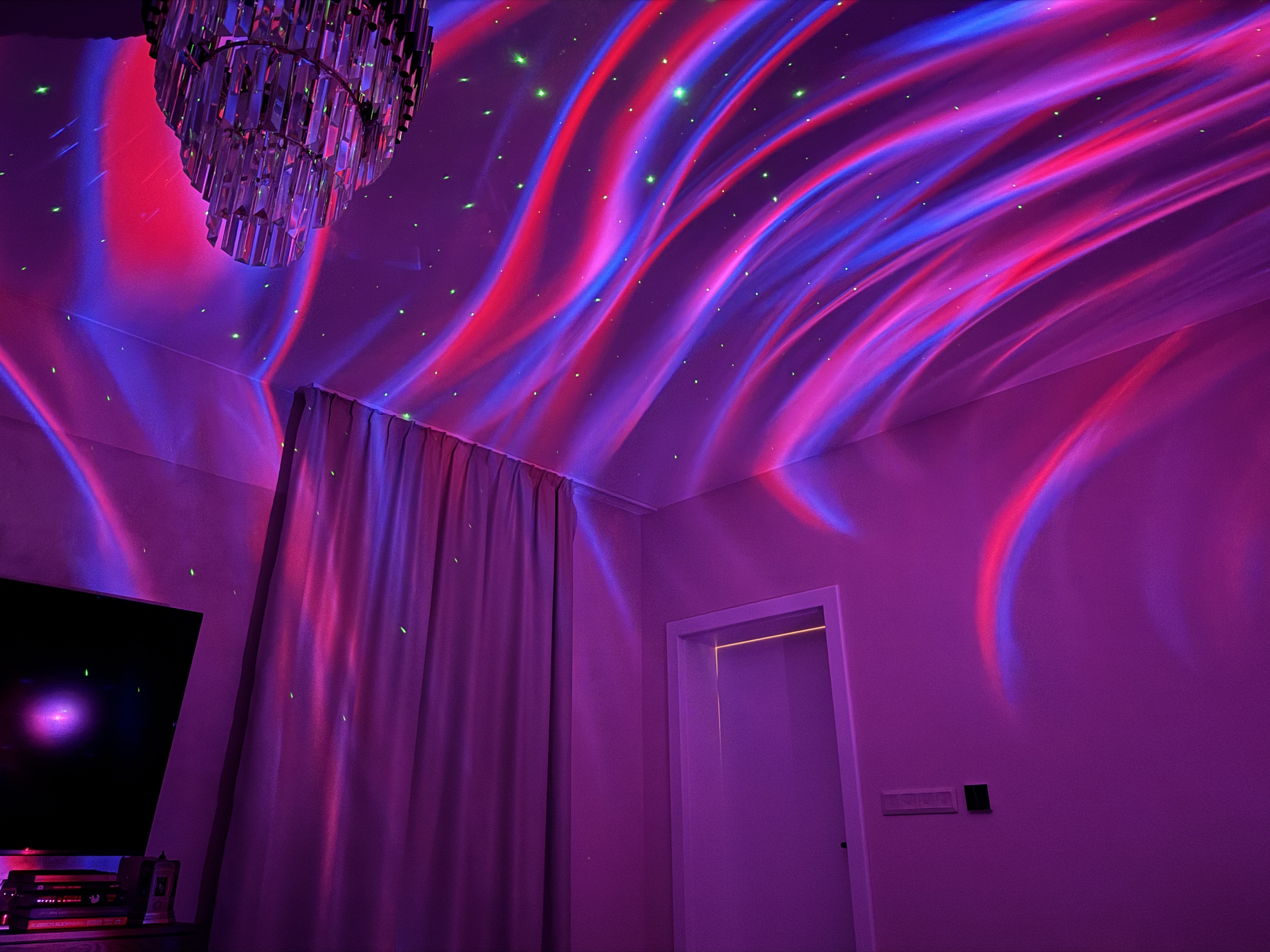 Hlavním lákadlem projektoru je samozřejmě světelná show. Projektor dokáže na strop či stěnu promítat hvězdnou oblohu s dynamickými efekty, mlhovinami a barevnými přechody. Na rozdíl od levnějších no-name produktů z e-shopů působí výsledný efekt velmi realisticky a příjemně, žádné křiklavé barvy nebo agresivní přechody, ale jemná, uklidňující projekce. K dispozici je celá řada režimů, které můžete měnit podle nálady, od relaxačních pastelových kombinací až po energické barevné vlny. Můžete si vždy zvolit barvy, jaké chcete použít, jak rychle se mají vlny pohybovat a jestli a jak moc mají svítiti hvězdičky. Vše pak můžete propojit do nekonečného množství kombinací, které dokáží naladit atmosféru ať už děláte zrovna cokoli vás jen napadne.