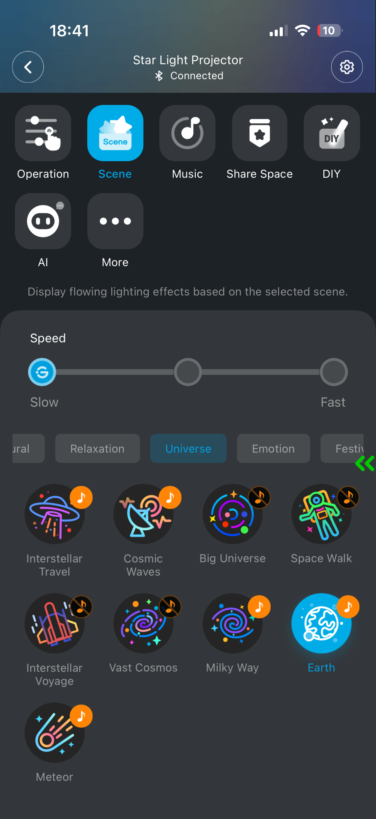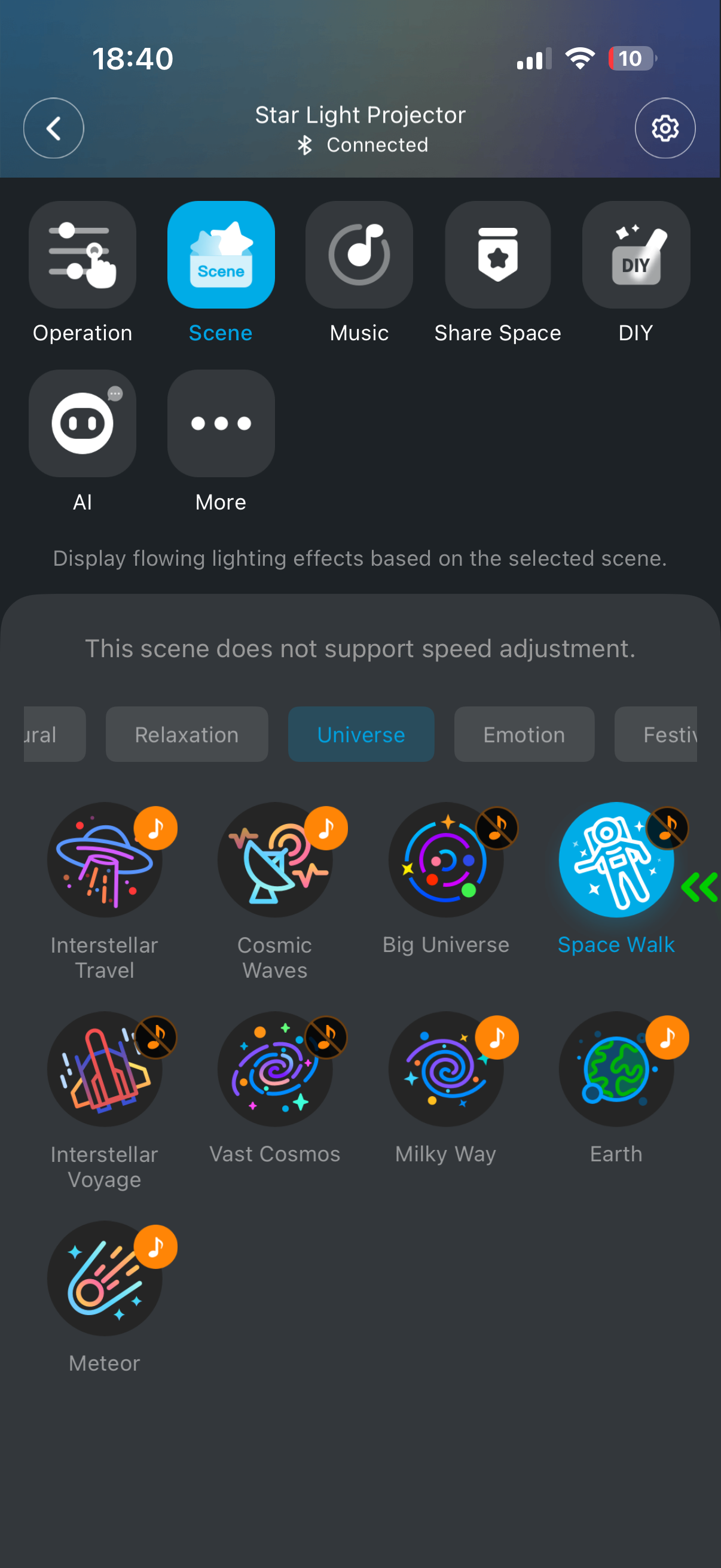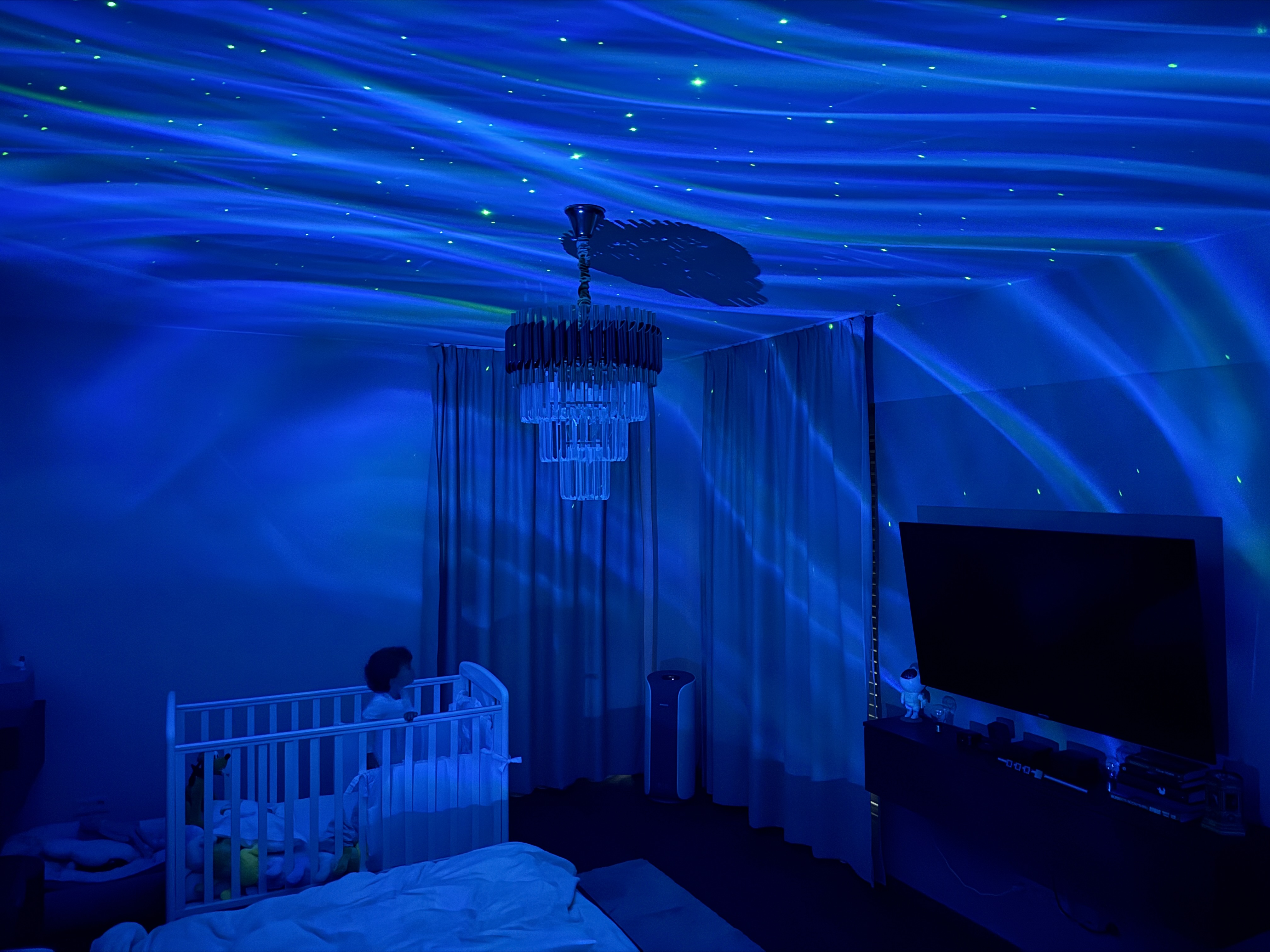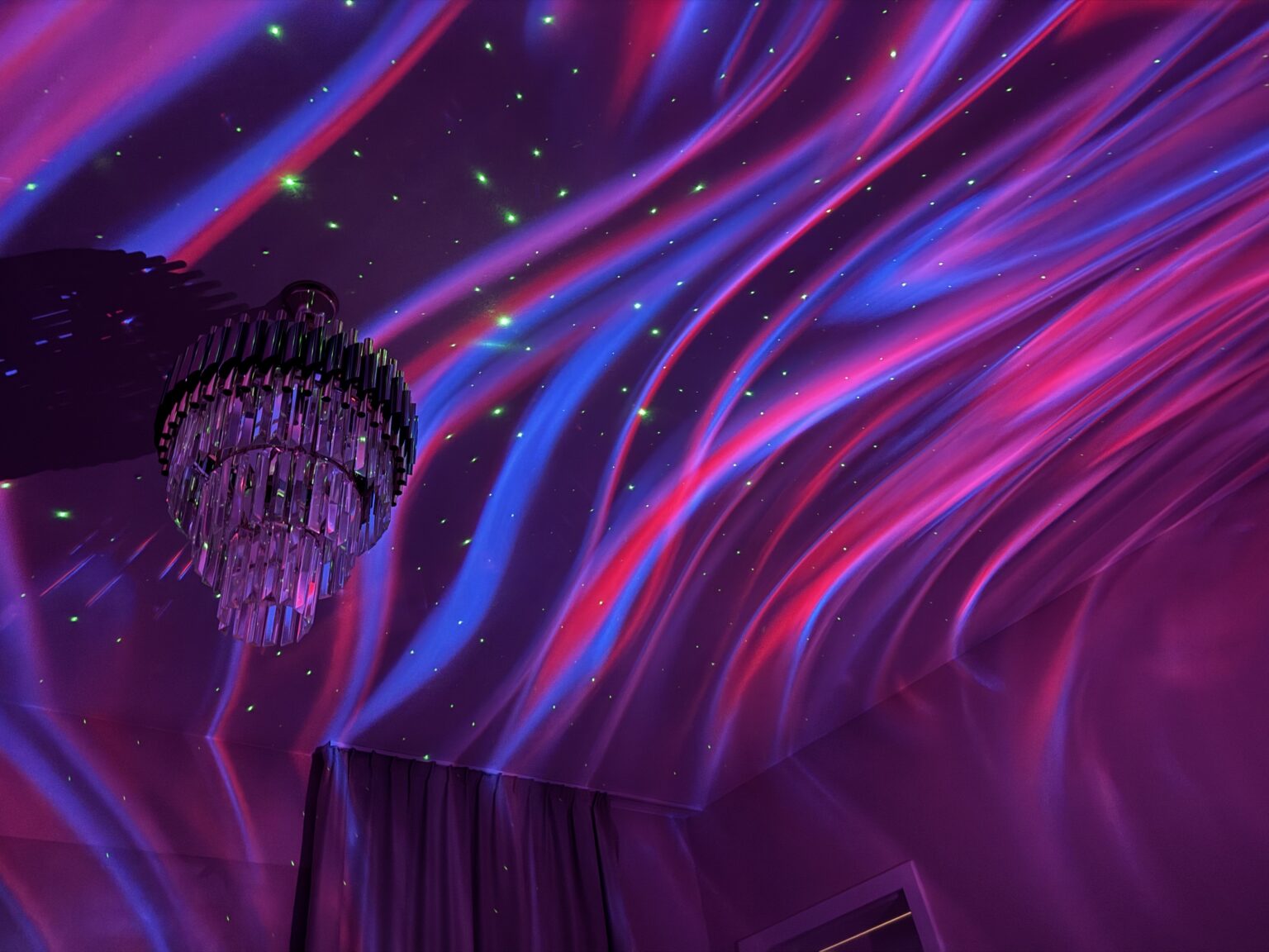 Hlavním lákadlem projektoru je samozřejmě světelná show. Projektor dokáže na strop či stěnu promítat hvězdnou oblohu s dynamickými efekty, mlhovinami a barevnými přechody. Na rozdíl od levnějších no-name produktů z e-shopů působí výsledný efekt velmi realisticky a příjemně, žádné křiklavé barvy nebo agresivní přechody, ale jemná, uklidňující projekce. K dispozici je celá řada režimů, které můžete měnit podle nálady, od relaxačních pastelových kombinací až po energické barevné vlny. Můžete si vždy zvolit barvy, jaké chcete použít, jak rychle se mají vlny pohybovat a jestli a jak moc mají svítiti hvězdičky. Vše pak můžete propojit do nekonečného množství kombinací, které dokáží naladit atmosféru ať už děláte zrovna cokoli vás jen napadne.