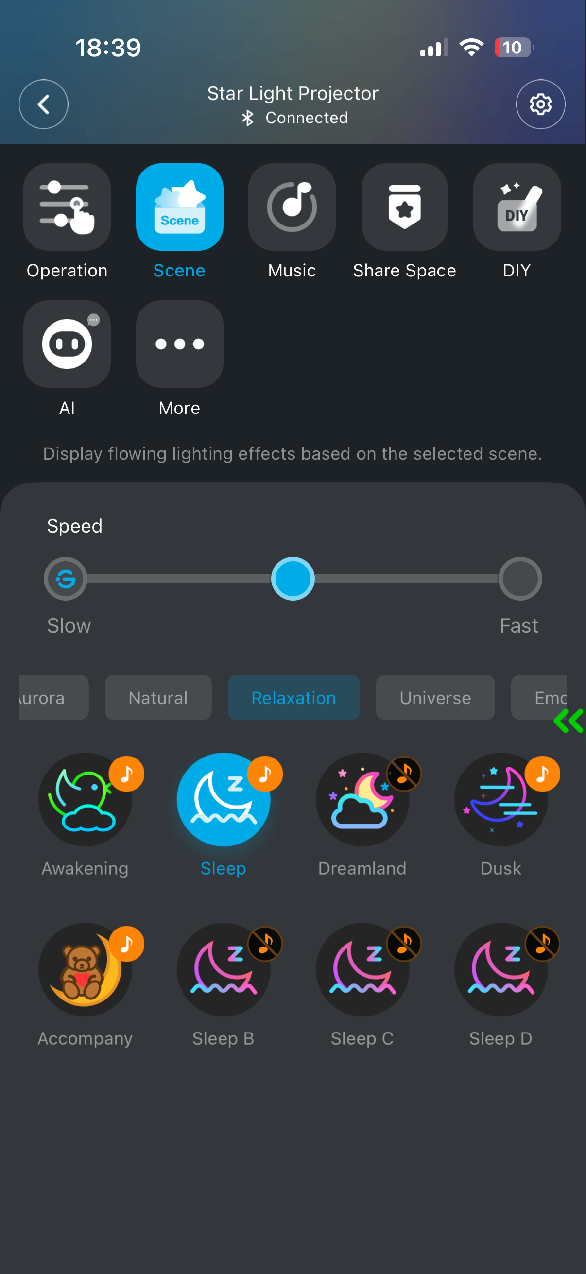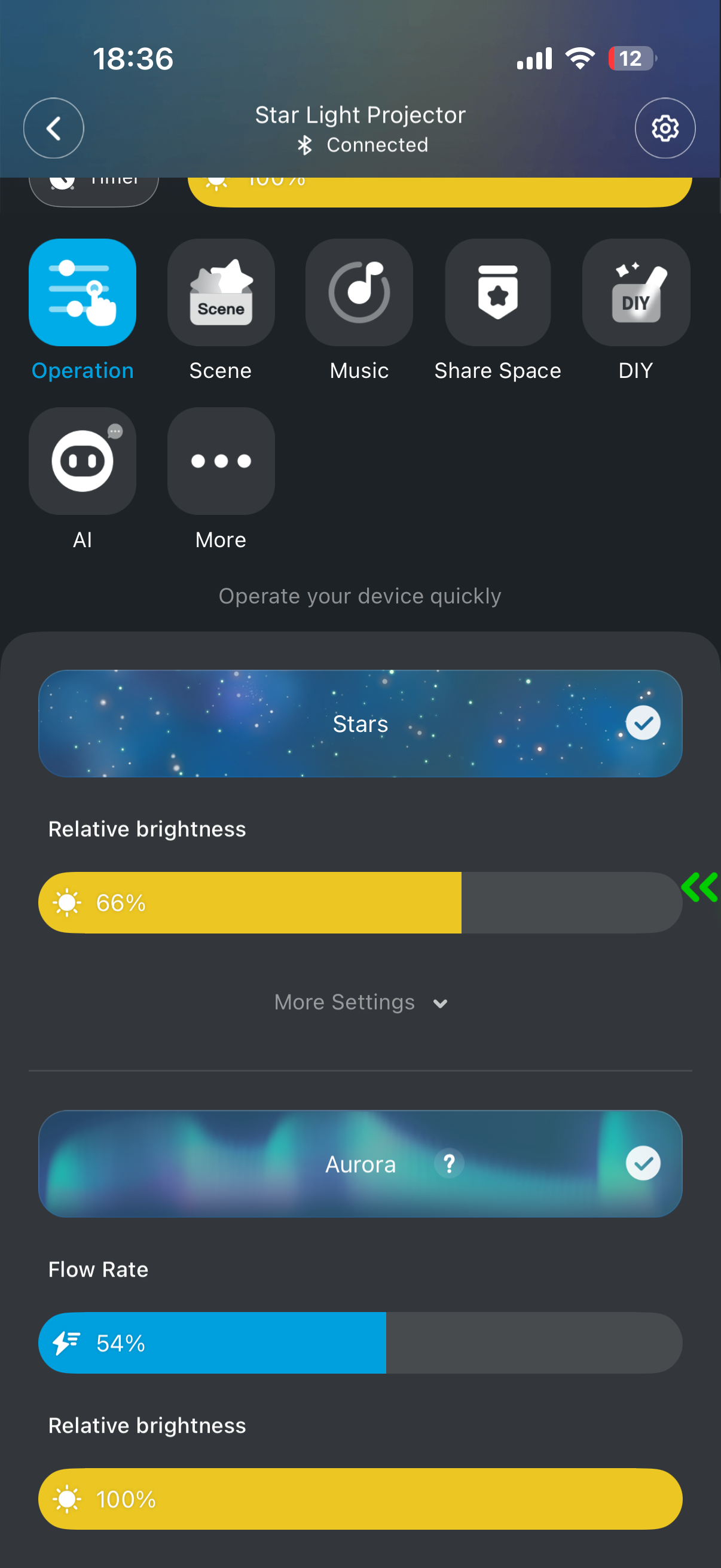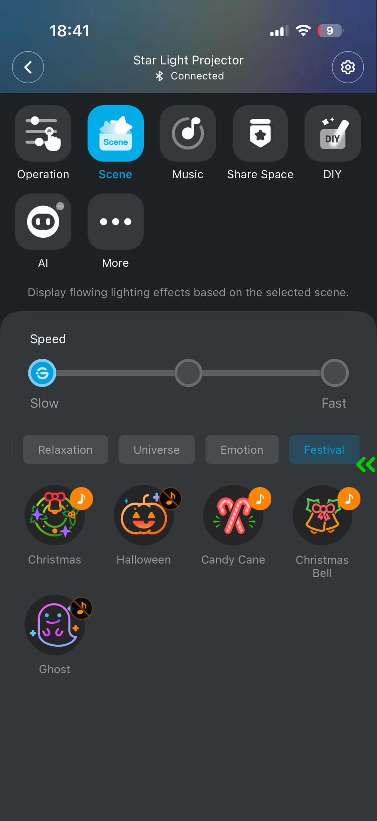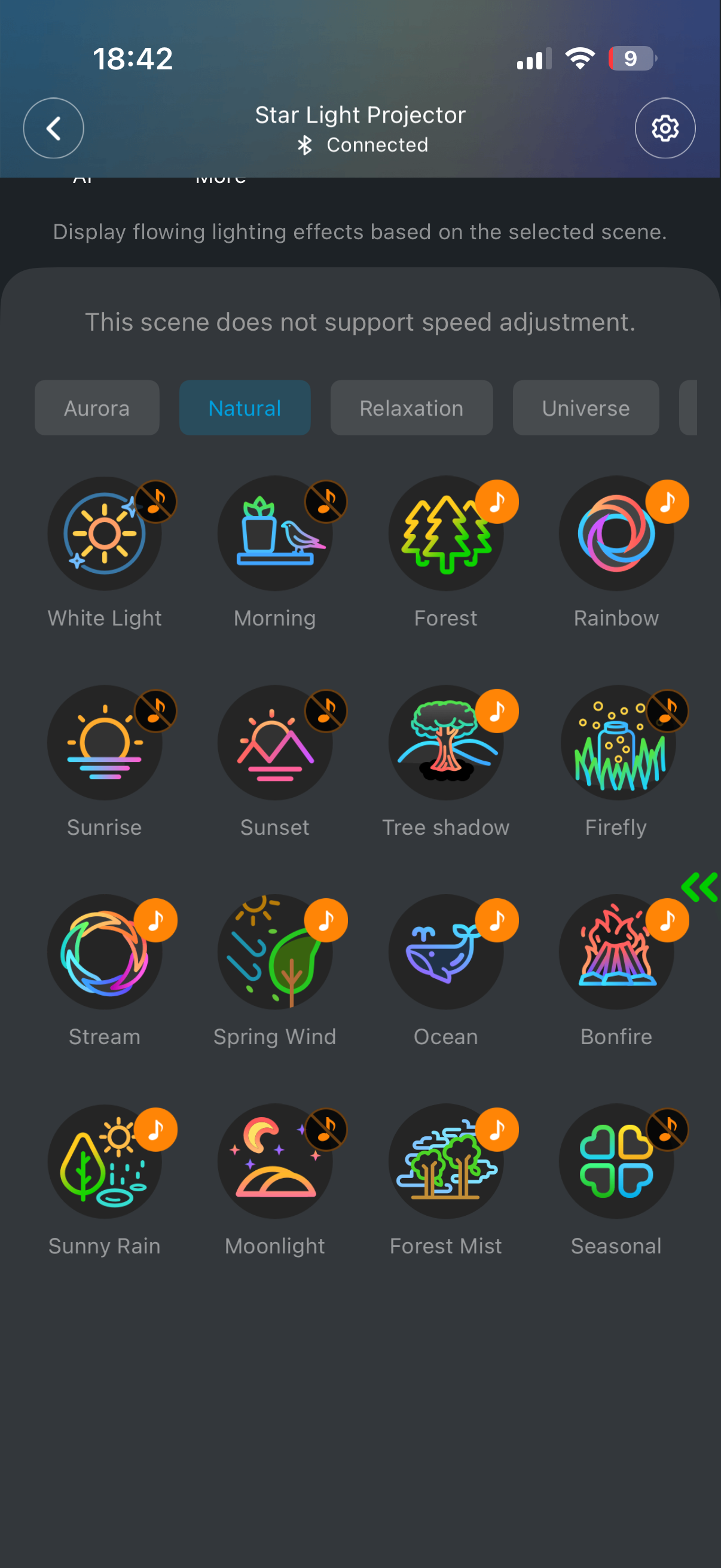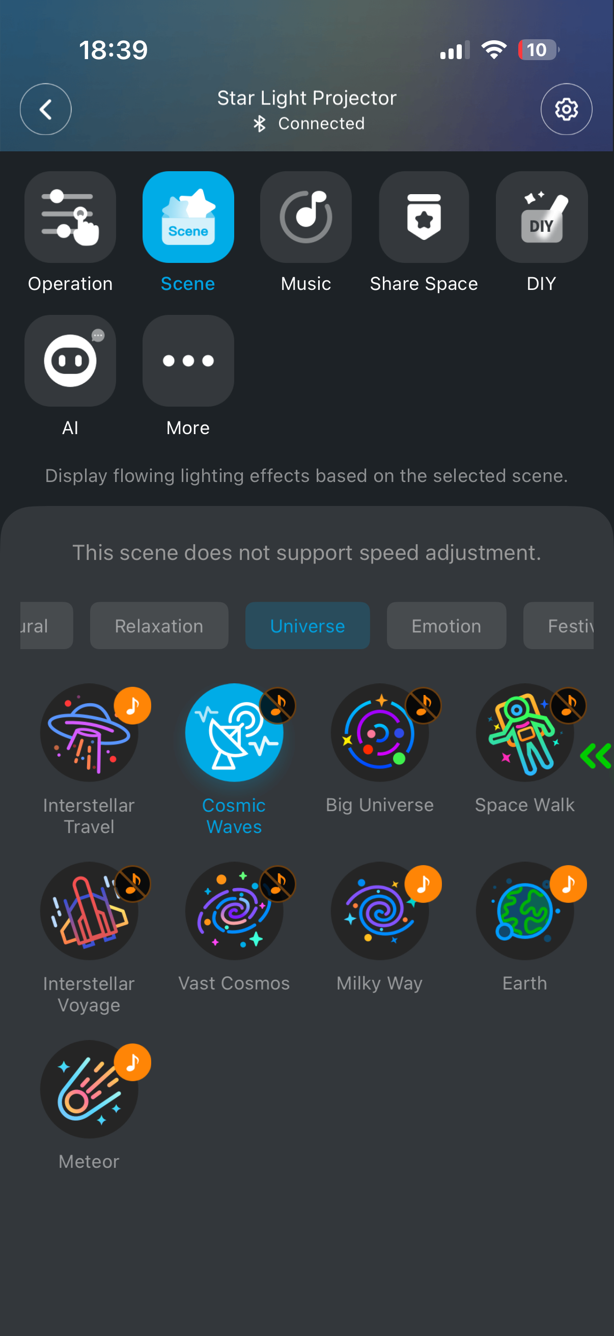 Hlavním lákadlem projektoru je samozřejmě světelná show. Projektor dokáže na strop či stěnu promítat hvězdnou oblohu s dynamickými efekty, mlhovinami a barevnými přechody. Na rozdíl od levnějších no-name produktů z e-shopů působí výsledný efekt velmi realisticky a příjemně, žádné křiklavé barvy nebo agresivní přechody, ale jemná, uklidňující projekce. K dispozici je celá řada režimů, které můžete měnit podle nálady, od relaxačních pastelových kombinací až po energické barevné vlny. Můžete si vždy zvolit barvy, jaké chcete použít, jak rychle se mají vlny pohybovat a jestli a jak moc mají svítiti hvězdičky. Vše pak můžete propojit do nekonečného množství kombinací, které dokáží naladit atmosféru ať už děláte zrovna cokoli vás jen napadne.