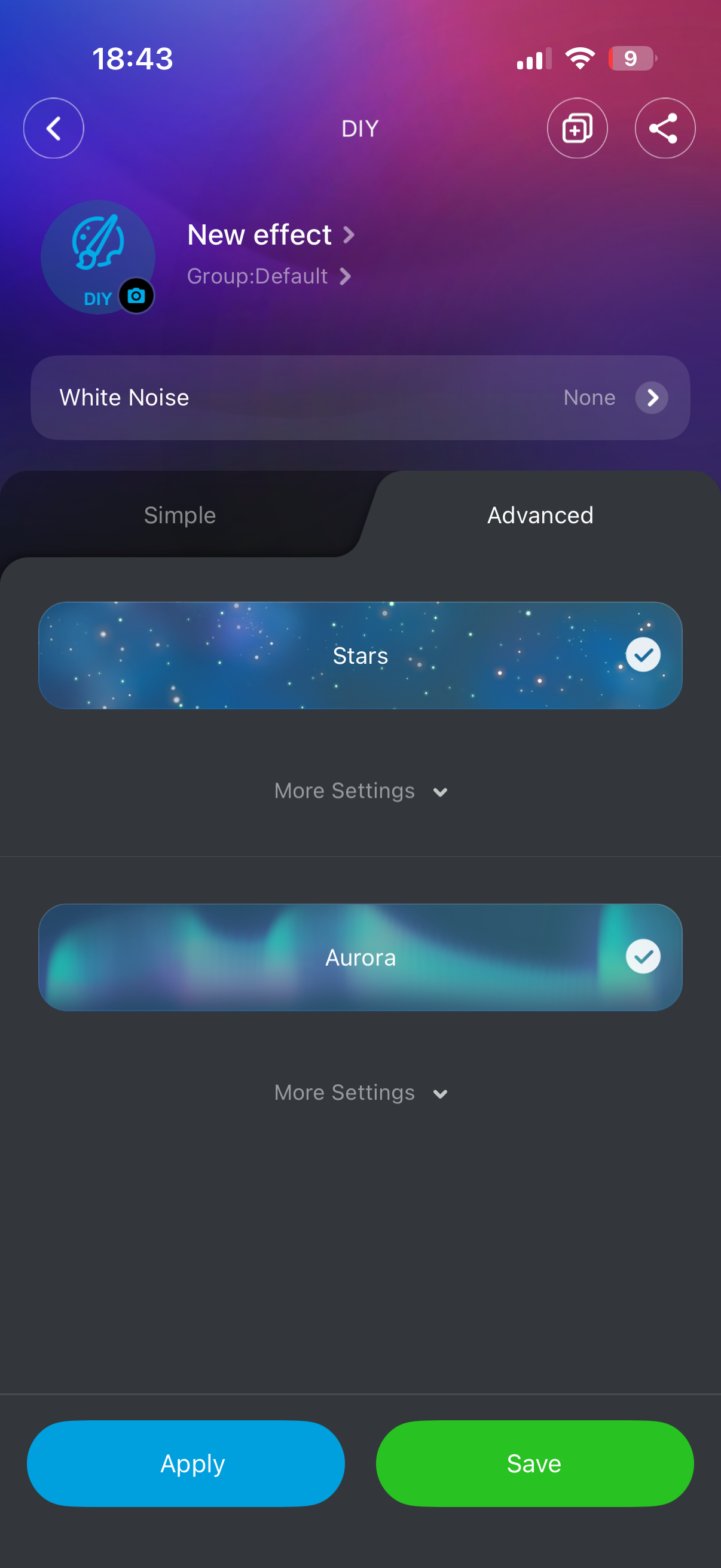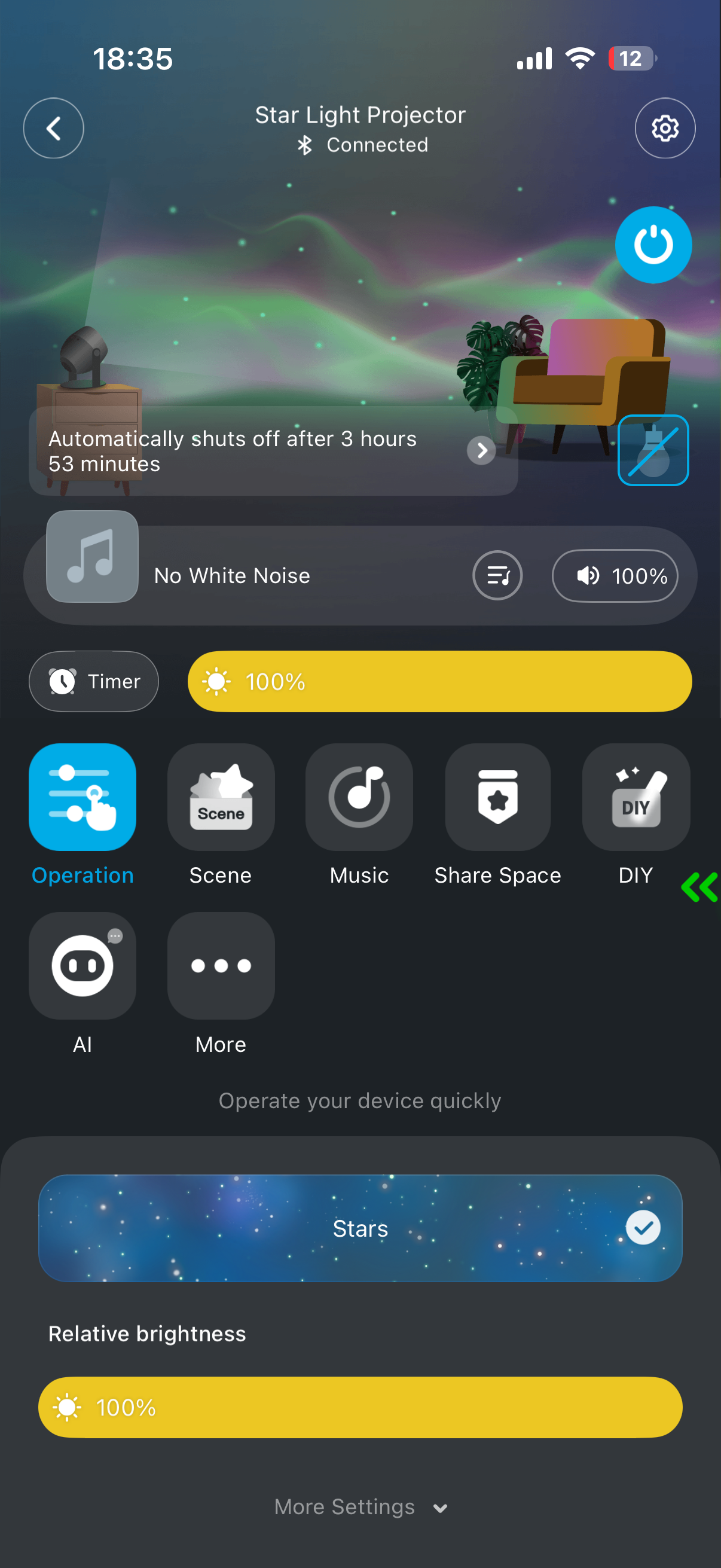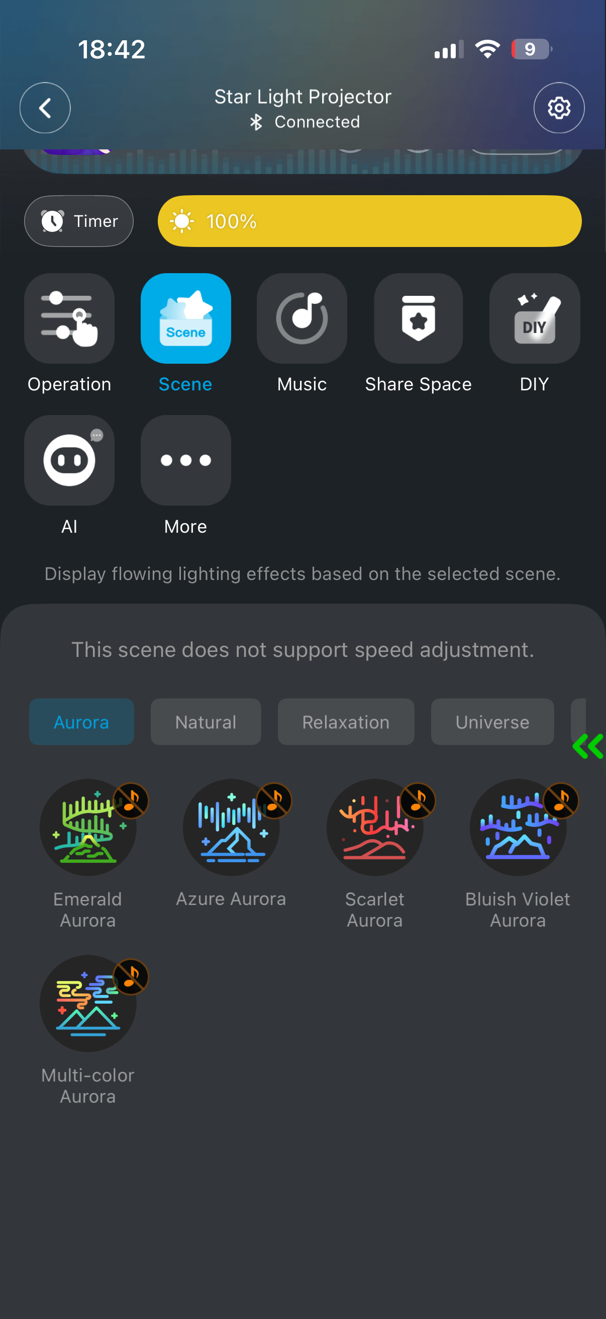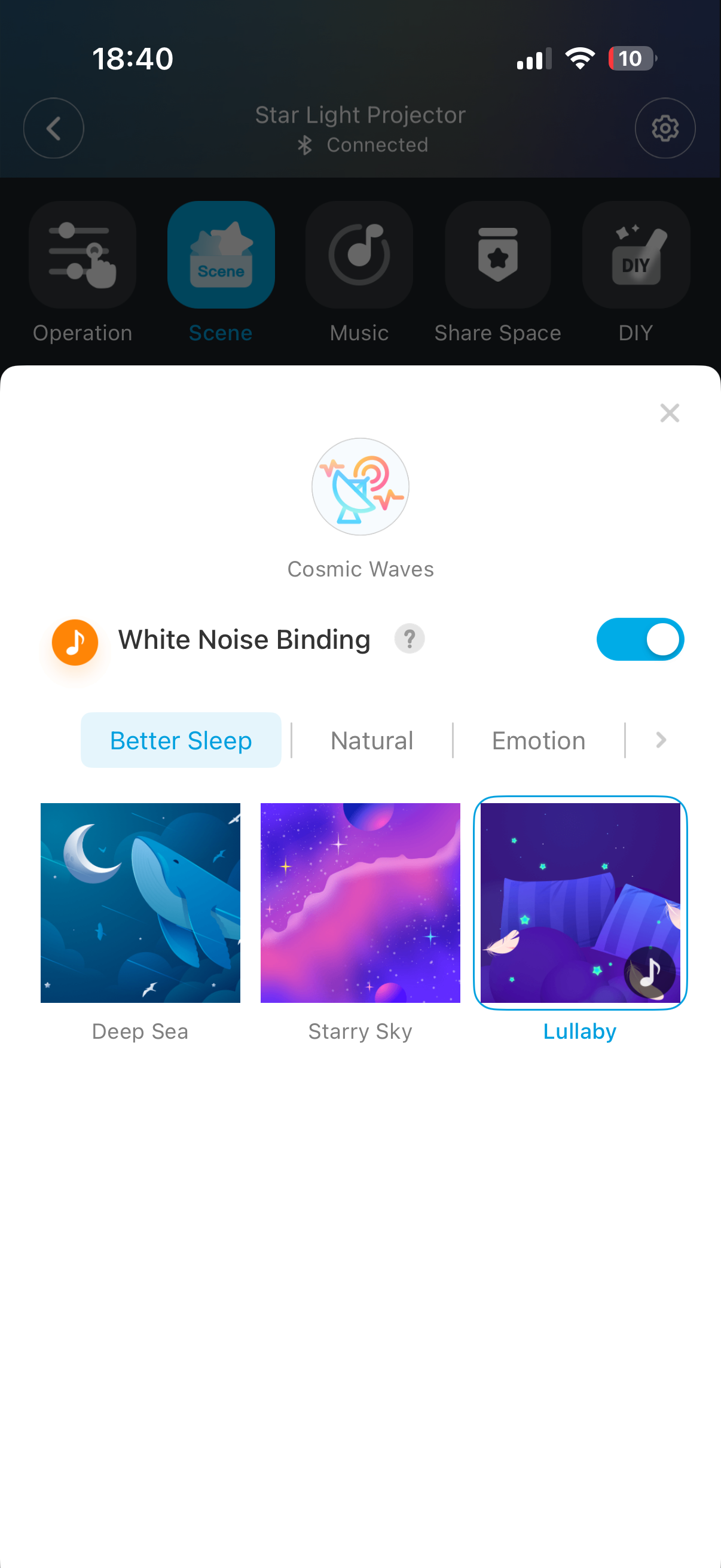 Hlavním lákadlem projektoru je samozřejmě světelná show. Projektor dokáže na strop či stěnu promítat hvězdnou oblohu s dynamickými efekty, mlhovinami a barevnými přechody. Na rozdíl od levnějších no-name produktů z e-shopů působí výsledný efekt velmi realisticky a příjemně, žádné křiklavé barvy nebo agresivní přechody, ale jemná, uklidňující projekce. K dispozici je celá řada režimů, které můžete měnit podle nálady, od relaxačních pastelových kombinací až po energické barevné vlny. Můžete si vždy zvolit barvy, jaké chcete použít, jak rychle se mají vlny pohybovat a jestli a jak moc mají svítiti hvězdičky. Vše pak můžete propojit do nekonečného množství kombinací, které dokáží naladit atmosféru ať už děláte zrovna cokoli vás jen napadne.