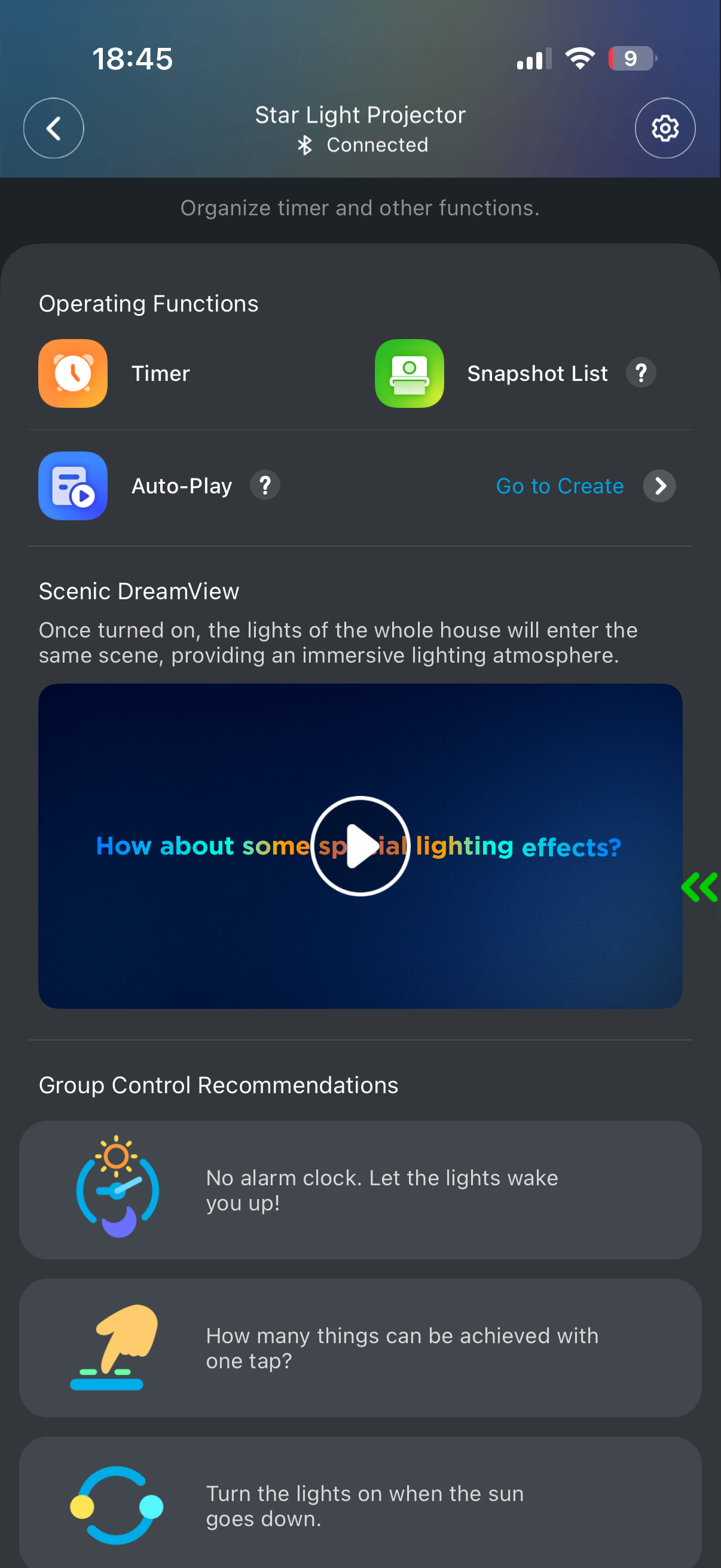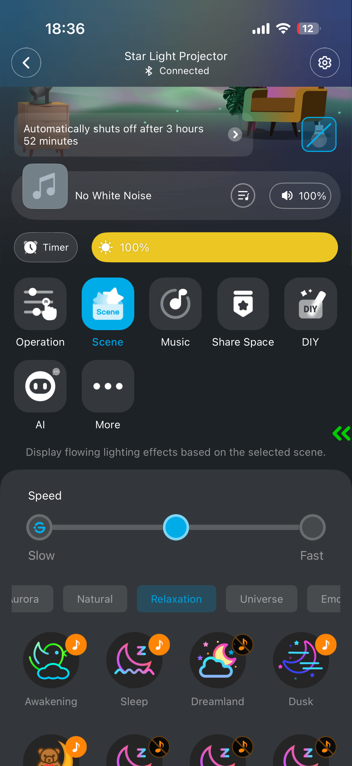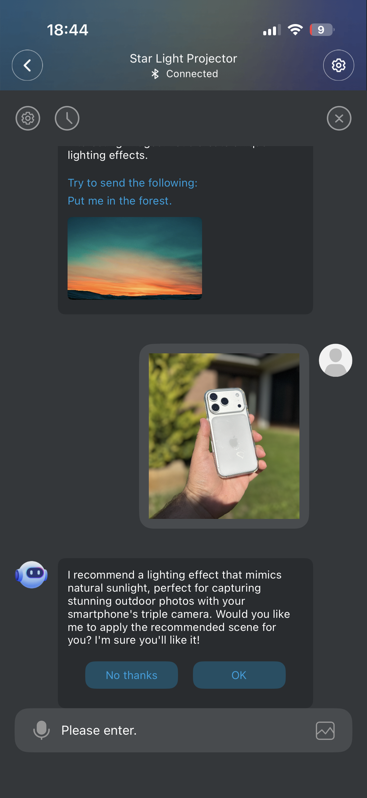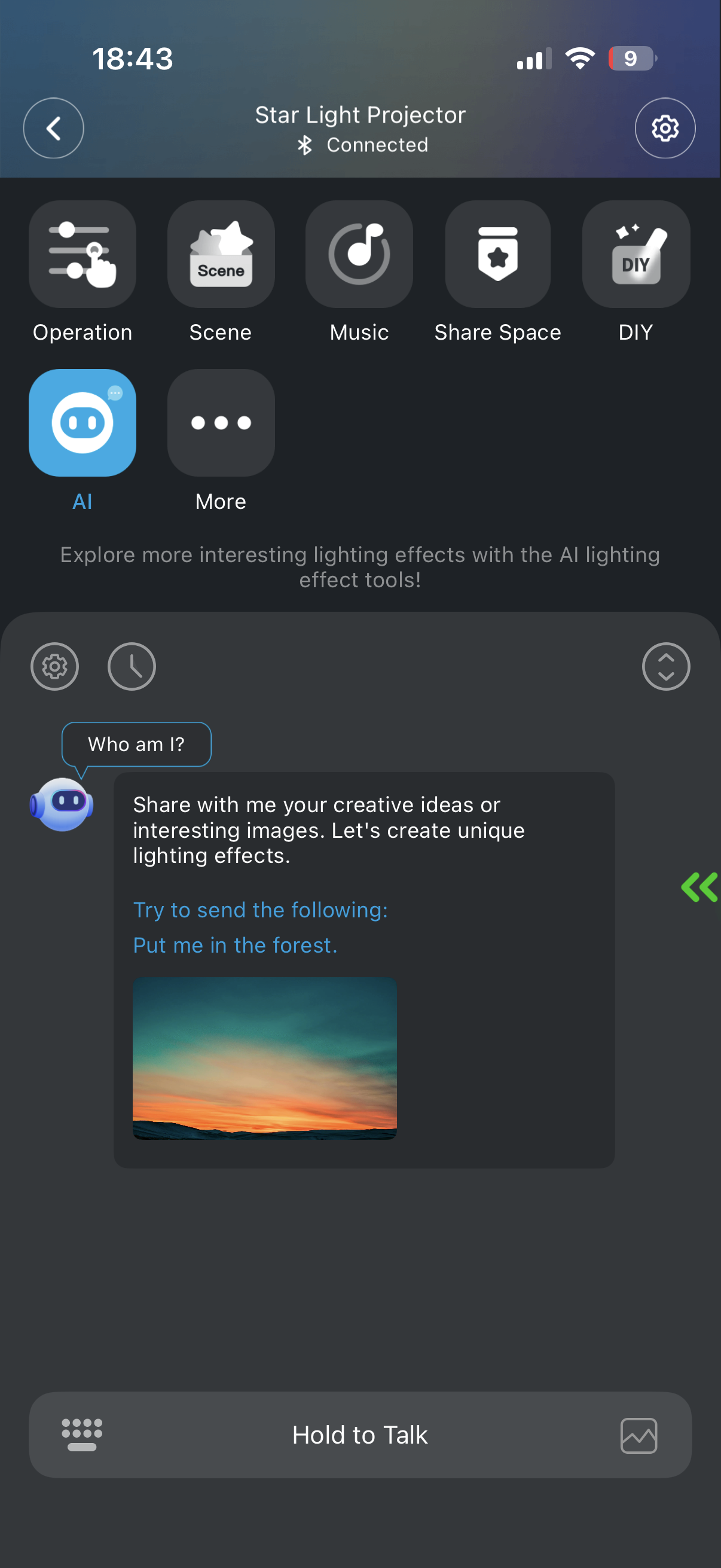 Efekty lze navíc synchronizovat s hudbou, kde se však počítá s tím, že použijete především nějaké meditační zvuky přírody nebo jemnou hudbu. Na to je reproduktor integrovaný v projektoru dostatečně výkonný a nabízí kvalitní poslech pro podkresovou hudbu. Samozřejmě se nejedná o nějaký výkonný reproduktor, na kterém chcete poslouchat klasickou hudbu, ale jako podkres je naprosto dostačující. Pokud vám dojdou nápady na vlasntí efekty, můžete si stáhnout ty které někdo vytvořil, nechat si vtvořit efekty na základě hudby nebo dokonce pomocí AI. Celkem zajímavou vychytávkou je právě zmíněná AI funkce, kdy můžete nahrát fotografii, ke které chcete automaticky vytvořit atmosférické osvětlení. AI analyzuje co je na fotografii a navrhne nejlepší možné osvětlení, které scénu na fotografii dokonale doplní. Musím uznat, že to celkem funguje. Aplikace pak umožňuje nechat projektor vypnout po určité době nebo naopak probouzet se se zapnutím projekce a využít jej jako budík.