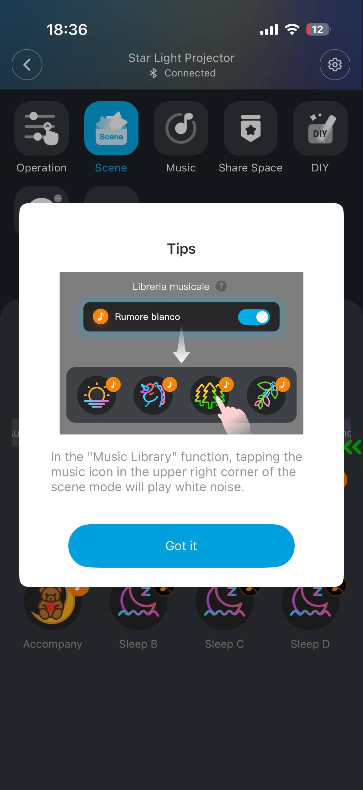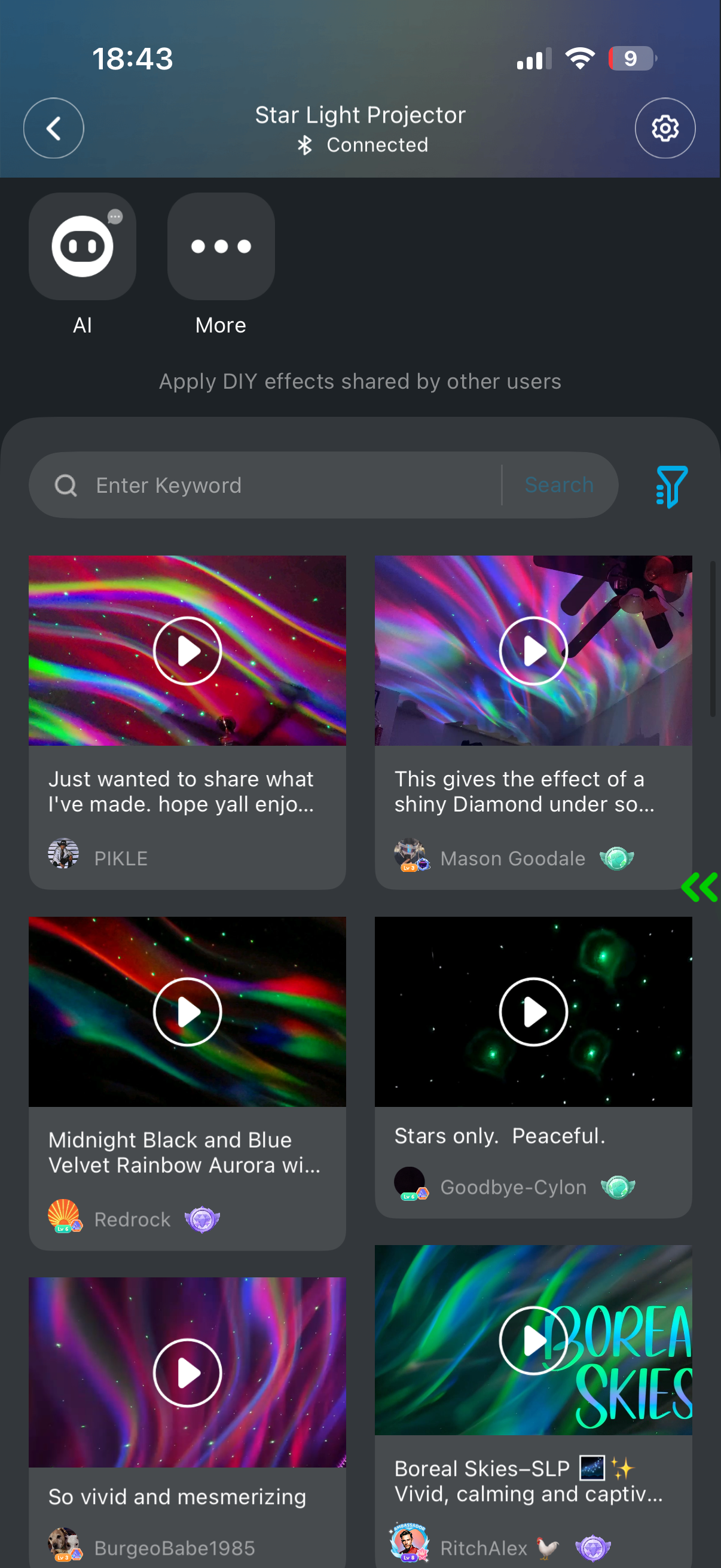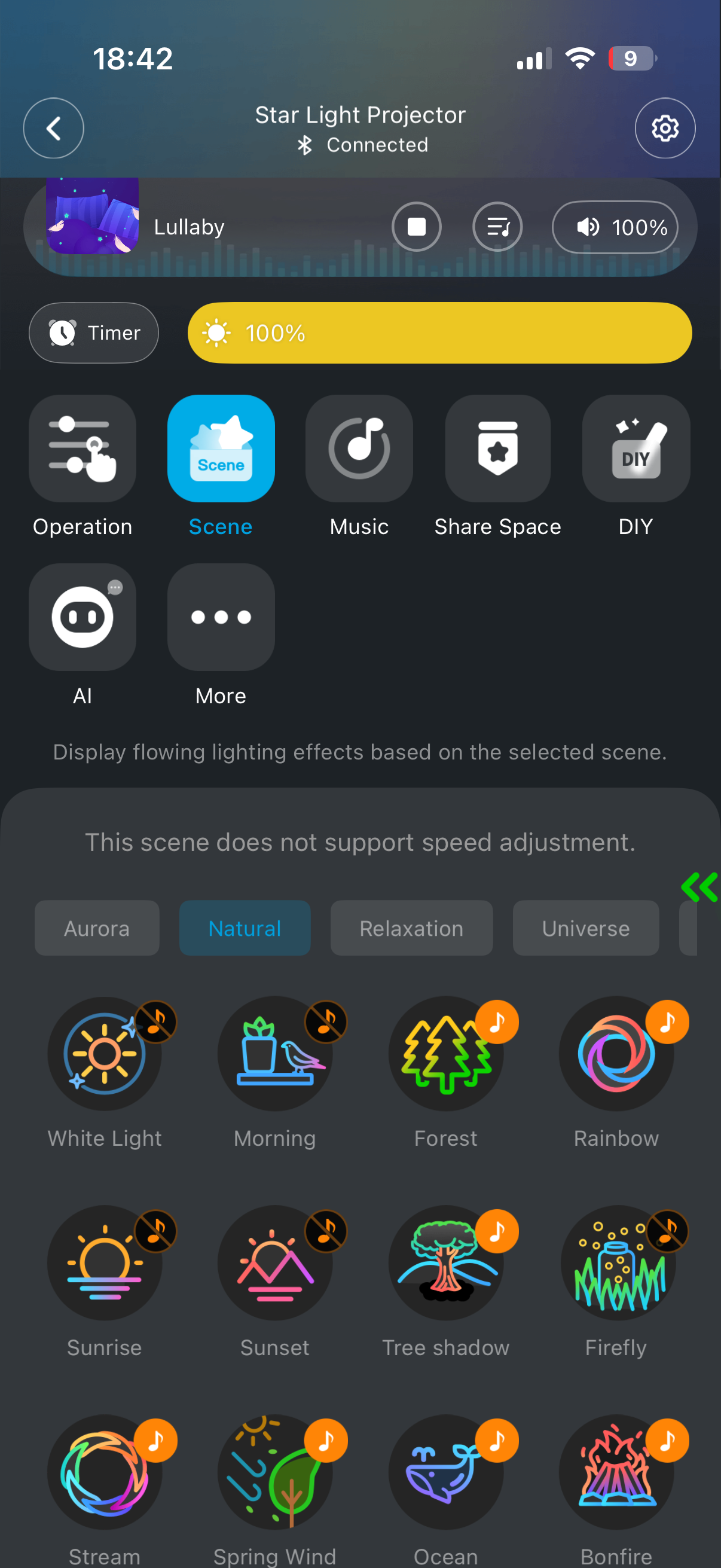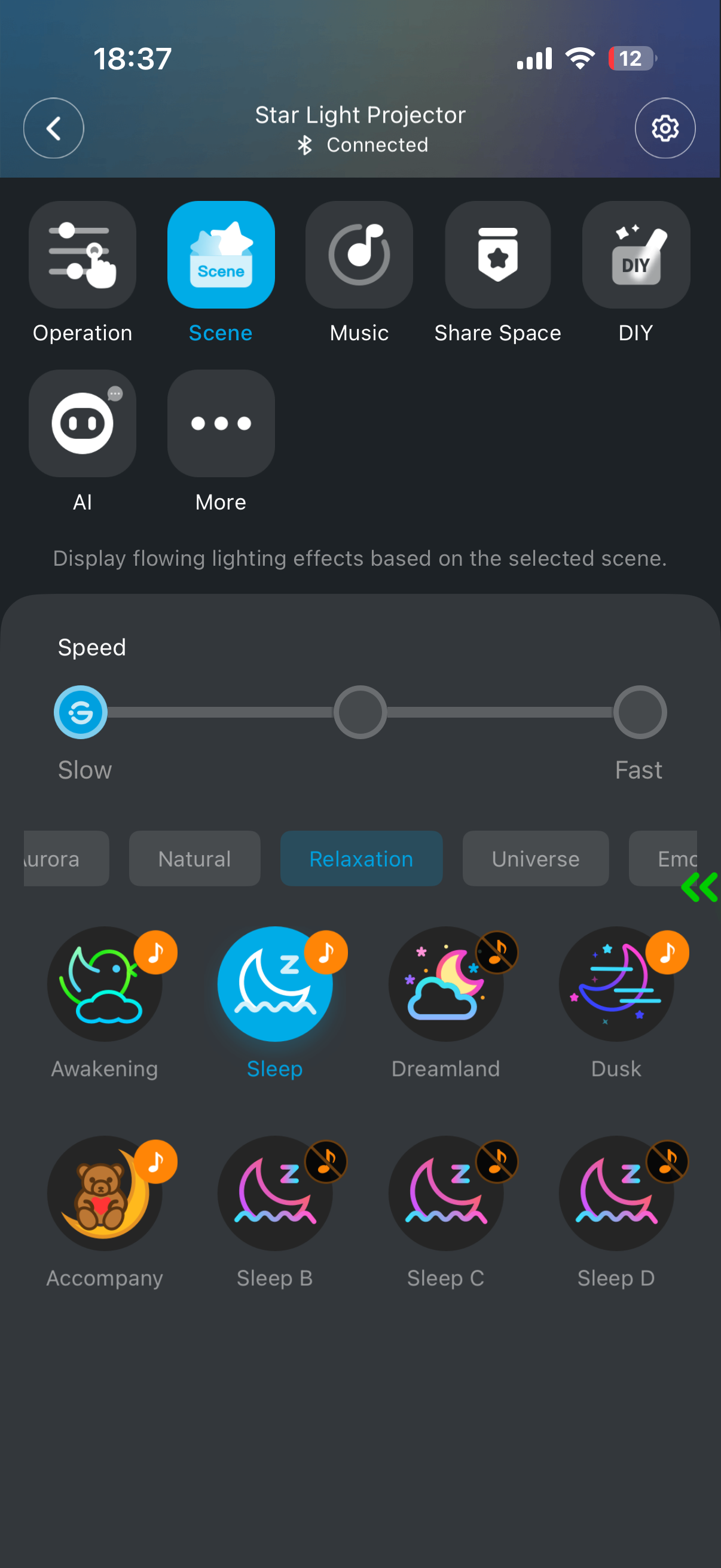 Efekty lze navíc synchronizovat s hudbou, kde se však počítá s tím, že použijete především nějaké meditační zvuky přírody nebo jemnou hudbu. Na to je reproduktor integrovaný v projektoru dostatečně výkonný a nabízí kvalitní poslech pro podkresovou hudbu. Samozřejmě se nejedná o nějaký výkonný reproduktor, na kterém chcete poslouchat klasickou hudbu, ale jako podkres je naprosto dostačující. Pokud vám dojdou nápady na vlasntí efekty, můžete si stáhnout ty které někdo vytvořil, nechat si vtvořit efekty na základě hudby nebo dokonce pomocí AI. Celkem zajímavou vychytávkou je právě zmíněná AI funkce, kdy můžete nahrát fotografii, ke které chcete automaticky vytvořit atmosférické osvětlení. AI analyzuje co je na fotografii a navrhne nejlepší možné osvětlení, které scénu na fotografii dokonale doplní. Musím uznat, že to celkem funguje. Aplikace pak umožňuje nechat projektor vypnout po určité době nebo naopak probouzet se se zapnutím projekce a využít jej jako budík.