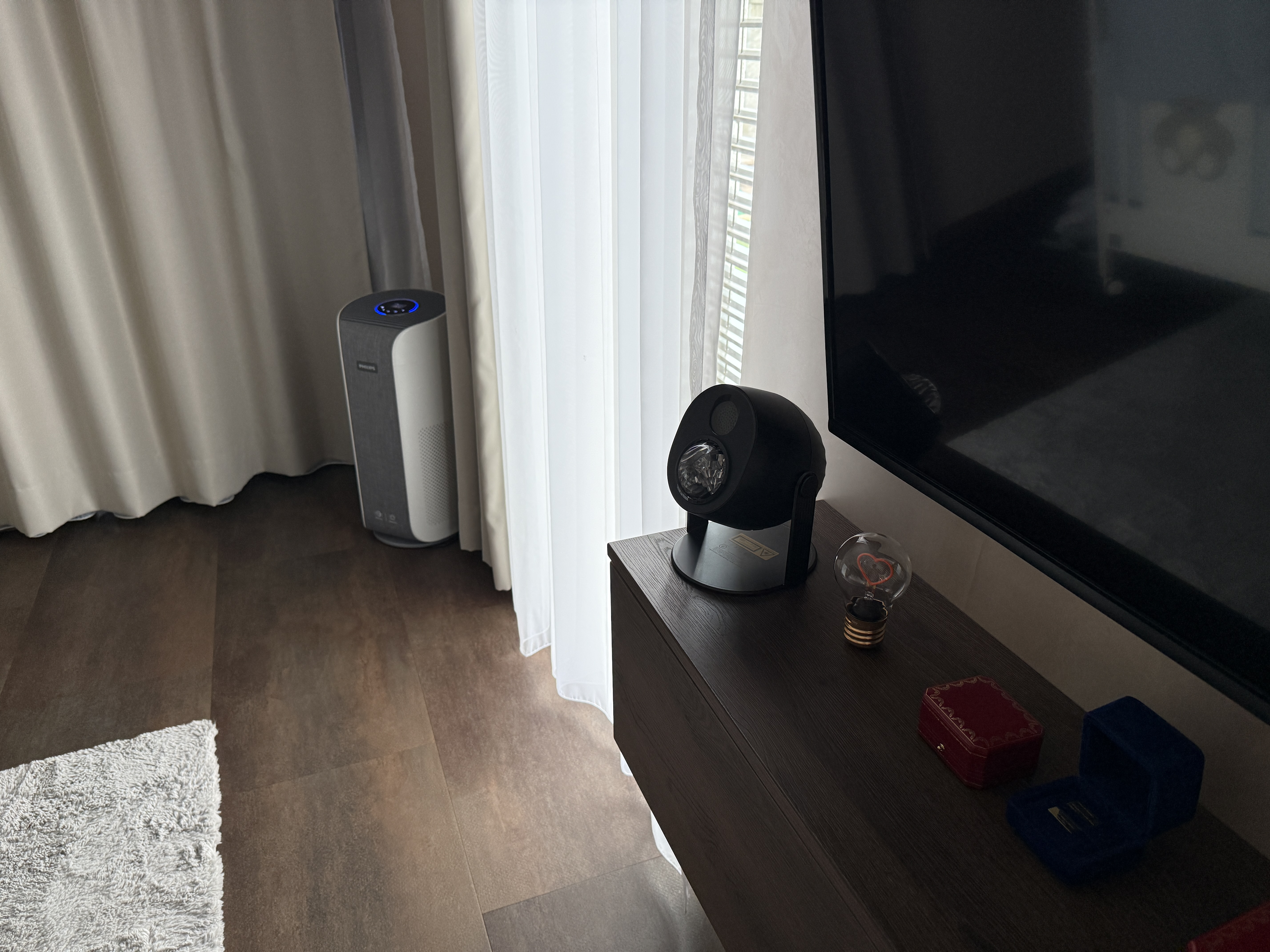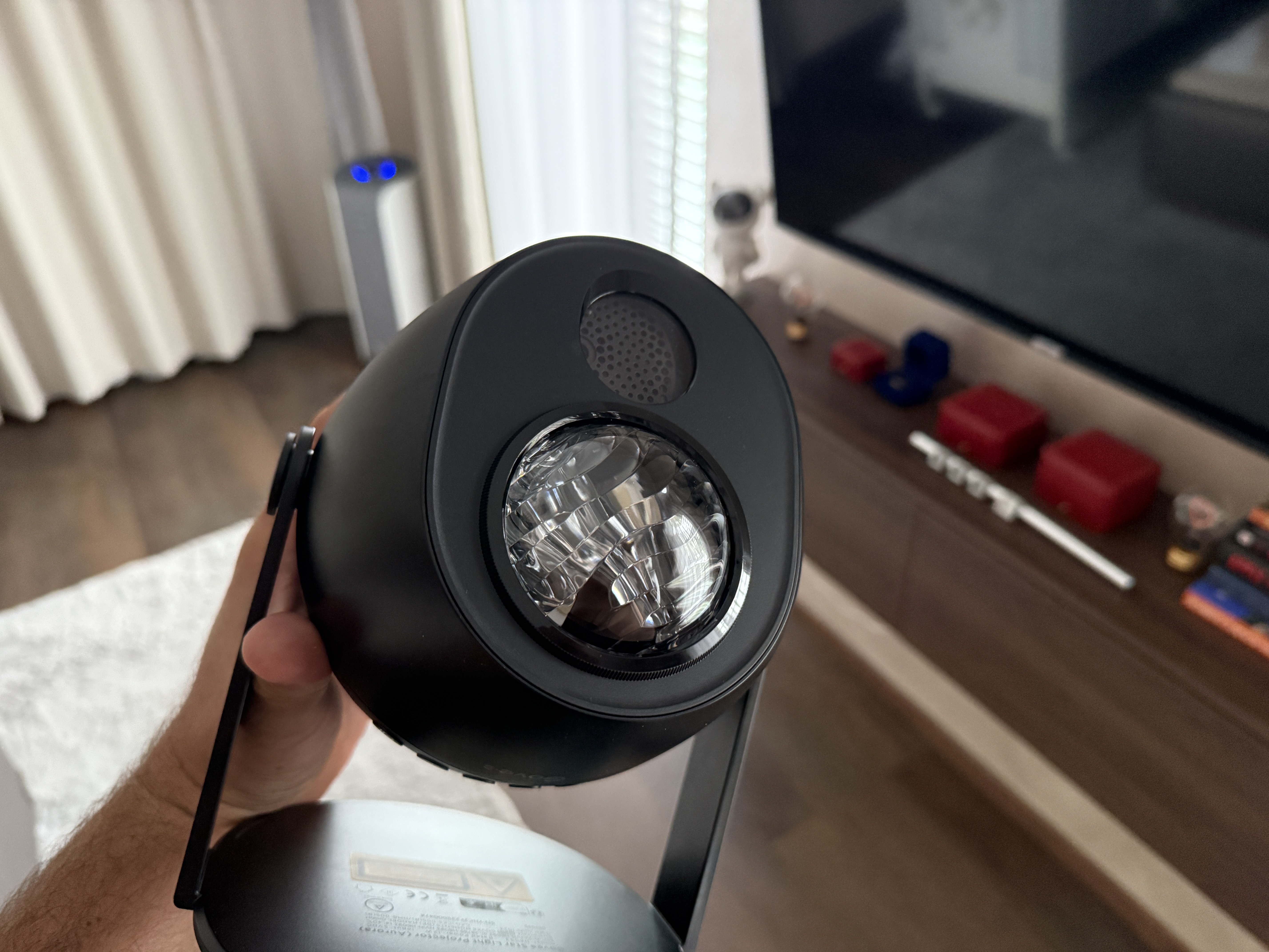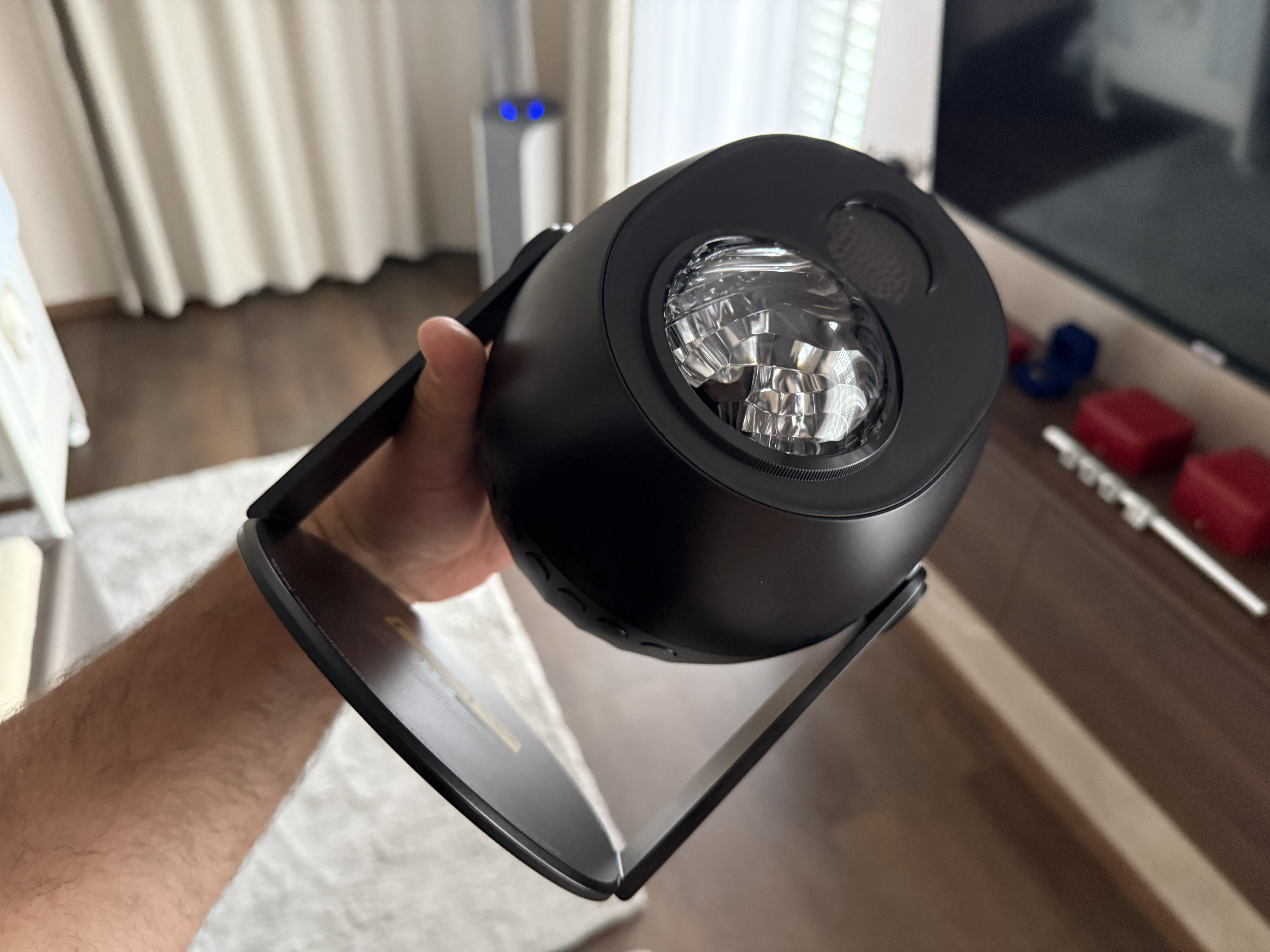 Základní ovládací tlačítka najdete přímo na těle projektoru. Jsou dostatečně velká, dobře se mačkají a v běžném provozu vystačí. Pokud ale chcete využít veškerý potenciál, bez aplikace se neobejdete. Napájení je řešeno přes USB-C kabel, který v balení najdete. Adaptér už ale výrobce nepřibalil, což je trochu škoda. Co se mi líbí je pole, které dokáže projektor zasáhnout, například naši ložnici, která má 25 metrů čtverečních dokáže obsáhnout étměř celou a krásně ji osvítit od stropu, přez zdi až po podlahu.