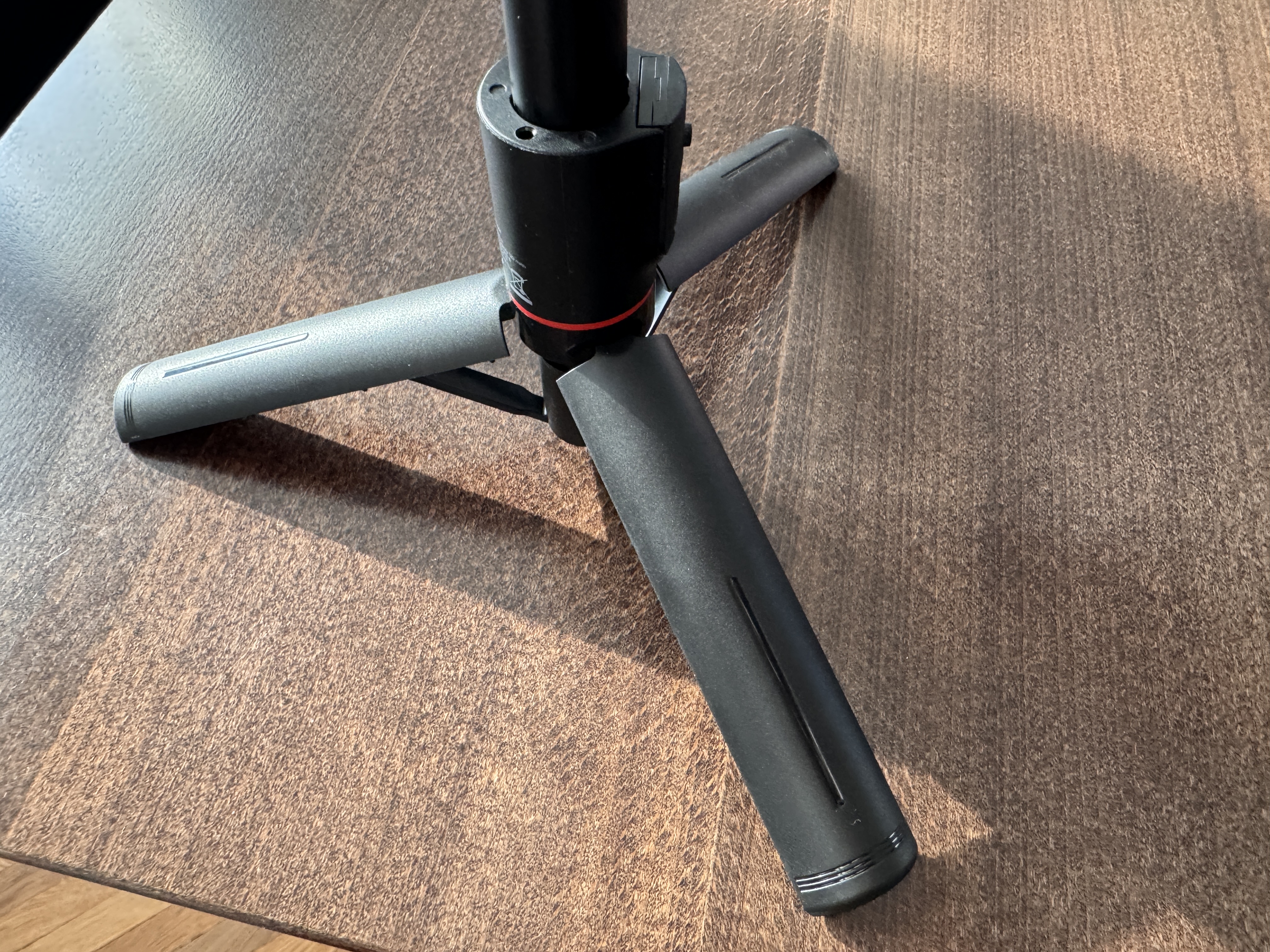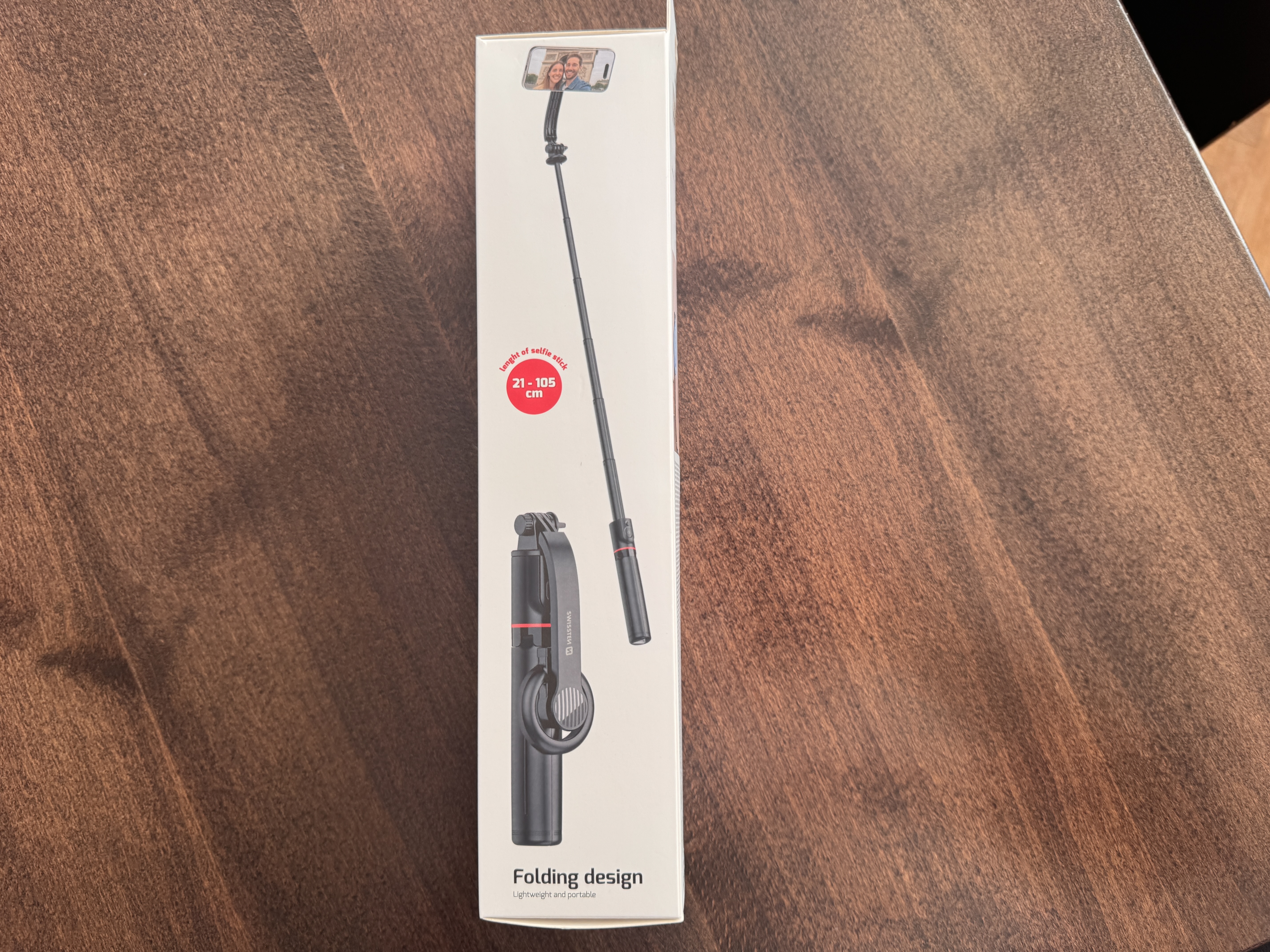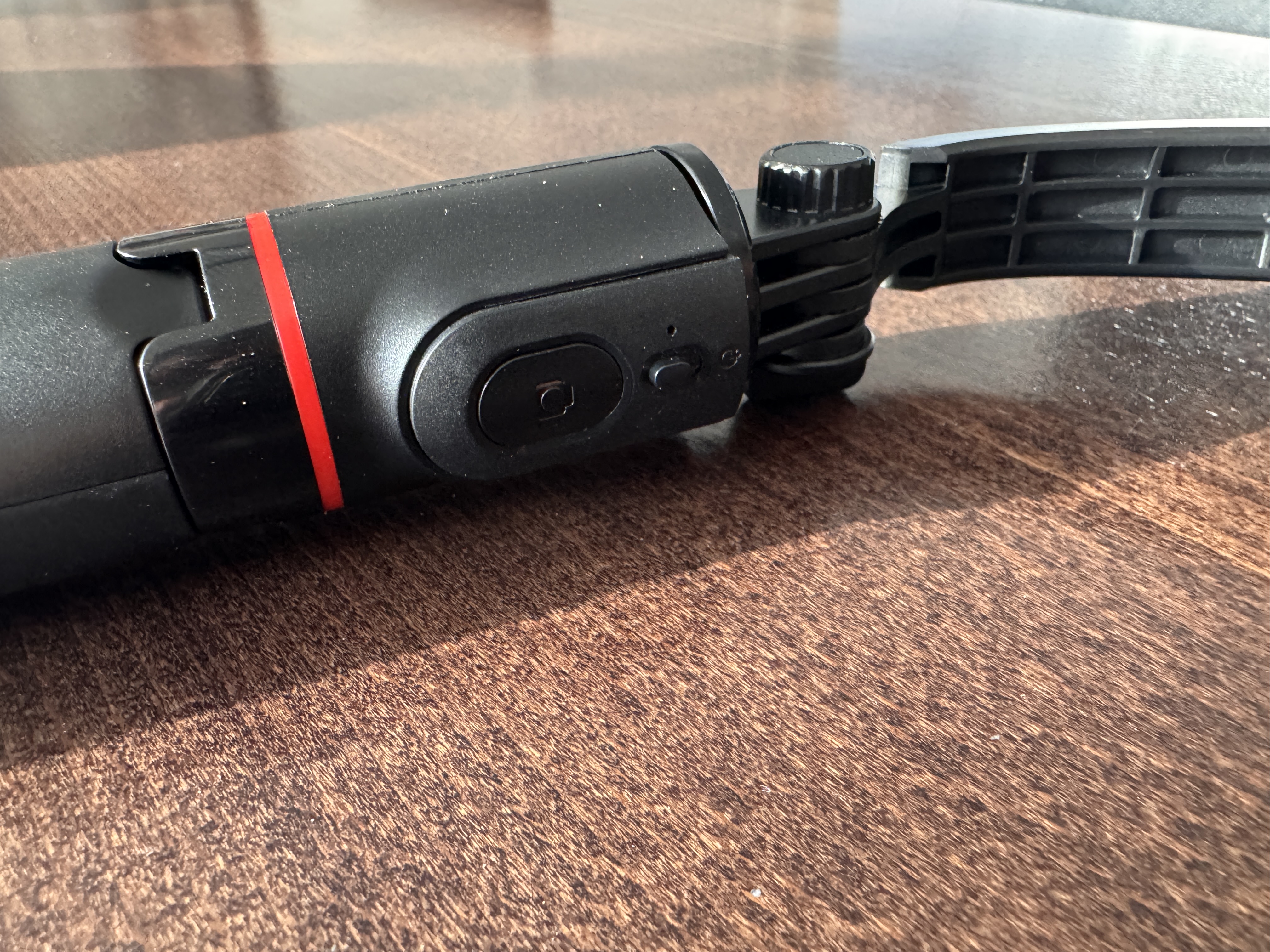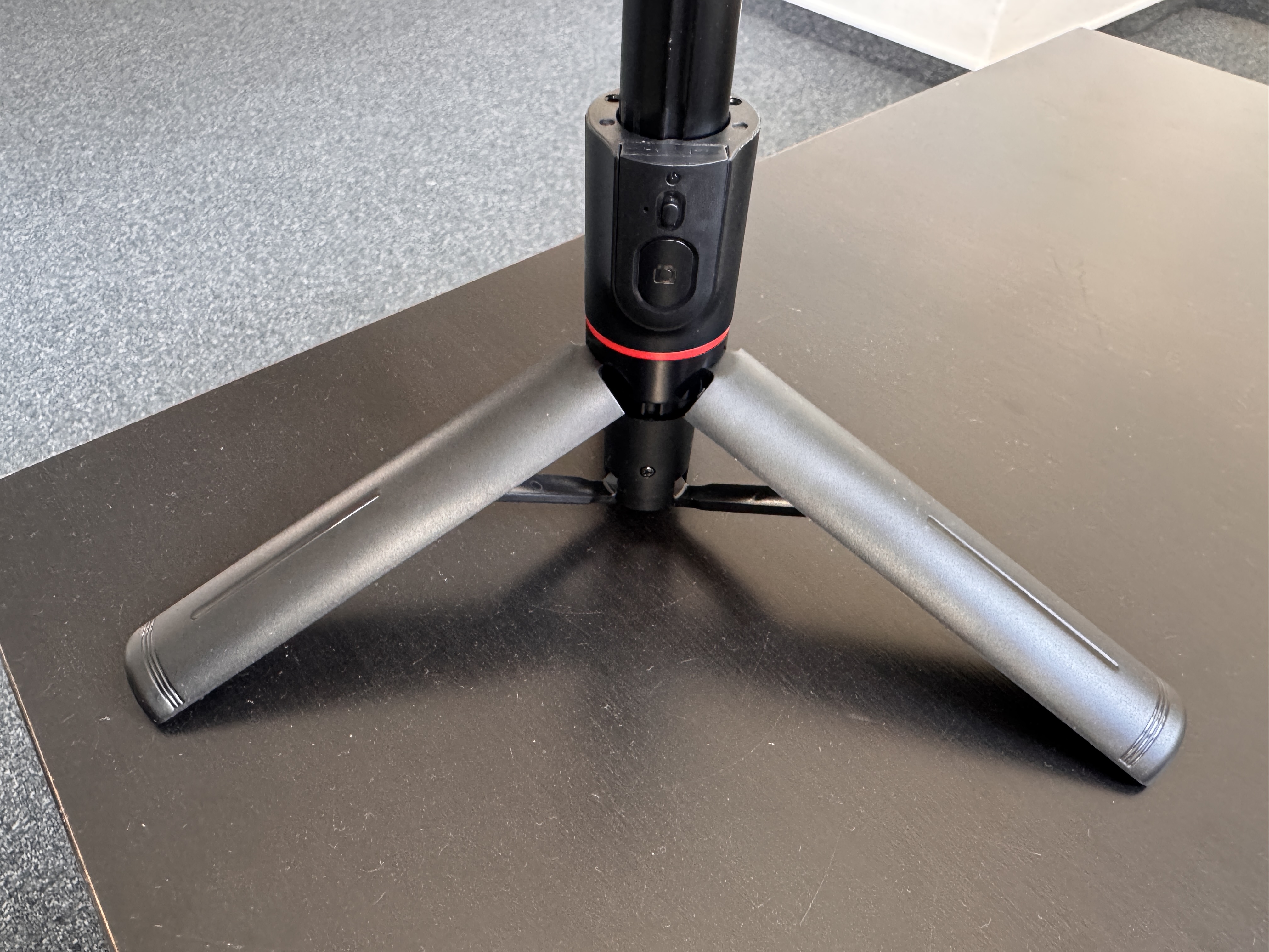 - Stabilní stativ (Tripod): Rukojeť tyče se dá rozložit na tři nožičky, čímž vznikne praktický stativ. Nožičky jsou opatřeny silikonovými protiskluzovými koncovkami, což zajišťuje stabilitu jak na pracovním stole při videohovorech, tak v terénu při focení samospouští.