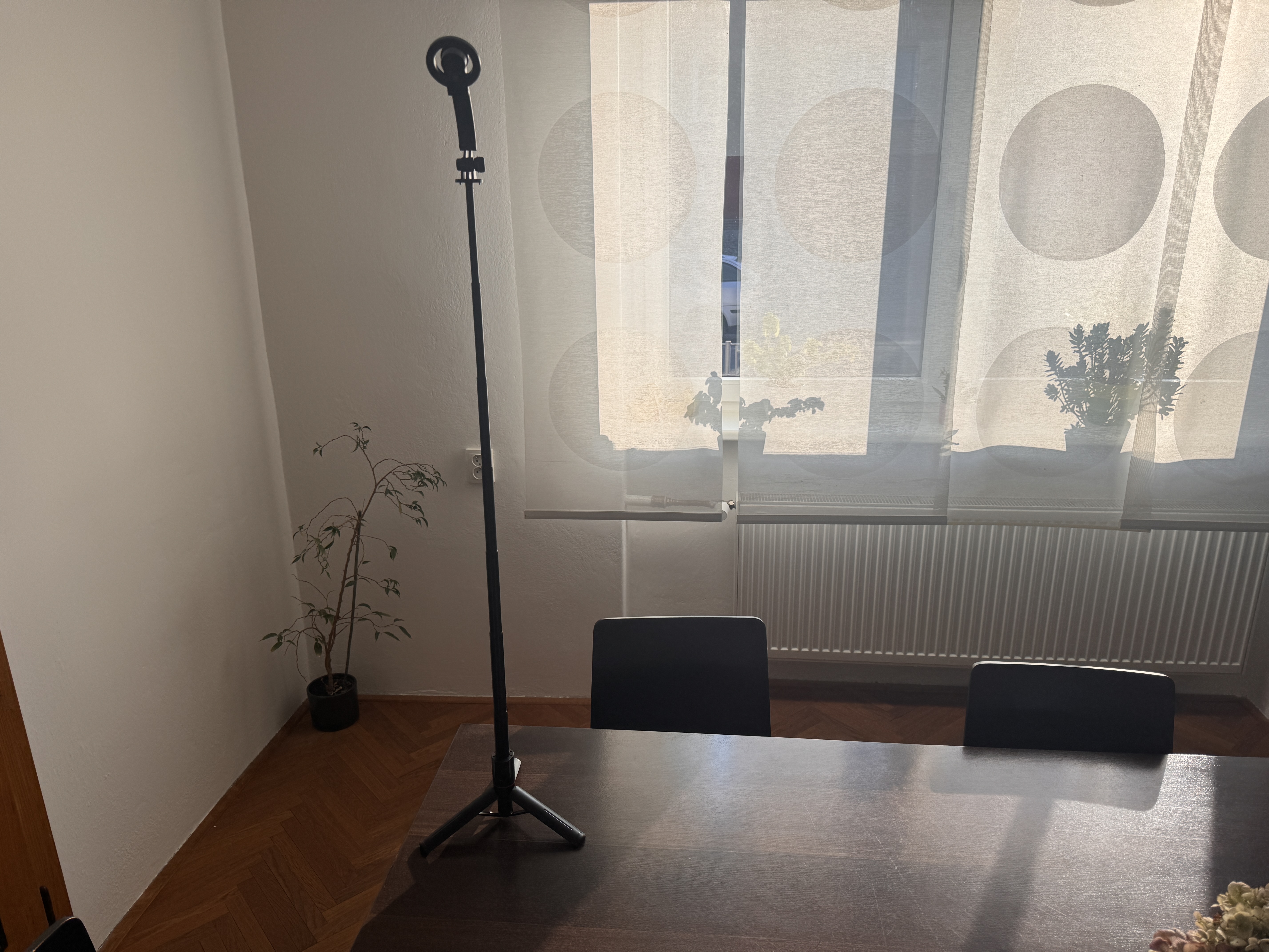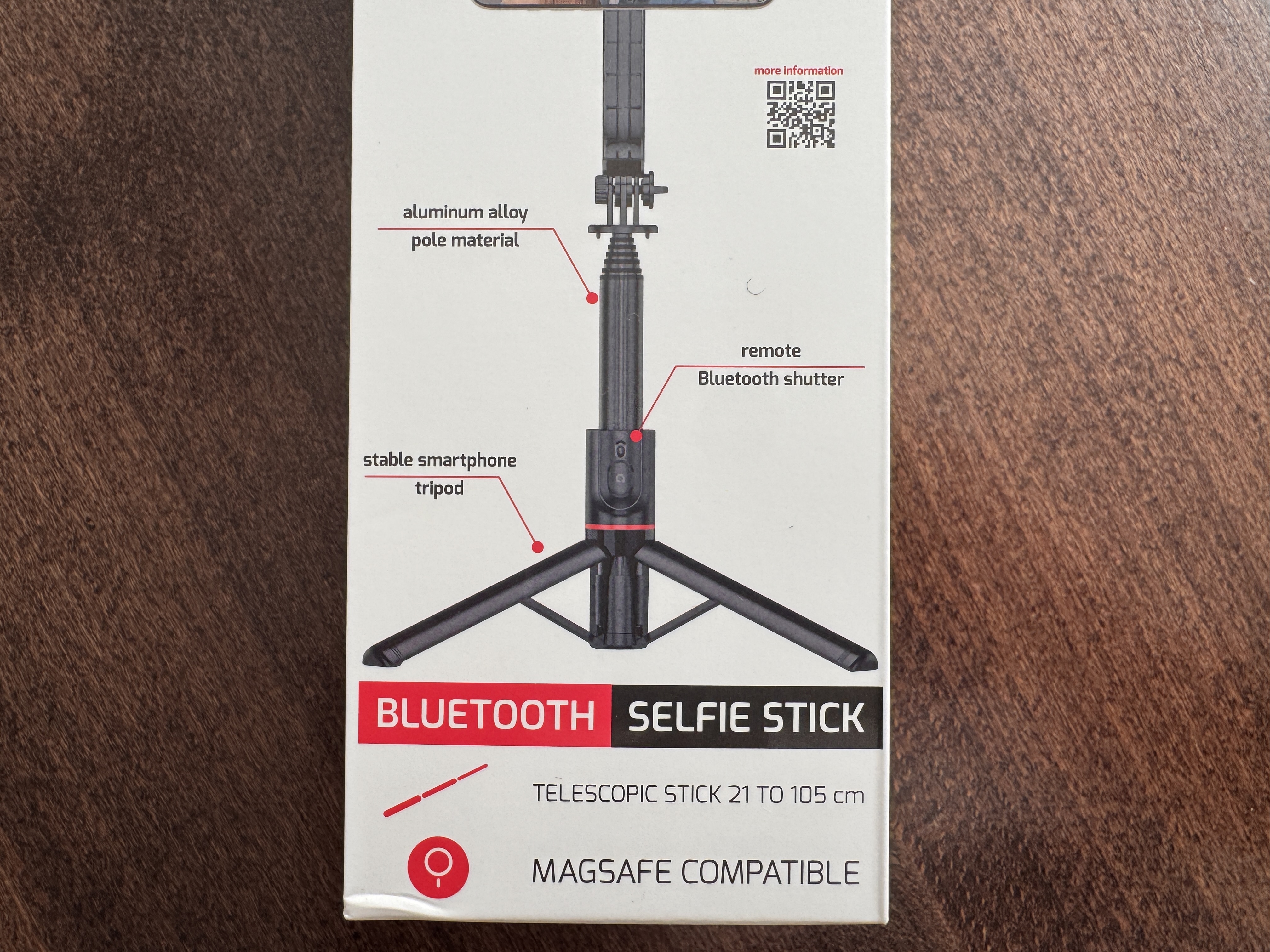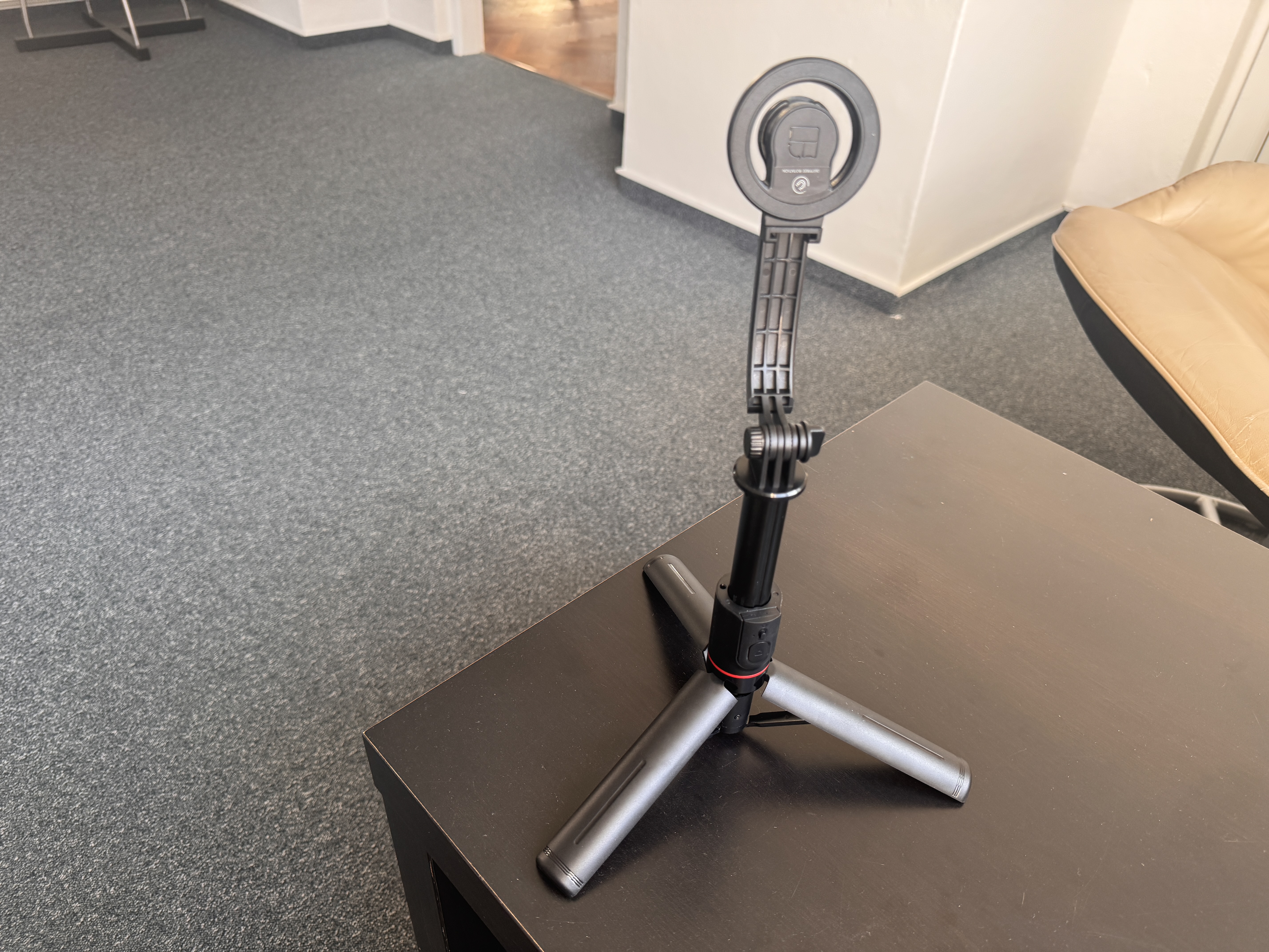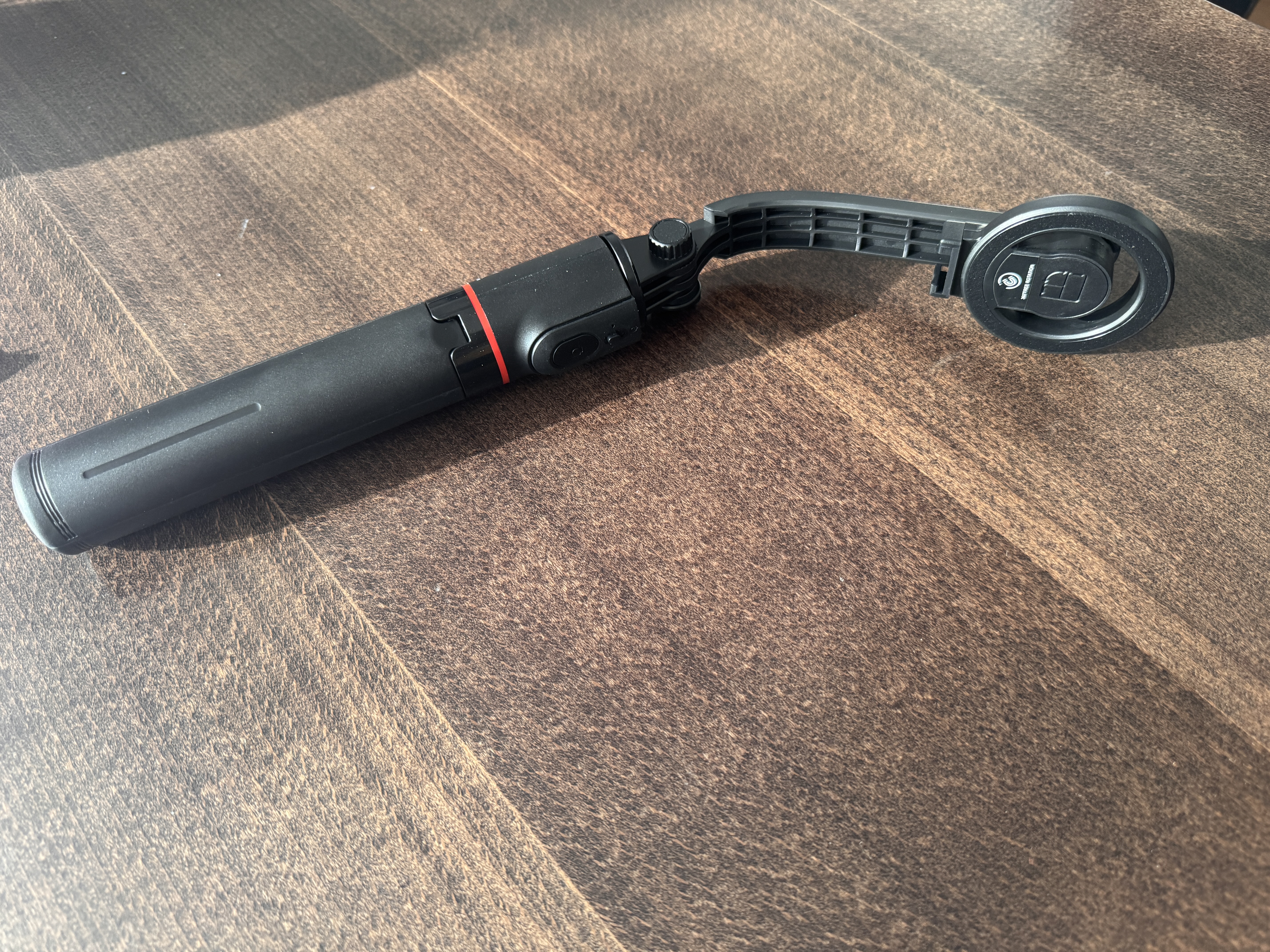 - Stabilní stativ (Tripod): Rukojeť tyče se dá rozložit na tři nožičky, čímž vznikne praktický stativ. Nožičky jsou opatřeny silikonovými protiskluzovými koncovkami, což zajišťuje stabilitu jak na pracovním stole při videohovorech, tak v terénu při focení samospouští.