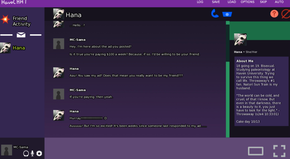 Loser Named Hana je krátký, ale intenzivní příběhový zážitek, který začíná u zvláštního inzerátu slibujícího sto dolarů týdně za to, že budete něčí přítel. Brzy zjistíte, že za nabídkou stojí osamělá dívka jménem Hana – bytost s nepřehlédnutelně vysokým hlasem, zvláštním chováním a zoufalou potřebou lidské blízkosti. Hra staví hlavně na dialogu a postupném odhalování Hanina nitra, přičemž nechává na hráči, zda k ní přistoupí s empatií, odstupem nebo nedůvěrou.