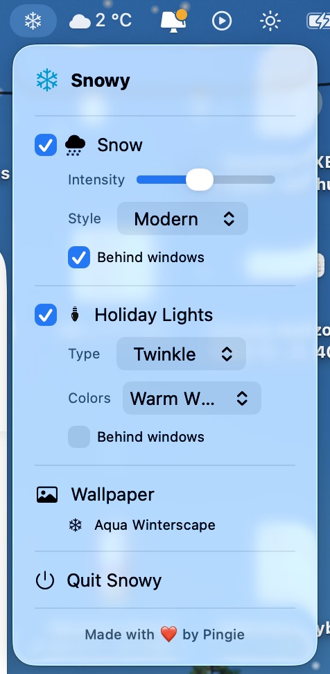 Snowy se ovládá přes ikonu v Menu Baru, odtud máte vše pod palcem. Jedním kliknutím zapnete nebo vypnete sněžení, dalšími nastavíte, zda má sníh padat pořád, nebo se má schovat za okna aplikací. Intenzitu si navíc můžete přizpůsobit tak, aby vás sněhová nadílka buď jen lehce doprovázela, nebo se z displeje stal regulérní zimní chaos.