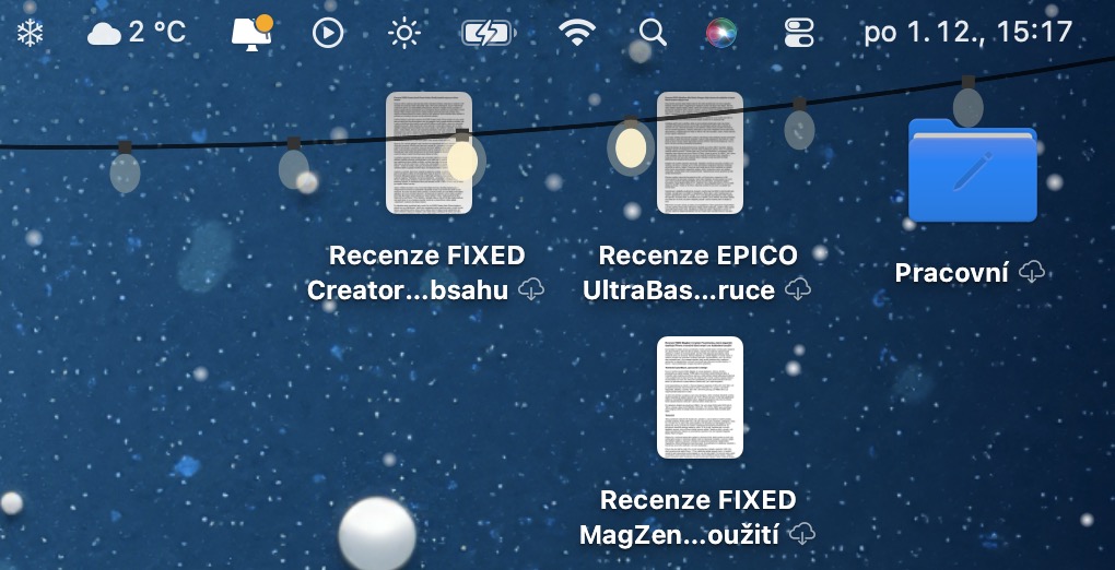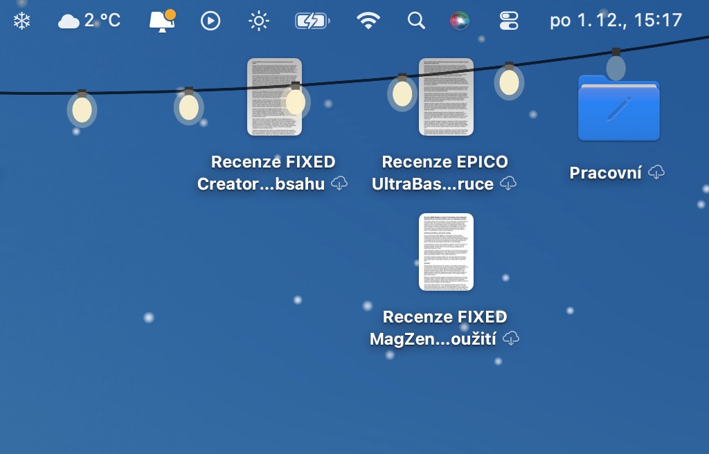 Vánoční světýlka, která se elegantně objeví podél horní hrany displeje, pak nabízí ještě víc možností. Můžete střídat vzory, do toho si vyberete barevný styl a vaše digitální Vánoce mohou začít. Příjemným bonusem je pak tapeta Aqua Winterscape, která je tak trochu milým Easter eggem pro všechny fanoušky starého macOS. Stromek posetý ovládacími prvky z Aqua éry je totiž pořádná nostalgie, který jsme tu dlouho neměli. A pokud vás omrzí, jedním kliknutím se vrátíte k původnímu pozadí.