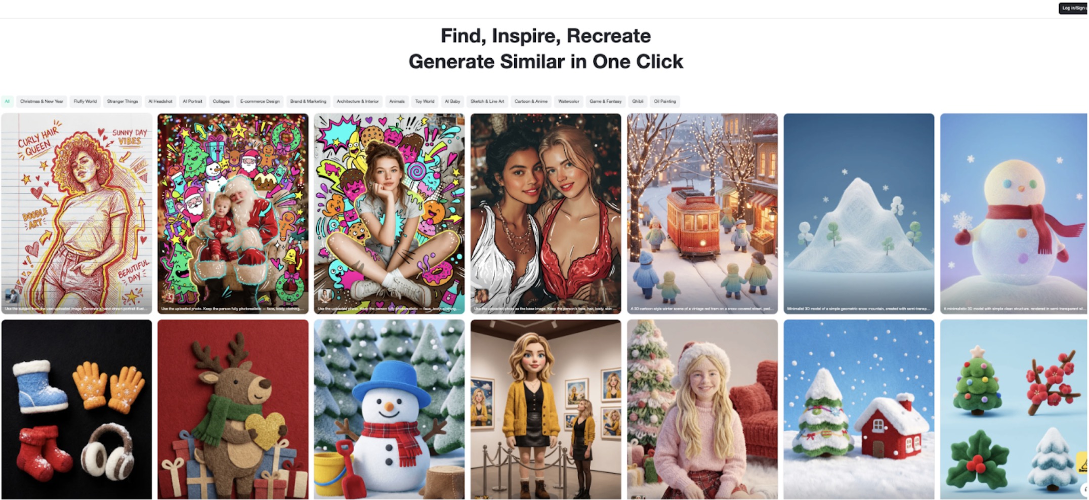 - Inspiration Hub – trendy v reálném čase na sociálních médiích, jako je AI Baby Podcast, AI Headshot a AI produktové obrázky, s možností „znovu vytvořit“ jedním kliknutím.