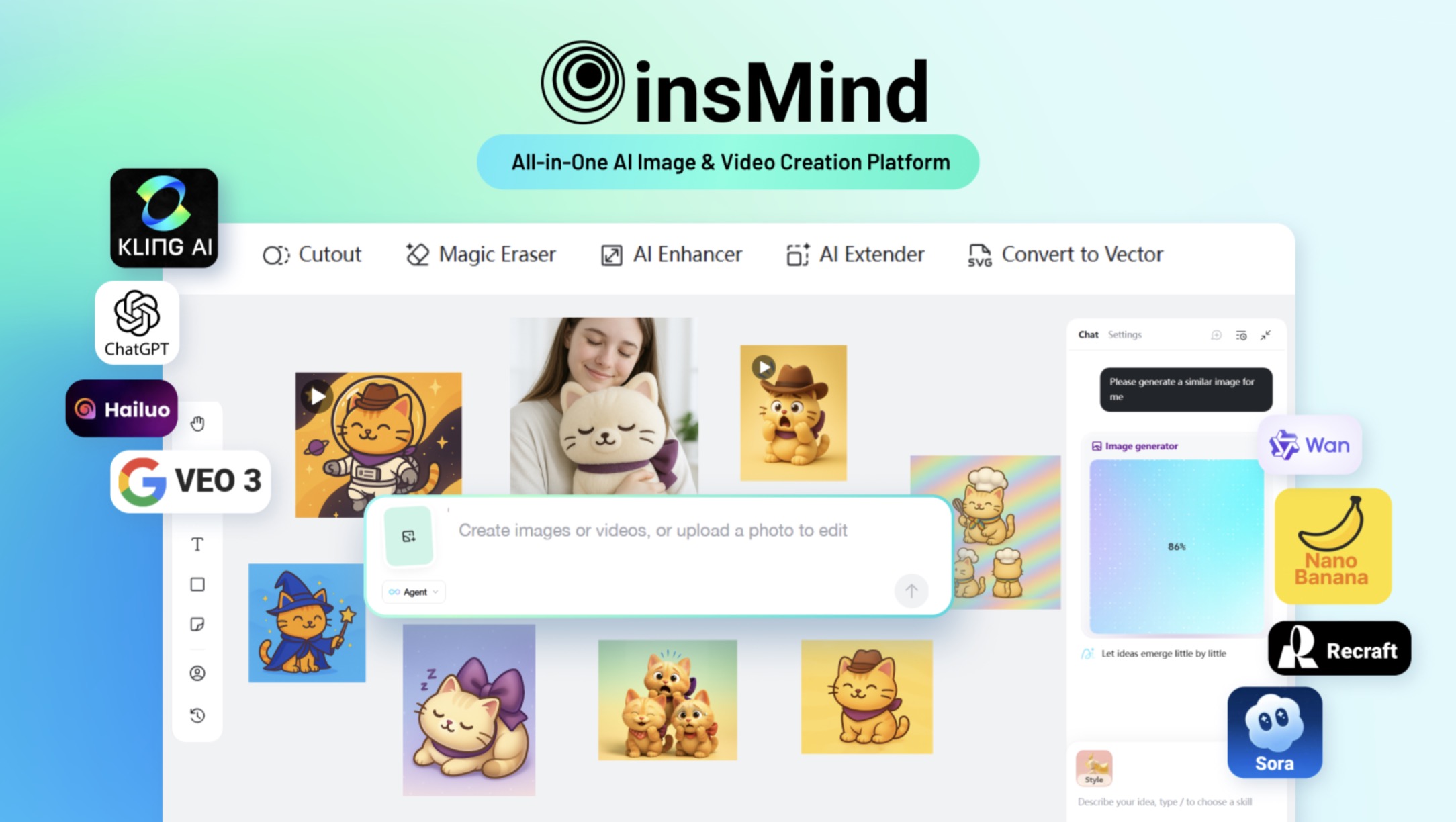 insMind AI Agent je centrem platformy. V jediném okně ve stylu chatu lze pomocí jediného příkazu vytvářet obrázky a videa generované umělou inteligencí a všechny úpravy uchovávat na jednom místě. Agent přečte příkaz, vybere vhodné modely umělé inteligence a aktualizuje výsledky podle požadavků uživatelů na nové varianty, změny barev, úpravy rozložení nebo pohybu, čímž odpadá nutnost přecházet mezi samostatnými nástroji pro práci s obrázky a videi a celý pracovní postup se zrychluje.