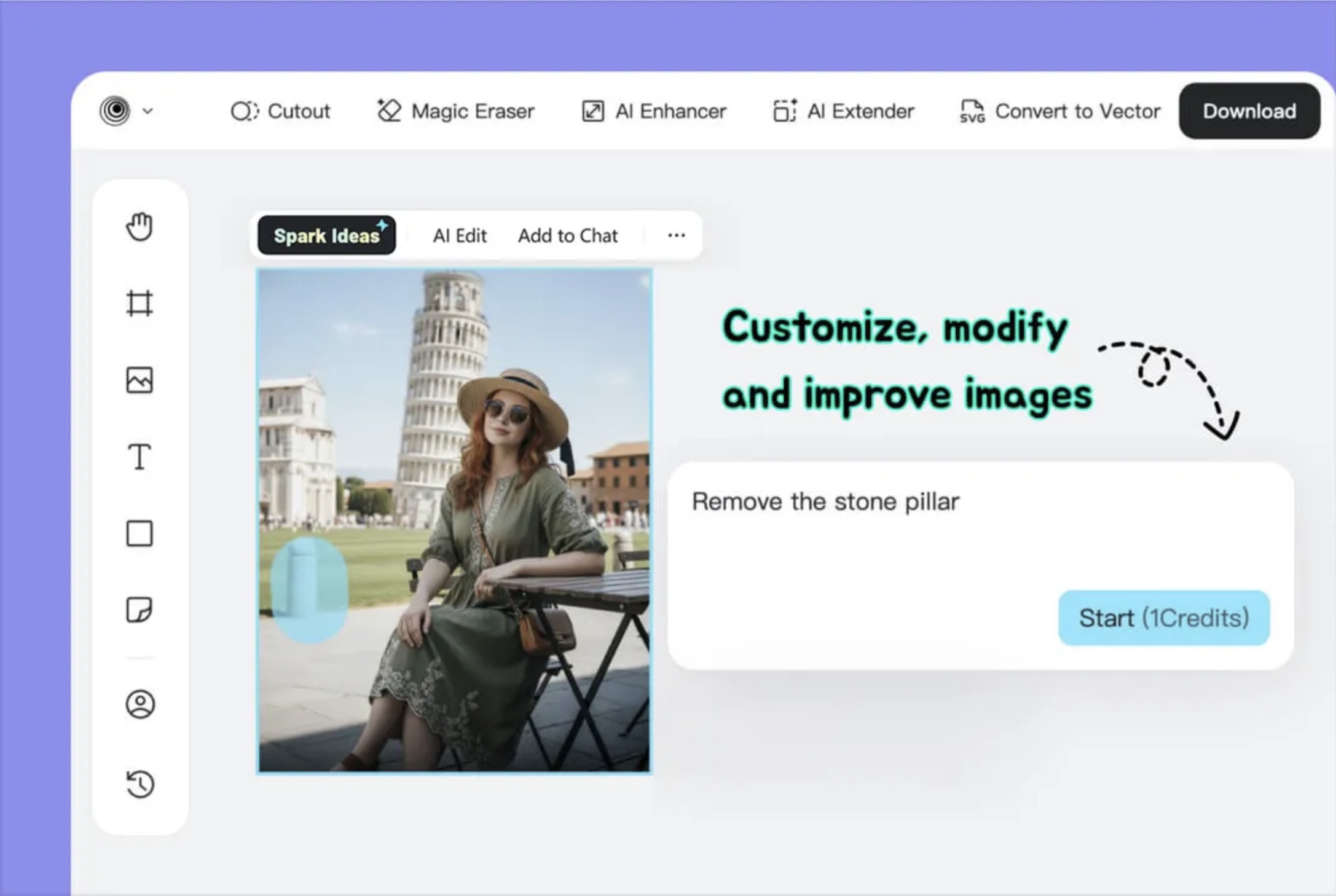 - AI Photo Editor nabízí více než 50 nástrojů AI pro odstranění pozadí, AI pozadí a stíny, vylepšení, rozšíření plátna, restaurování starých fotografií, výměnu oblečení a sloučení obrázků, přičemž většina úprav se provádí jedním kliknutím nebo krátkým příkazem.