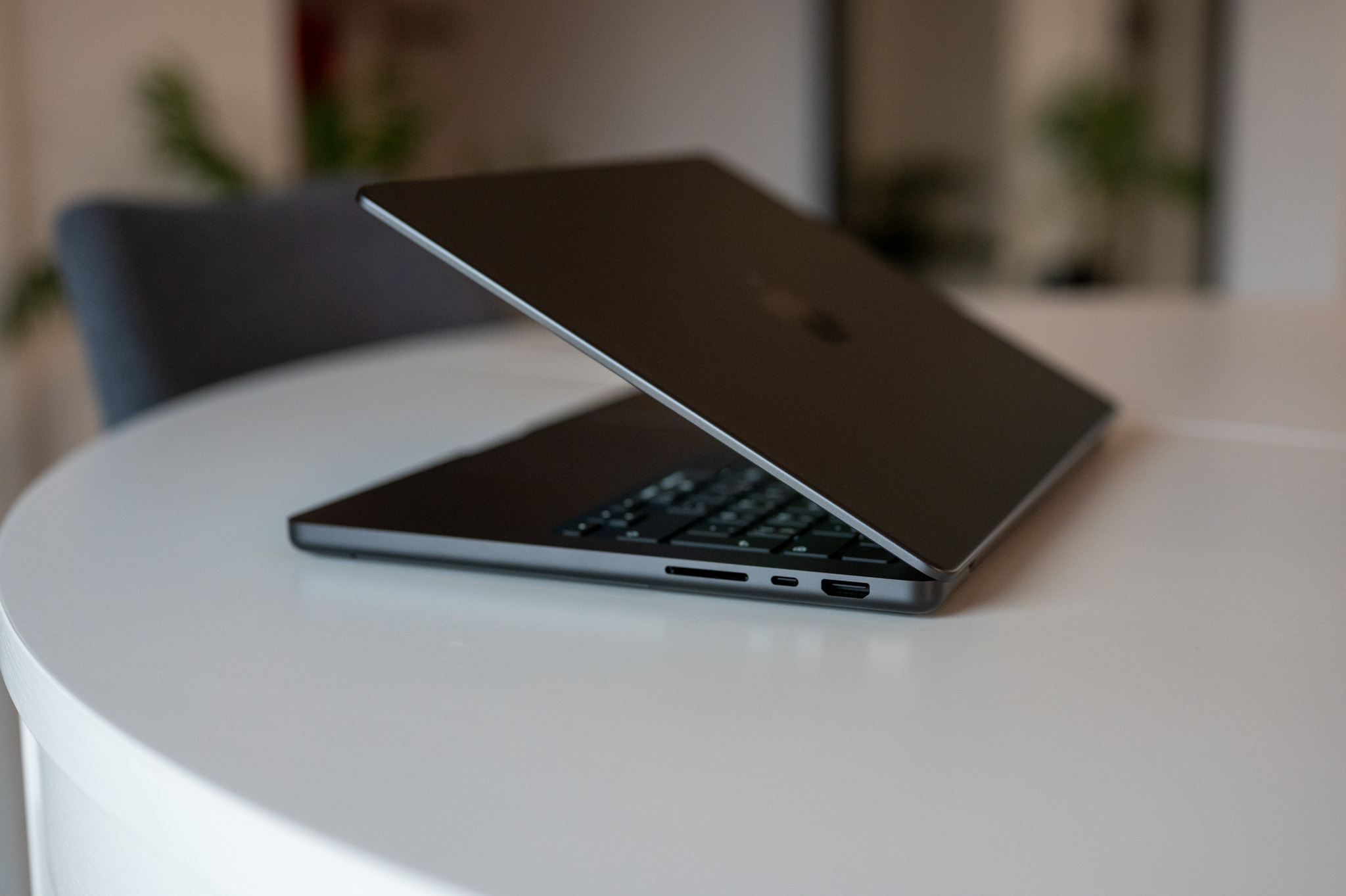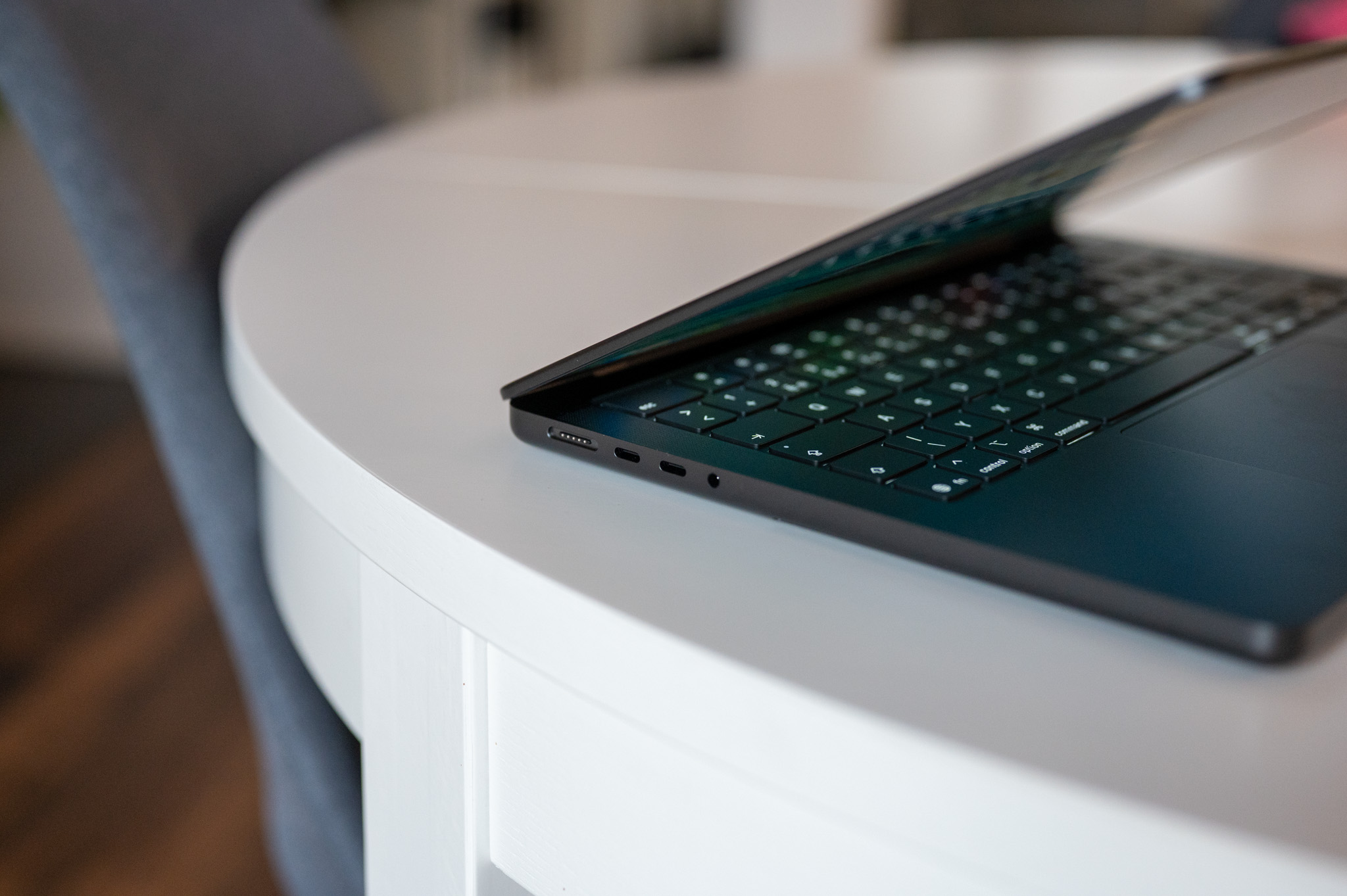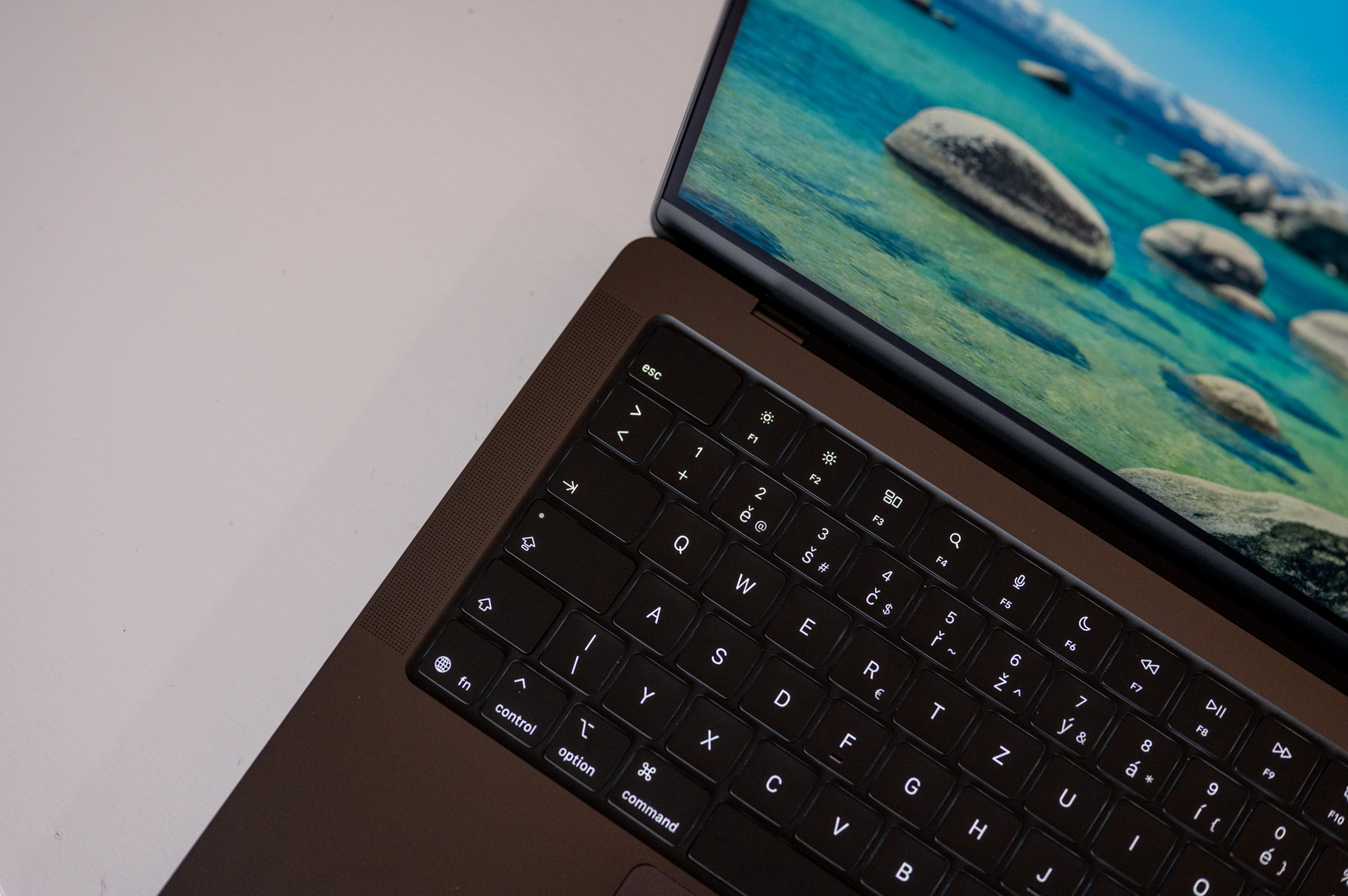 Co pak člověka dokáže oslnit a to i přesto, že se o novinku nejedná, je displej s nanotexturou. Ta eliminuje odlesky světla a to opravdu spolehlivě. Čitelnost displeje proti slunci či nyní pod umělým světlem interiérů je díky nanotexture fantastická a to i ve srovnání s klasickými matnými monitory. Osobně využívám 32“ 4K monitor od LG s matnou povrchovou úpravou a musím říci, že s odlesky si tak dobře jako MacBook díky nanotexture v žádném případě neporadí. A co víc, nanotextura nemá pohledově žádný výrazný vliv na zobrazovací schopnosti stroje. Ano, naprosto nepatrné rozmazání zobrazovaného obsahu při opravdu detailním zkoumání vidět je, nicméně všimnete si jej primárně ve chvíli, kdy vedle sebe postavíte MacBook s klasickým lesklým displejem a stroj s displejem s nanotexturou.