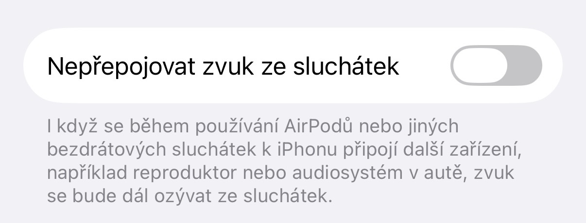 Apple u funkce uvádí, že brání automatickému předání zvuku jiným zařízením, jako jsou například reproduktory nebo autorádia. A je vlastně až úsměvné, že taková drobná volba řeší problém, který uživatelé řeší roky. Snad se tedy jedná o začátek nové éry, která se ponese ve znamení přidávání podobných drobností, které umožní uživatelům si ještě lépe jejich zařízení přizpůsobit.