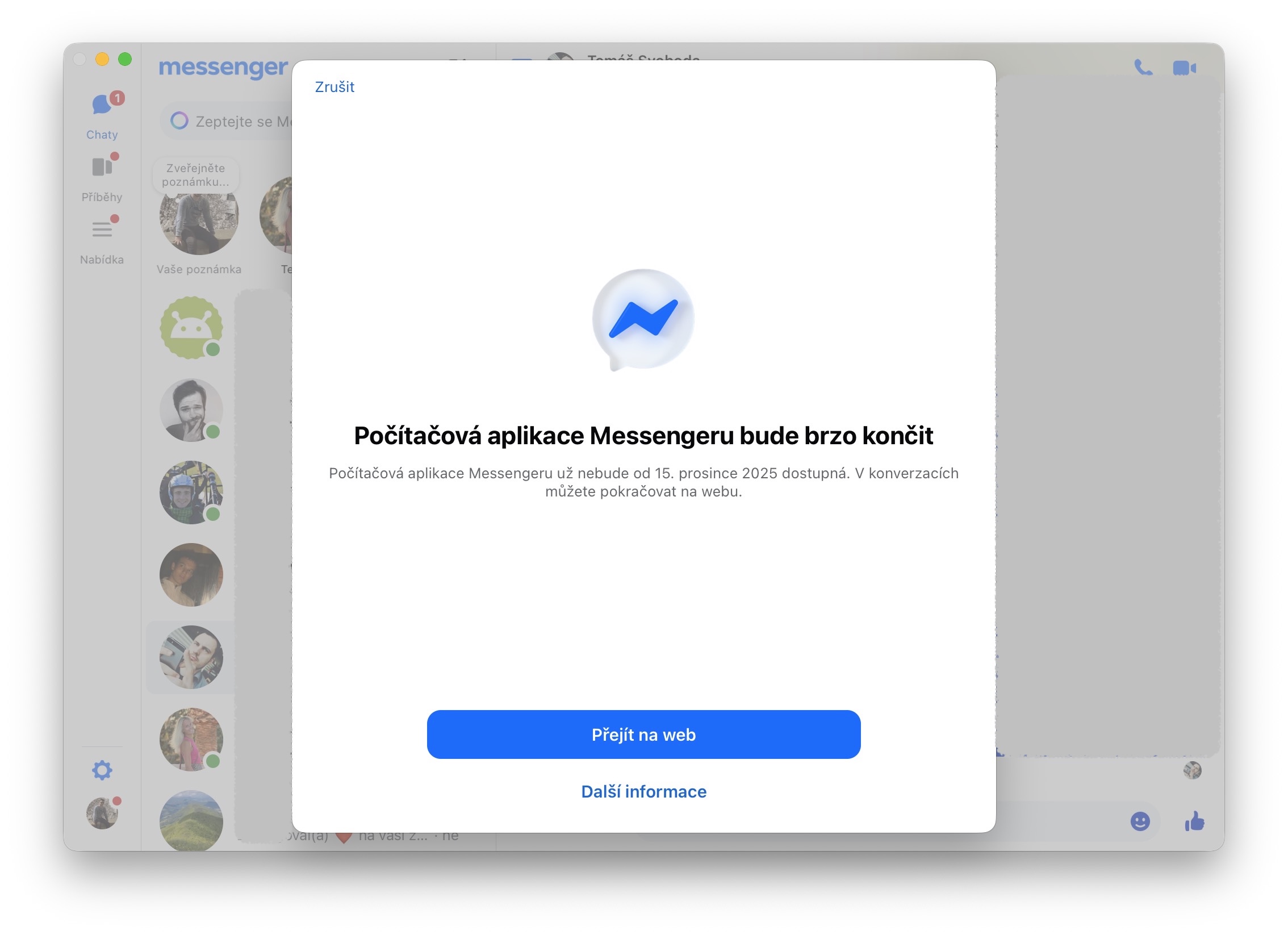 Pokud používáte na macOS či Windows aplikaci Messenger pro komunikaci s vaším okolím, máme pro vás špatnou zprávu – fungovat vám bude už jen pár dní. Messenger totiž před časem oznámil, že stejnojmennou aplikaci pro počítače ukončuje s tím, že kdo chce službu z počítače využívat, bude to muset dělat přes webovou verzi. A pomyslný den D je už blízko. V aplikací jak na Windows, tak macOS se totiž začaly zobrazovat upozornění na to, že od 15. prosince už nebude počítačový Messenger dostupný s tím, že uživatelé mají přejít právě na web. Naštěstí však existuje i řada jiných klientů, na které lze Messenger napojit a následně je využívat stejně pohodlně jako tomu je nyní u macOS a Windows aplikací. I tak je to ale rozhodně škoda. Protože přeci jen, kdo je na tohle řešení zvyklý, přechod jinam mu chutnat nebude. Nedá se ale nic dělat.