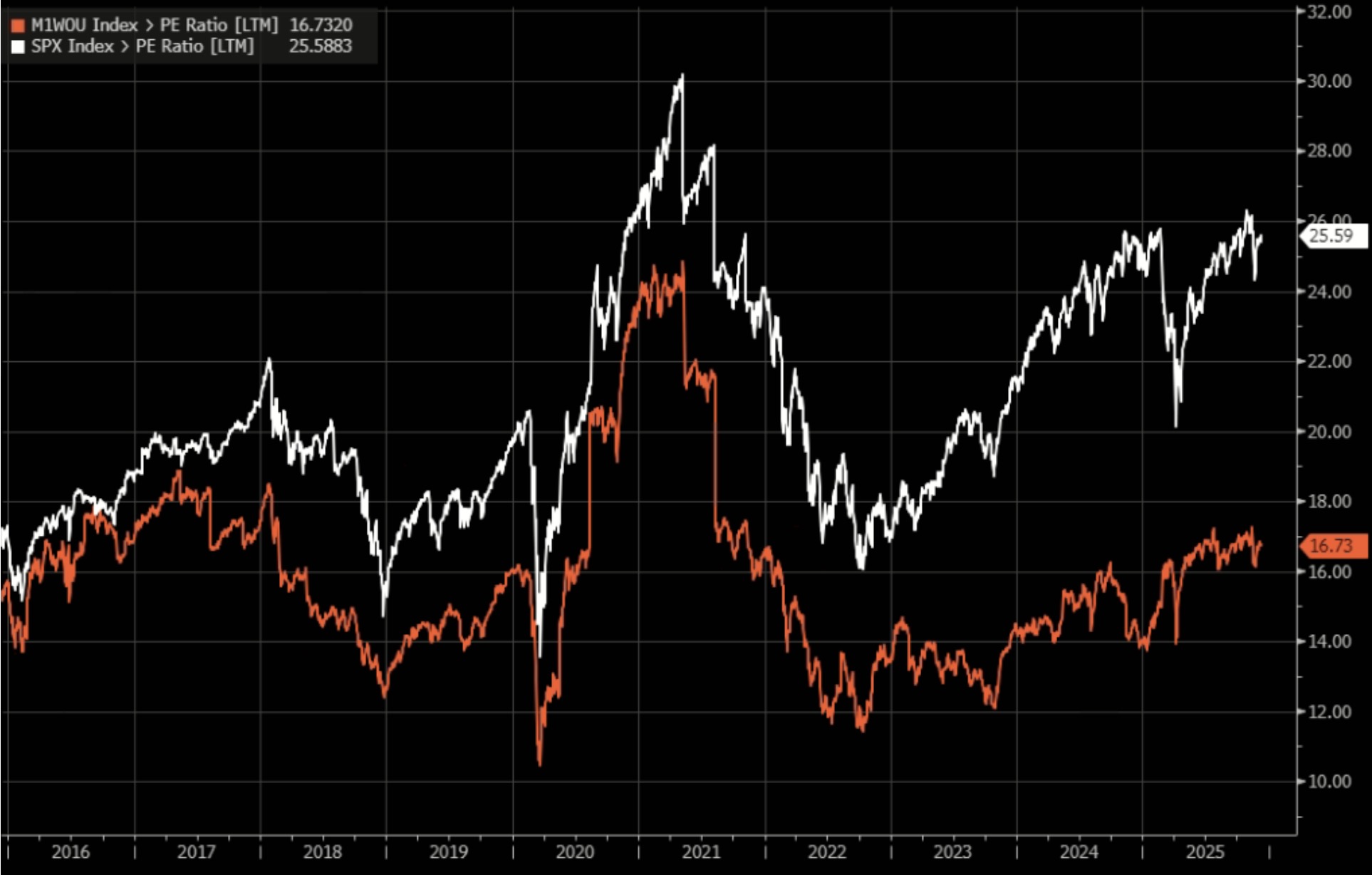 Jednou z odpovědí může být nadvážení globálního akciového trhu s výjimkou USA prostřednictvím ETF. Pokud se podíváme na ocenění indexů, vidíme, že index S&P 500 se obchoduje přibližně za 25,6násobek ročního zisku (bílá). To je výrazně více než průměr a ocenění se zvýšilo z 16 na 26násobek ve srovnání s minimem v roce 2022. Pokud se však podíváme na zbytek akciového trhu, obchoduje se za 16,7násobek zisku (oranžová). Tento index se v roce 2022 obchodoval za 12násobek zisku, takže se jedná také o nárůst ocenění, ale zdaleka ne tak velký jako v případě amerických akcií. Pokud se podíváme na graf ocenění, vidíme, že ocenění globálního indexu bez USA se pohybuje zhruba na svém dlouhodobém průměru. Je tedy pravda, že globální akcie jsou drahé, ale je to hlavně kvůli americkým akciím.