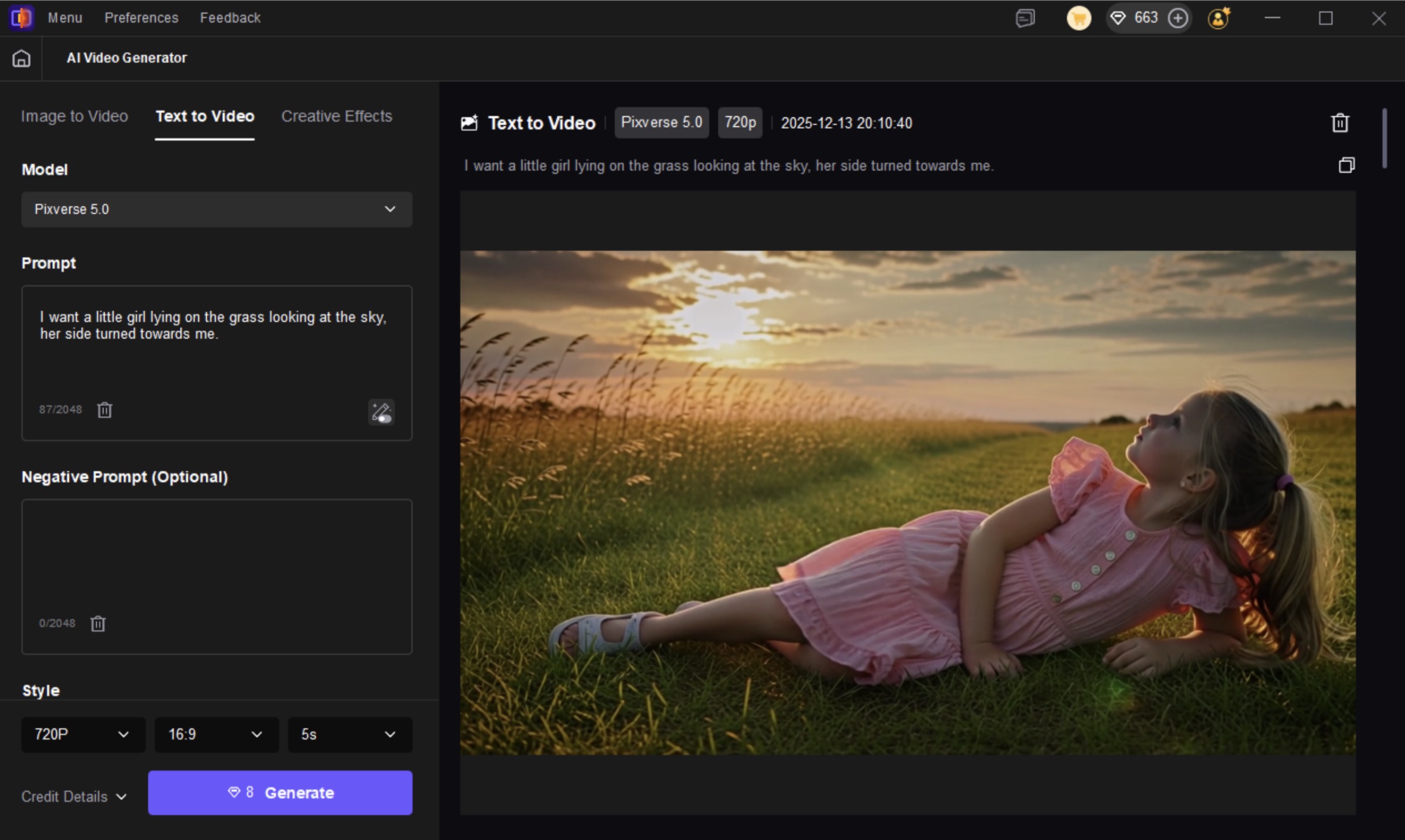 HitPaw VikPea také obsahuje generátor AI, který vytváří krátká videa z obrázků nebo textových podnětů. Umožňuje vám vybrat si z několika šablon, použít kreativní efekty a generovat klipy v rozlišení 1080p, které trvají 5–8 sekund, a to vše s obrázkem nebo podnětem.