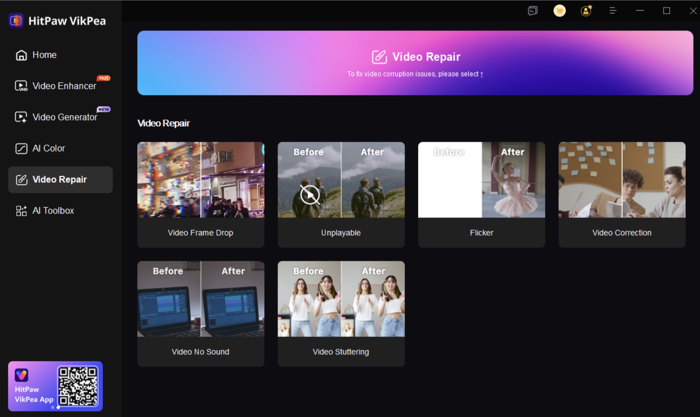 HitPaw VikPea obsahuje opravný systém vytvořený speciálně pro poškozená nebo poškozená videa. Umí opravit chybějící snímky, odstranit blikání, obnovit videa, která se odmítají přehrát, a vylepšit klipy bez zvuku nebo s výrazným zadrháváním.