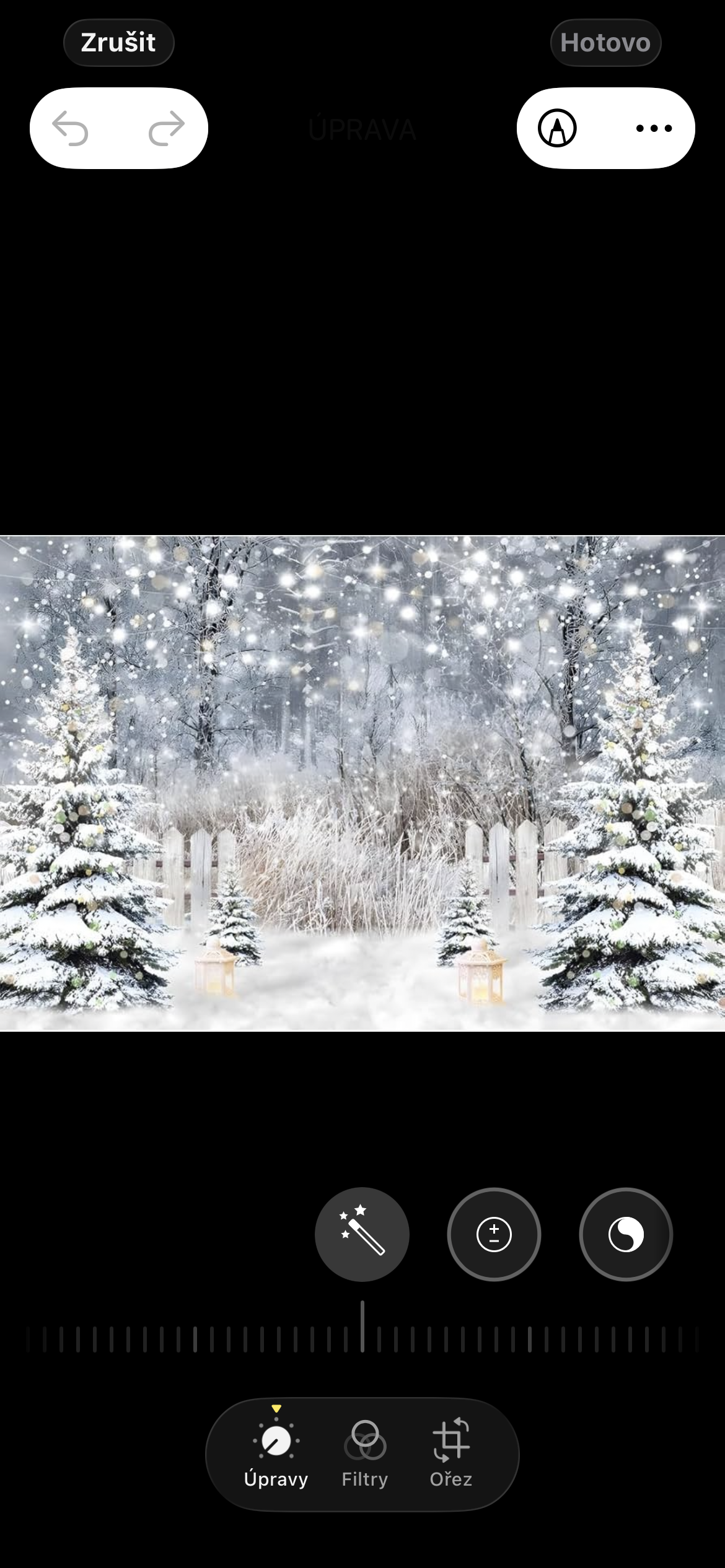 Začněte snímkem, který působí slavnostně. Může to být zimní krajina, rozsvícený stromek, detail ozdoby, světýlek, horké čokolády nebo klidný večer doma. Fotku otevřete a klepněte na ikonku posuvníků ve spodní části. Než se pustíte do doplňování textů a ozdob, je dobré doladit samotný vzhled snímku.