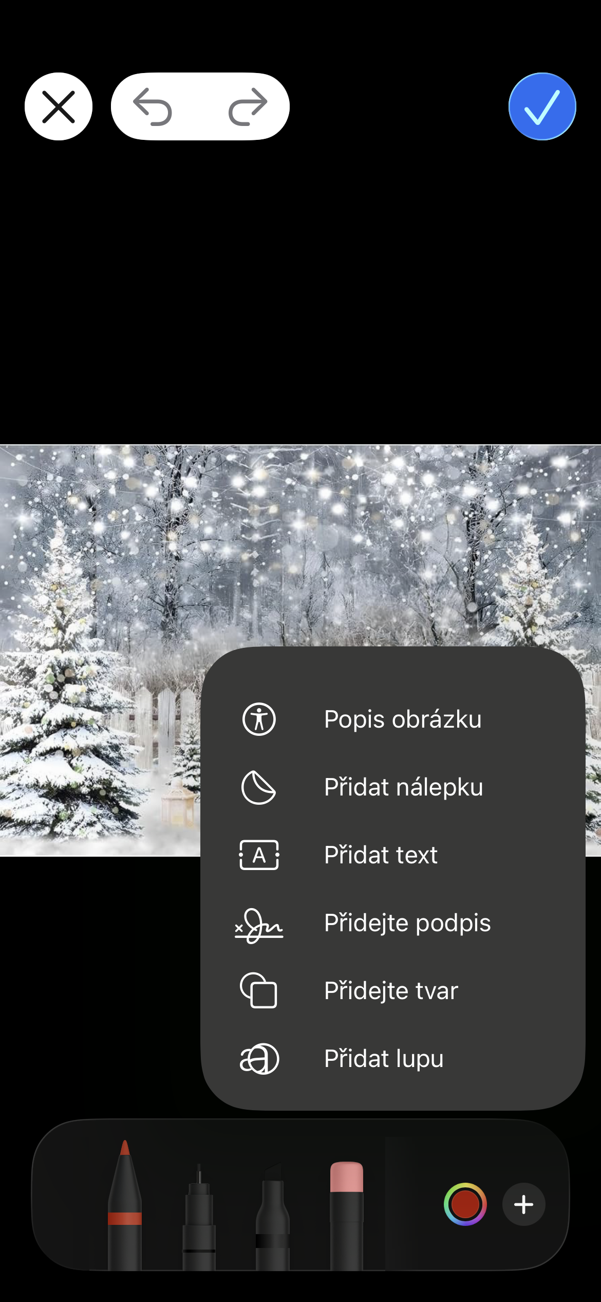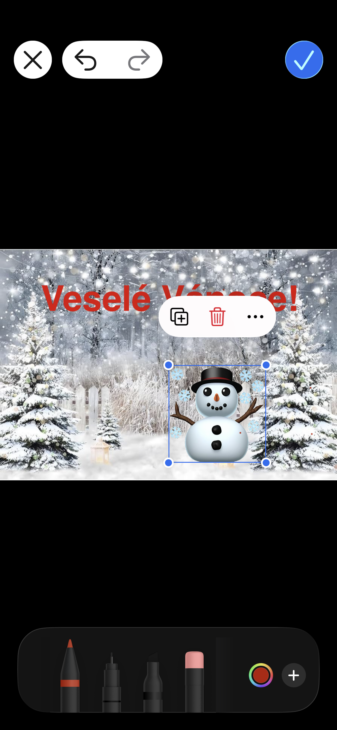 Pokud chcete přidat samolepku, postupuje obdobně, jen místo Přidat text zvolte Přidat nálepku. Samolepky jsou ideální pro doladění detailů – třeba malá hvězda nad stromečkem dodá obrázku skutečné kouzlo.