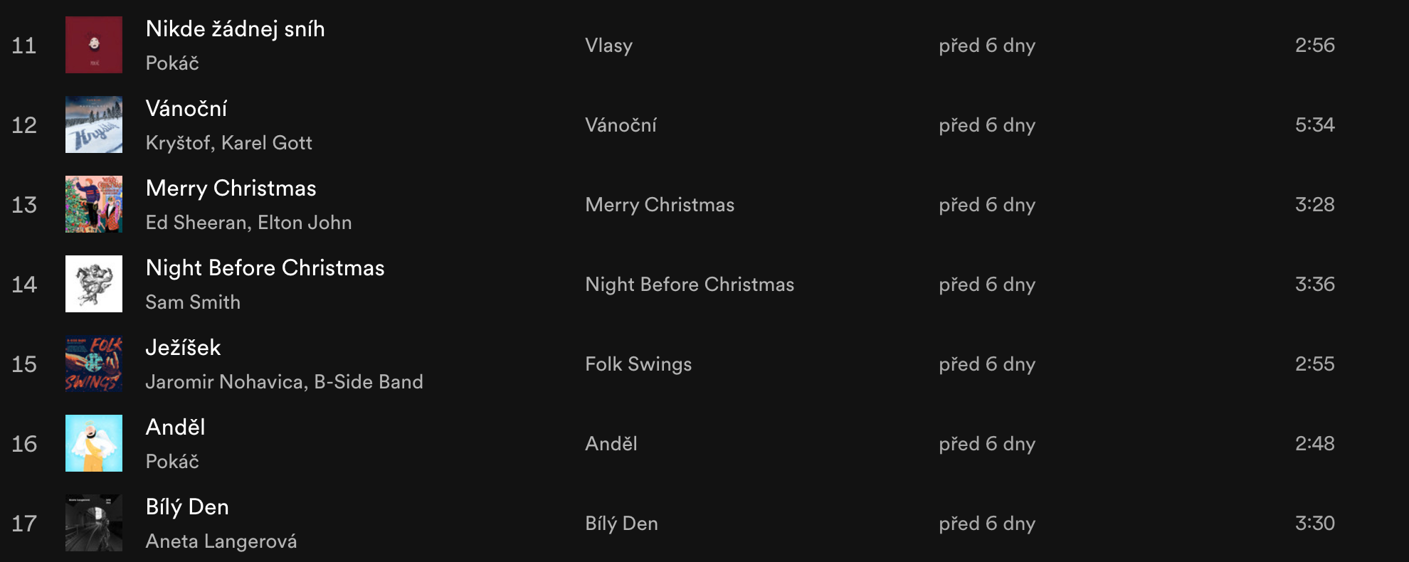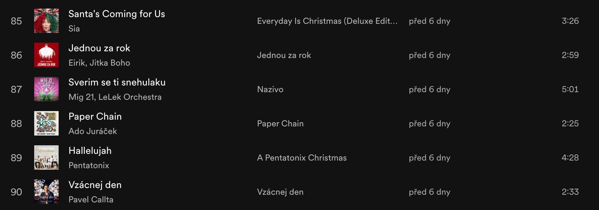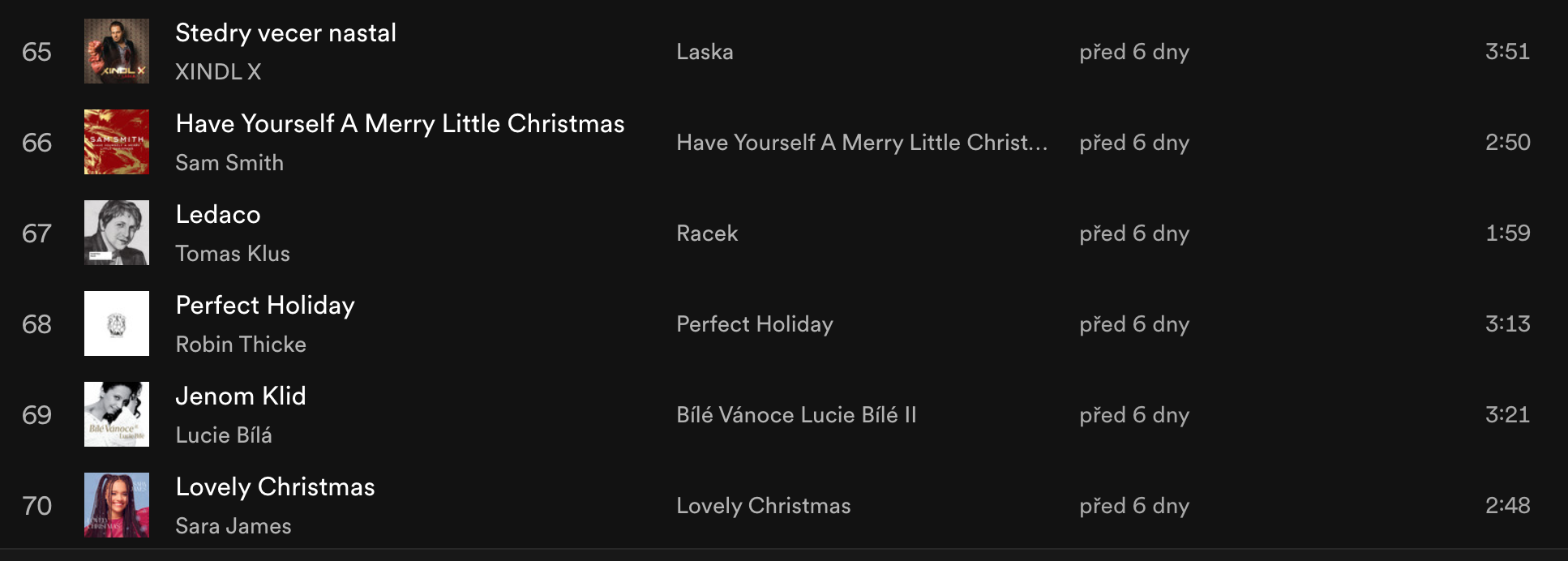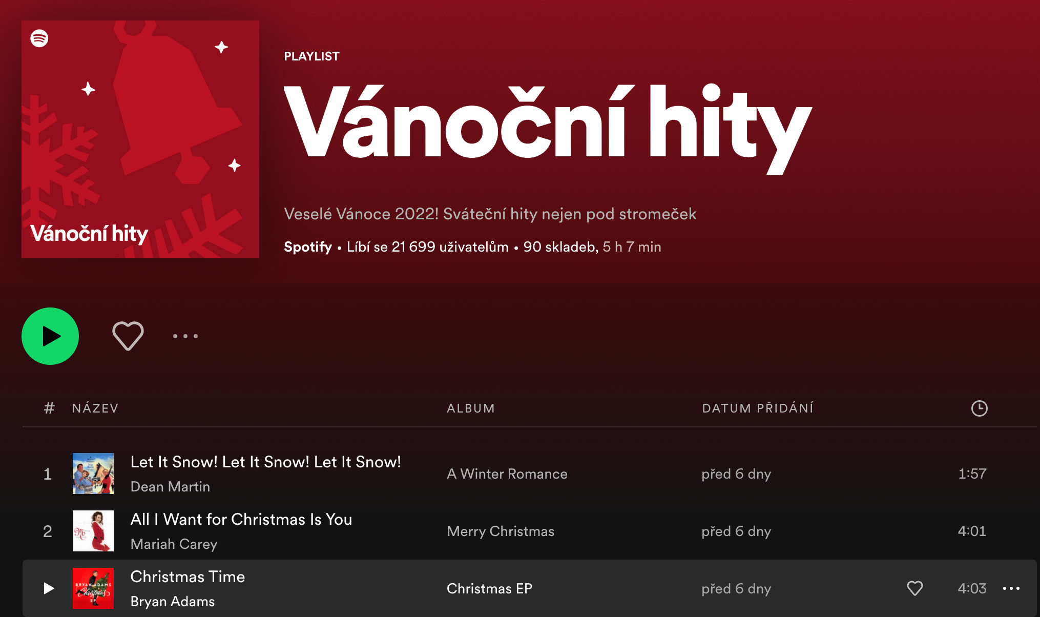 Spotify tento seznam pravidelně aktualizuje, takže se do něj dostávají i čerstvé novinky. Skvěle funguje při pečení cukroví nebo balení dárků – prostě v momentech, kdy potřebujete hudbu, která vás zahřeje u srdce.