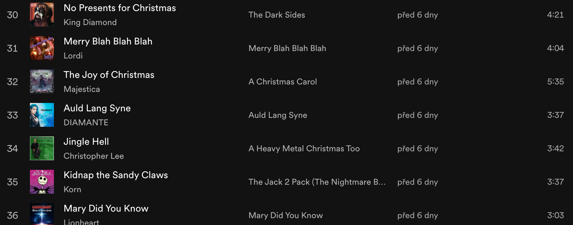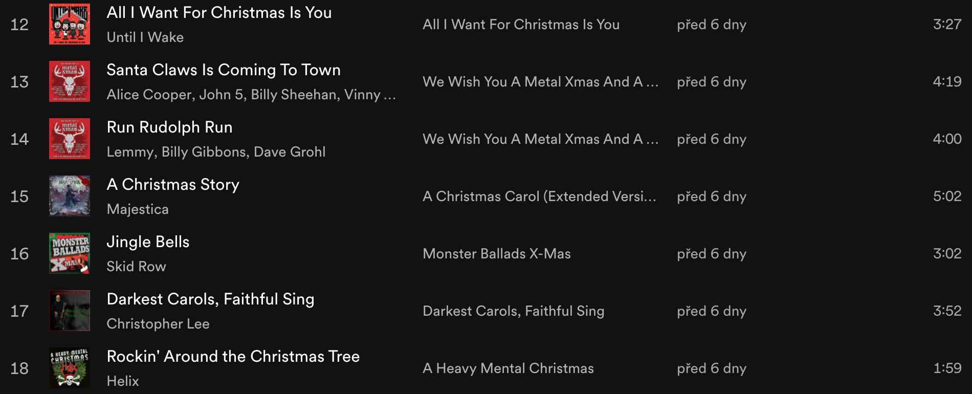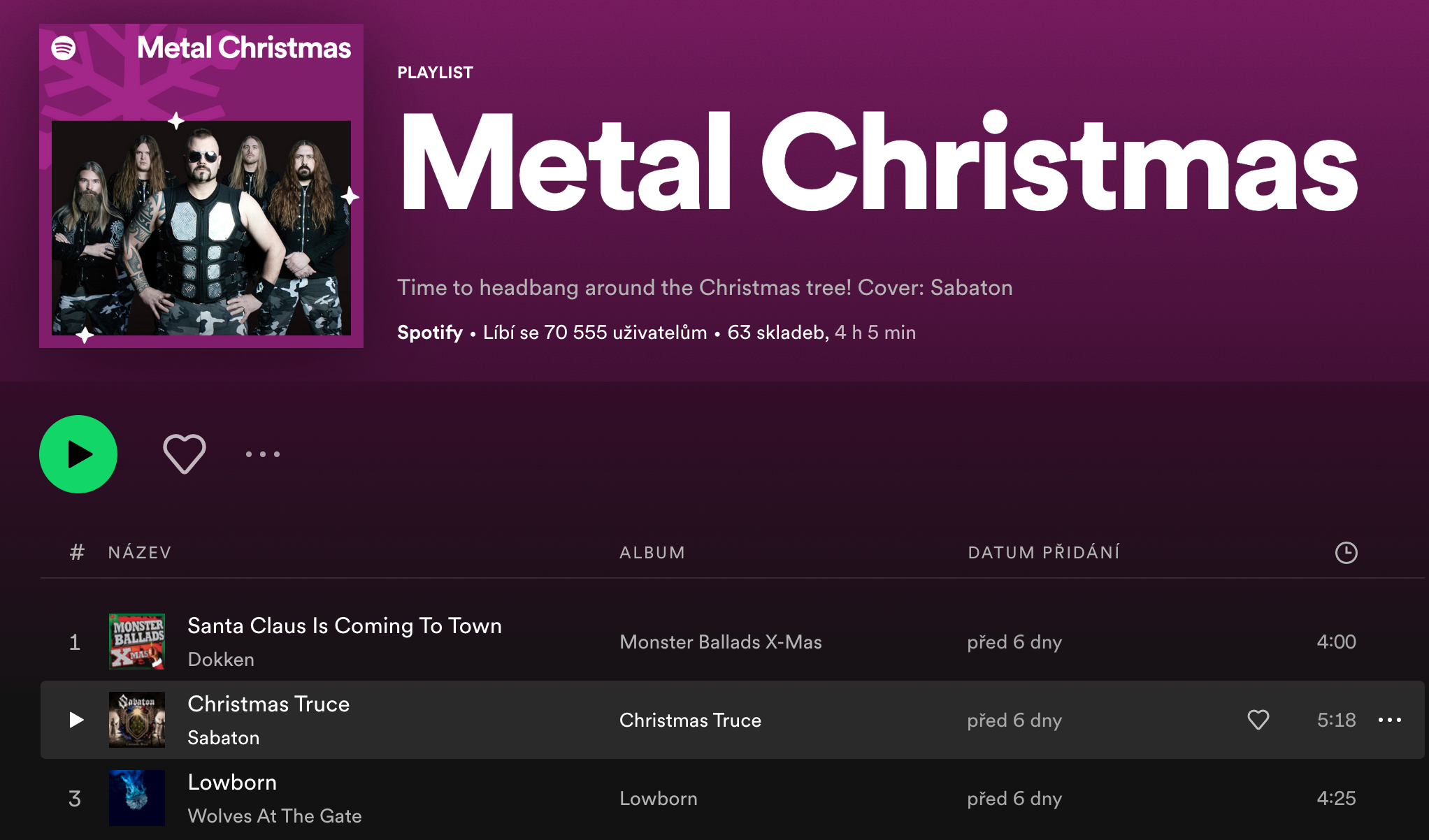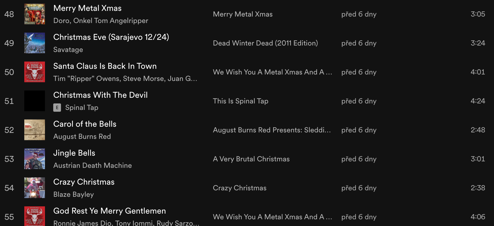 Ano, i metalisté mají své Vánoce. A Spotify myslí i na ně – playlist Metal Christmas přináší hutné riffy, bicí i pořádnou dávku sarkasmu. V seznamu nechybí Austrian Death Machine, Ronnie James Dio, Blind Guardian nebo Sabaton. Pokud vám to nestačí, uživatelé Spotify vytvořili i další tematické kousky jako Death Metal Christmas či Grindcore Christmas. Kdo říká, že Tichá noc musí být za všech okolností tichá?