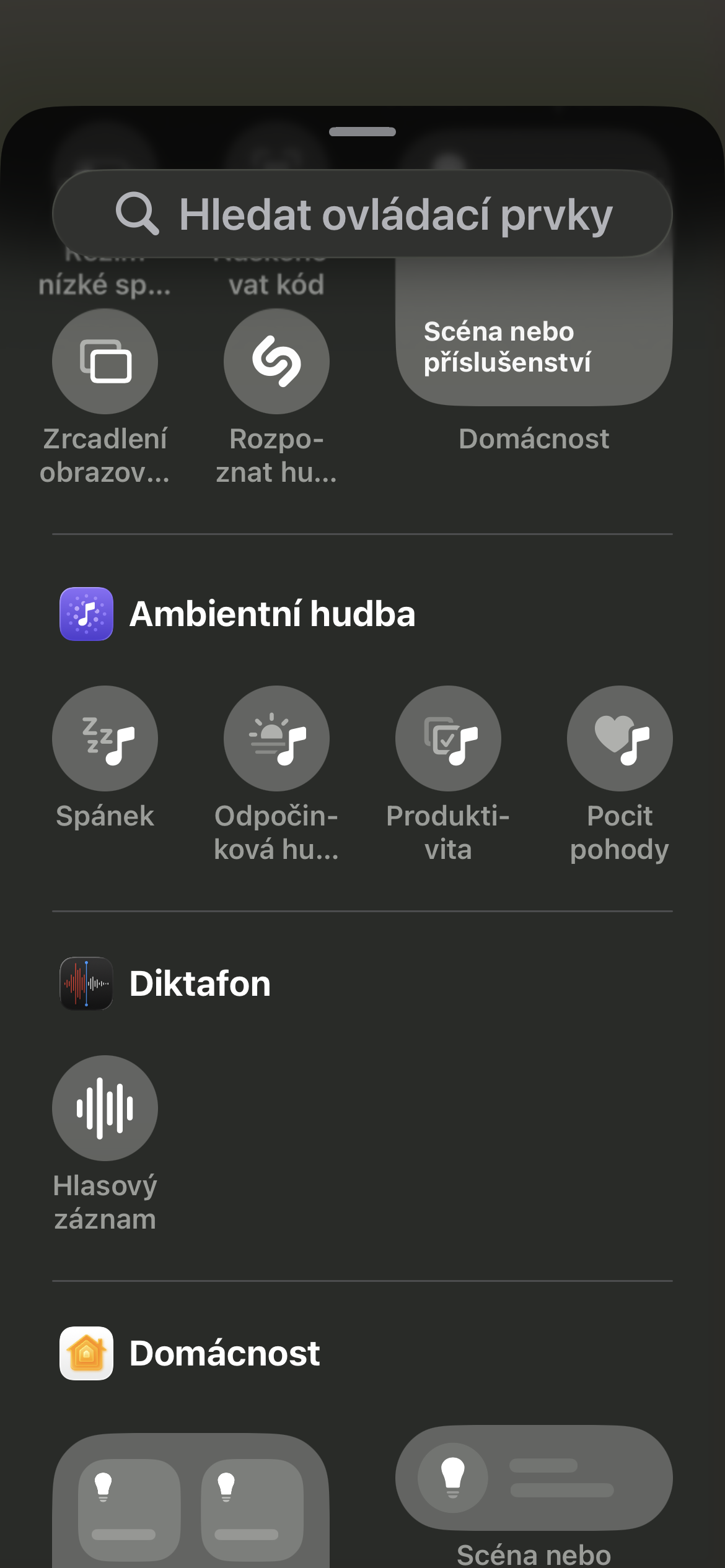 Funkce Ambient Music je dostupná přímo v Ovládacím centru. Stačí si ji při jeho úpravě přidat vedle známé ikony Shazam pro rozpoznávání hudby. Poté už jen jedním klepnutím vyberete některý ze čtyř playlistů podle aktuální nálady a potřeby: Spánek, Odpočinková hudba, Produktivita a Pocit pohody.