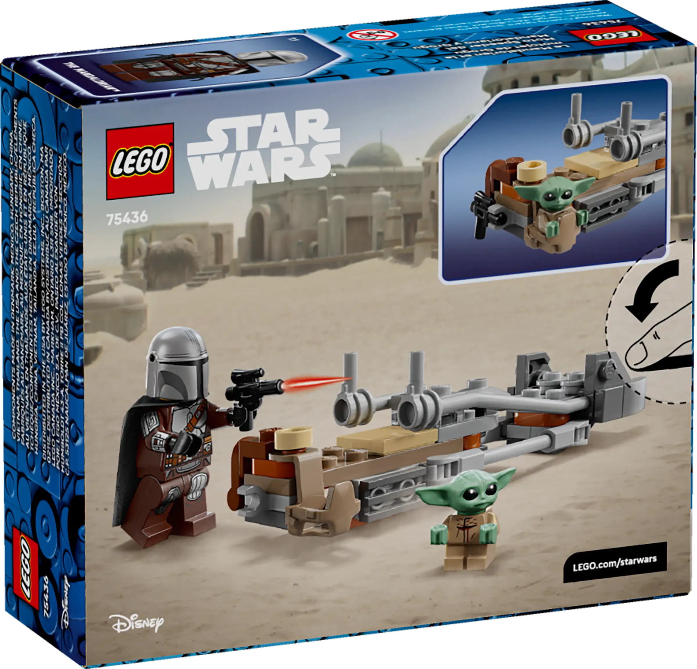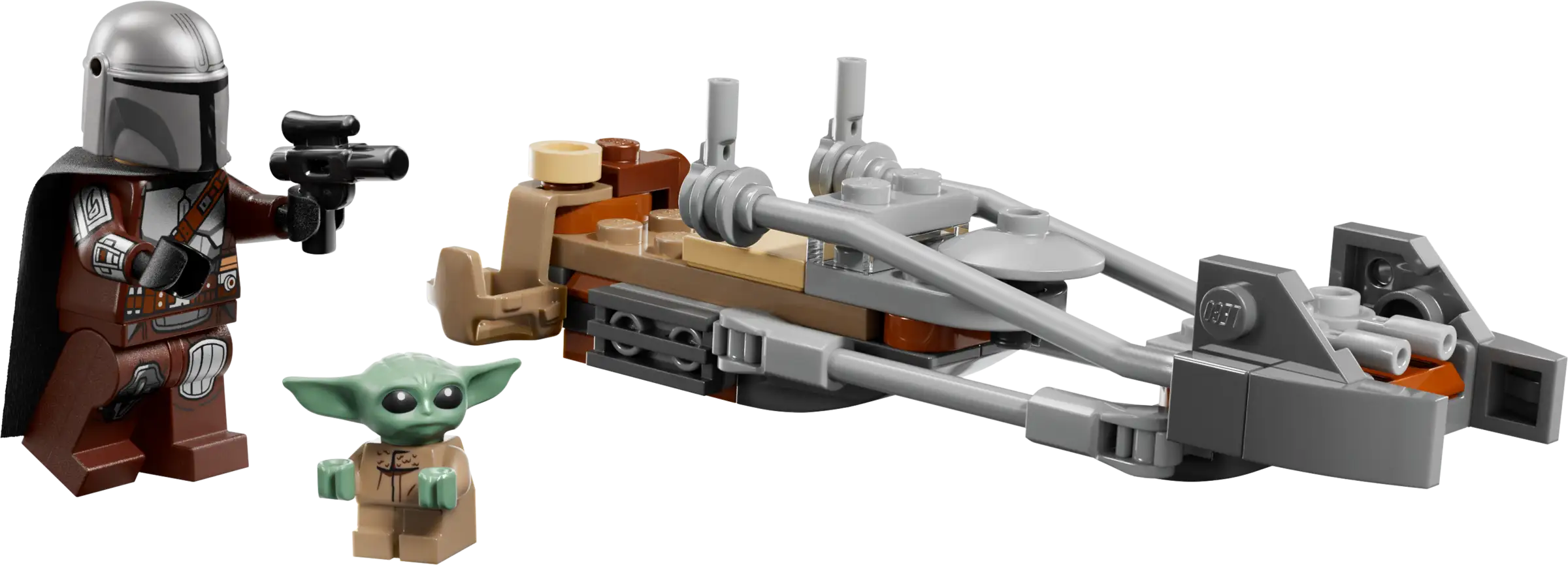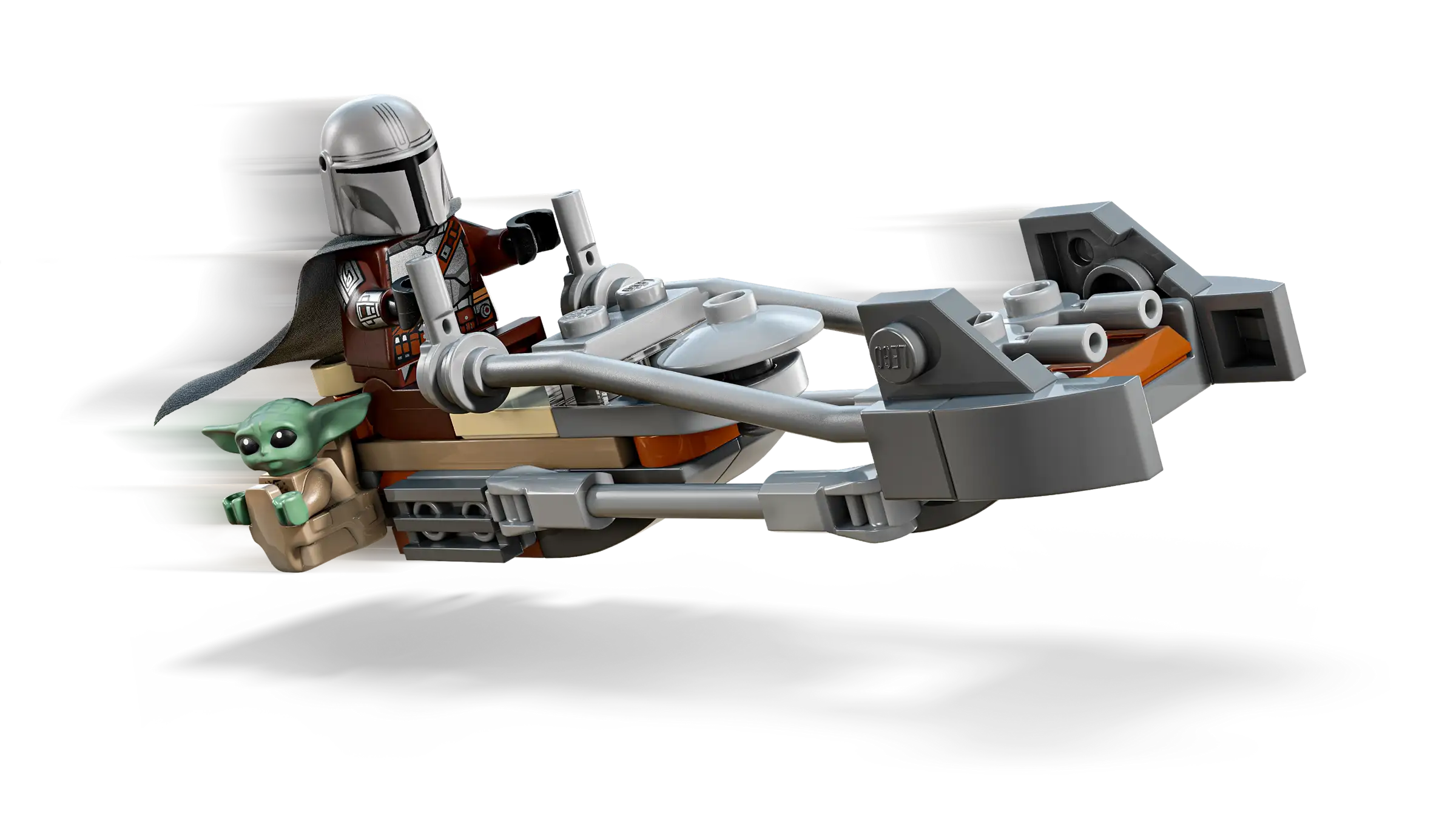 S touto stavebnicí Mandalorian a Grogu a spídrová motorka si děti od 6 let snadno připomenou akční scény z planety Tatooine. Model nabízí spídrovou motorku s místem pro Mandaloriana za řídítky a brašnou pro Grogua, nechybí ani blasterová puška připevněná na zadní část vozidla.