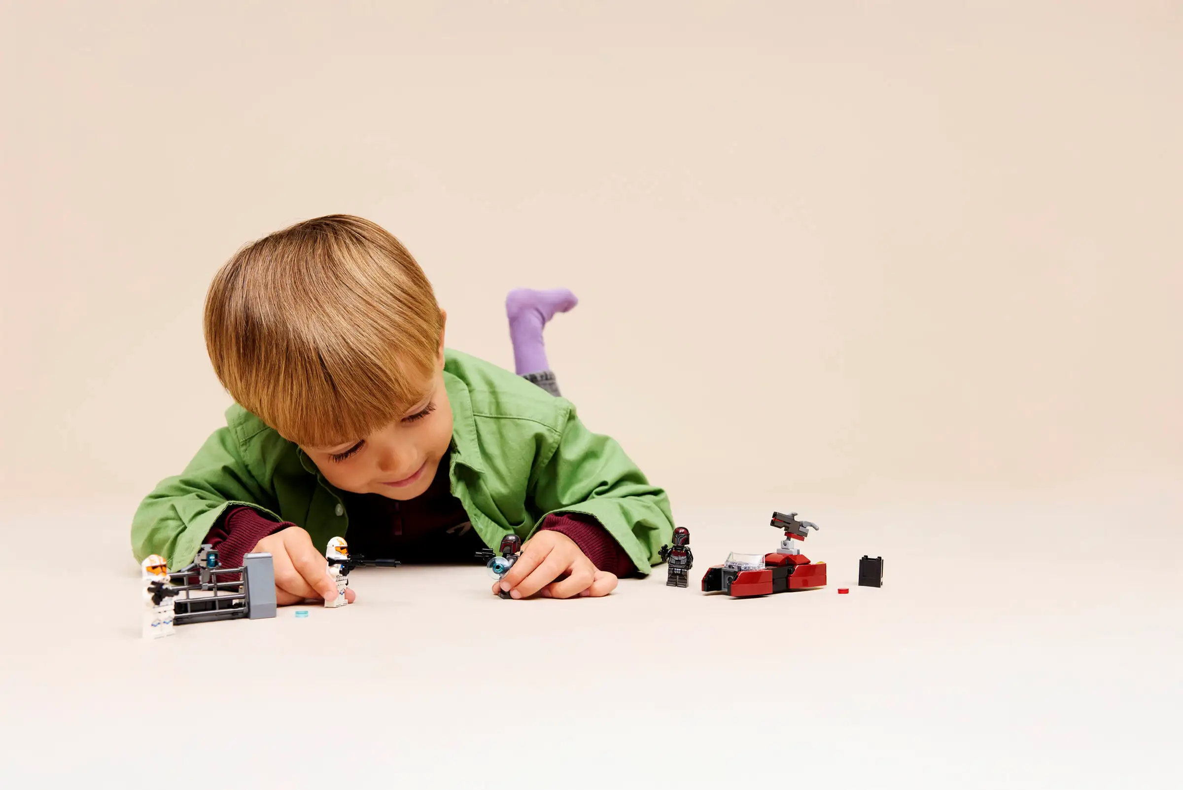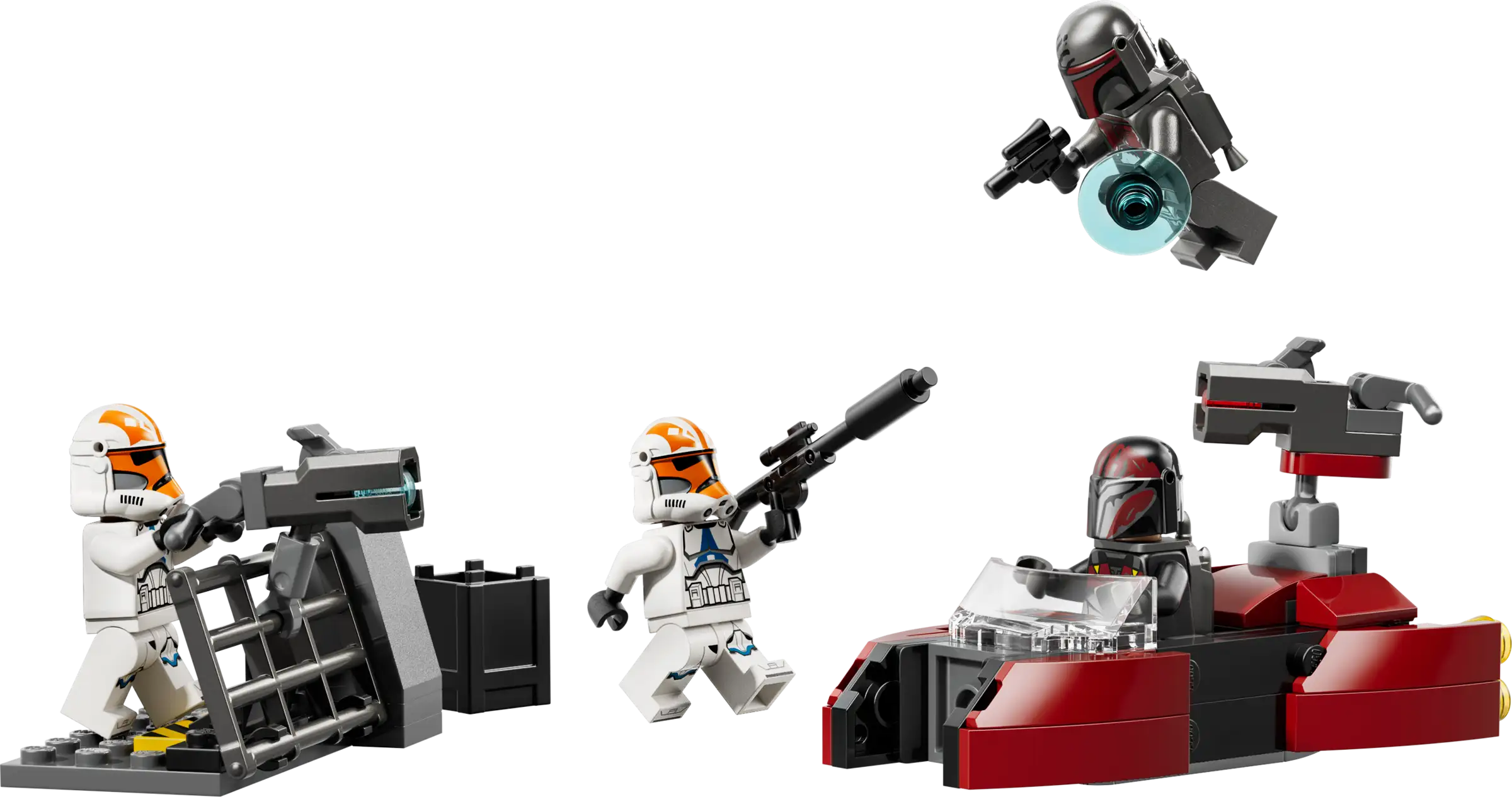 Bitevní balíček obléhání Mandalore potěší každé dítě, které miluje svět Star Wars a chce si přehrát vlastní verzi slavného střetu z Klonových válek. V krabici najdete čtyři minifigurky – dvojici příslušníků mandalorianského super komanda a dva vojáky 332. legie – spolu s jejich výbavou, spídrem a malou barikádou. Doplňky i vystřelovače přímo vybízejí k akčnímu hraní a děti mohou zapojit i tryskové batohy pro útok ze vzduchu.