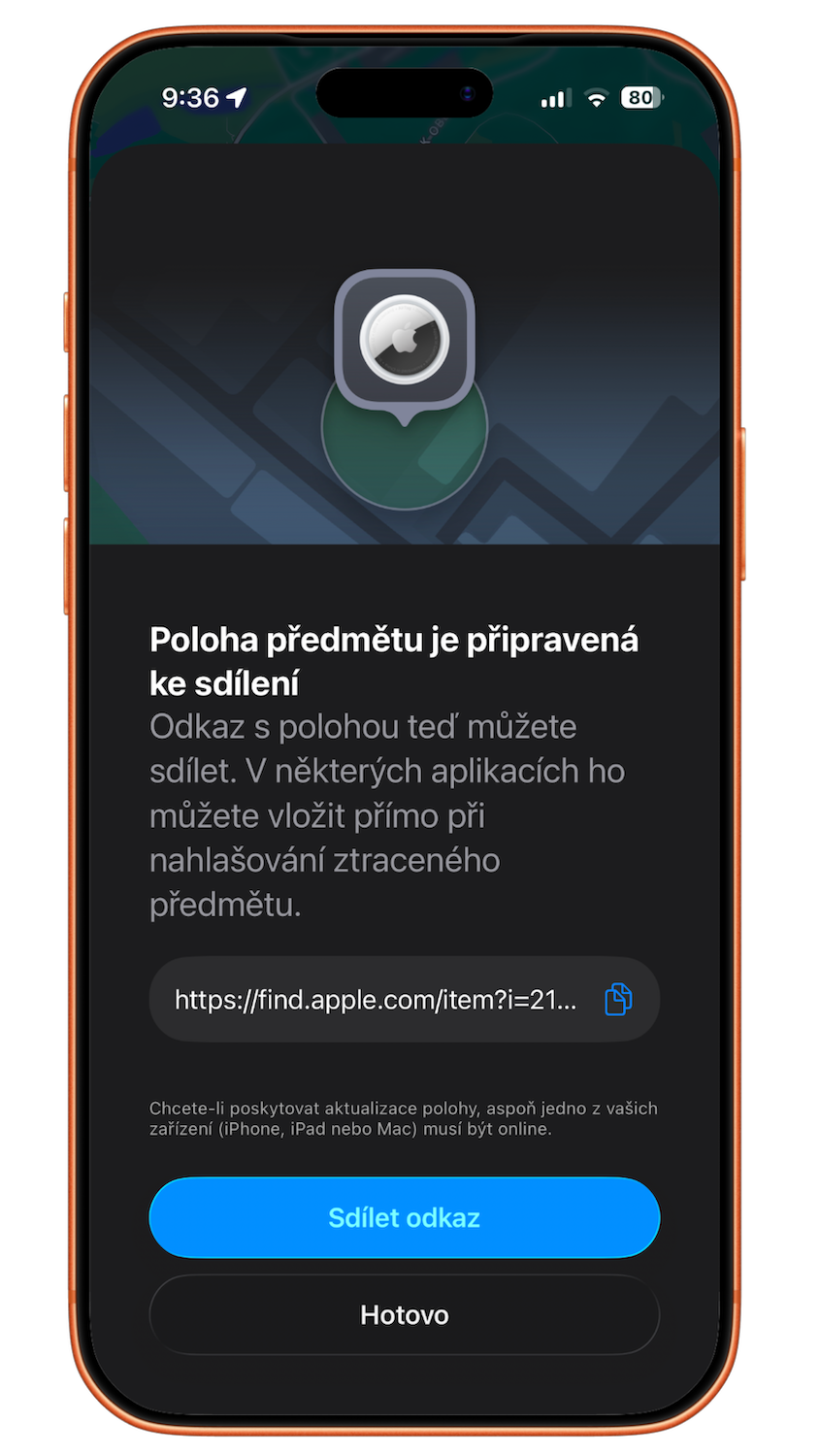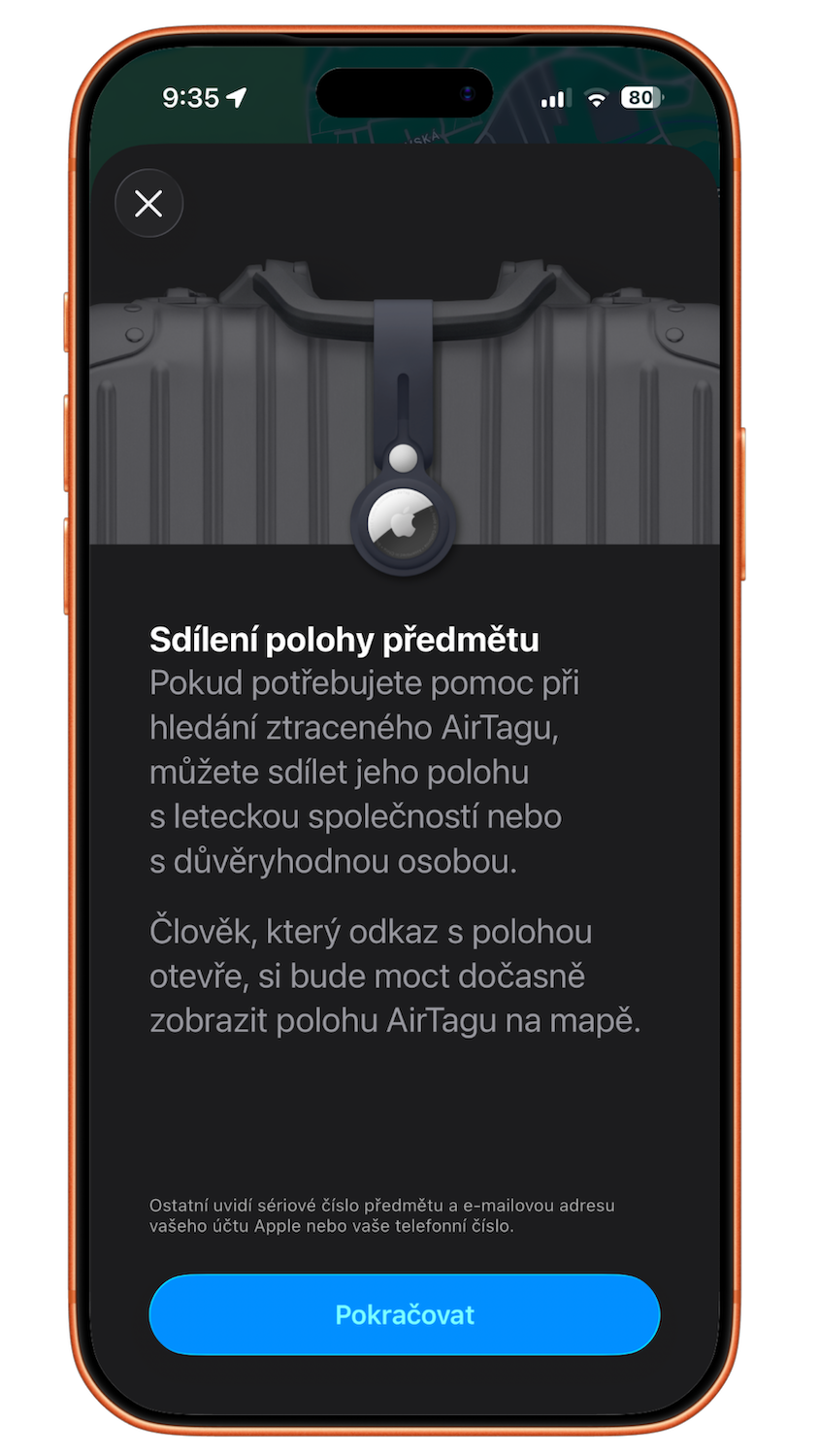 Pokud si do kufru umístíte AirTag, můžete jeho aktuální polohu sdílet pomocí odkazu v aplikaci Najít (Find My). Letecký personál si pak může otevřít mapu s přesnou pozicí zavazadla, což zrychluje dohledání v případě ztráty či zpoždění. Sdílení se automaticky ukončí po sedmi dnech nebo ve chvíli, kdy se s kufrem znovu setkáte.