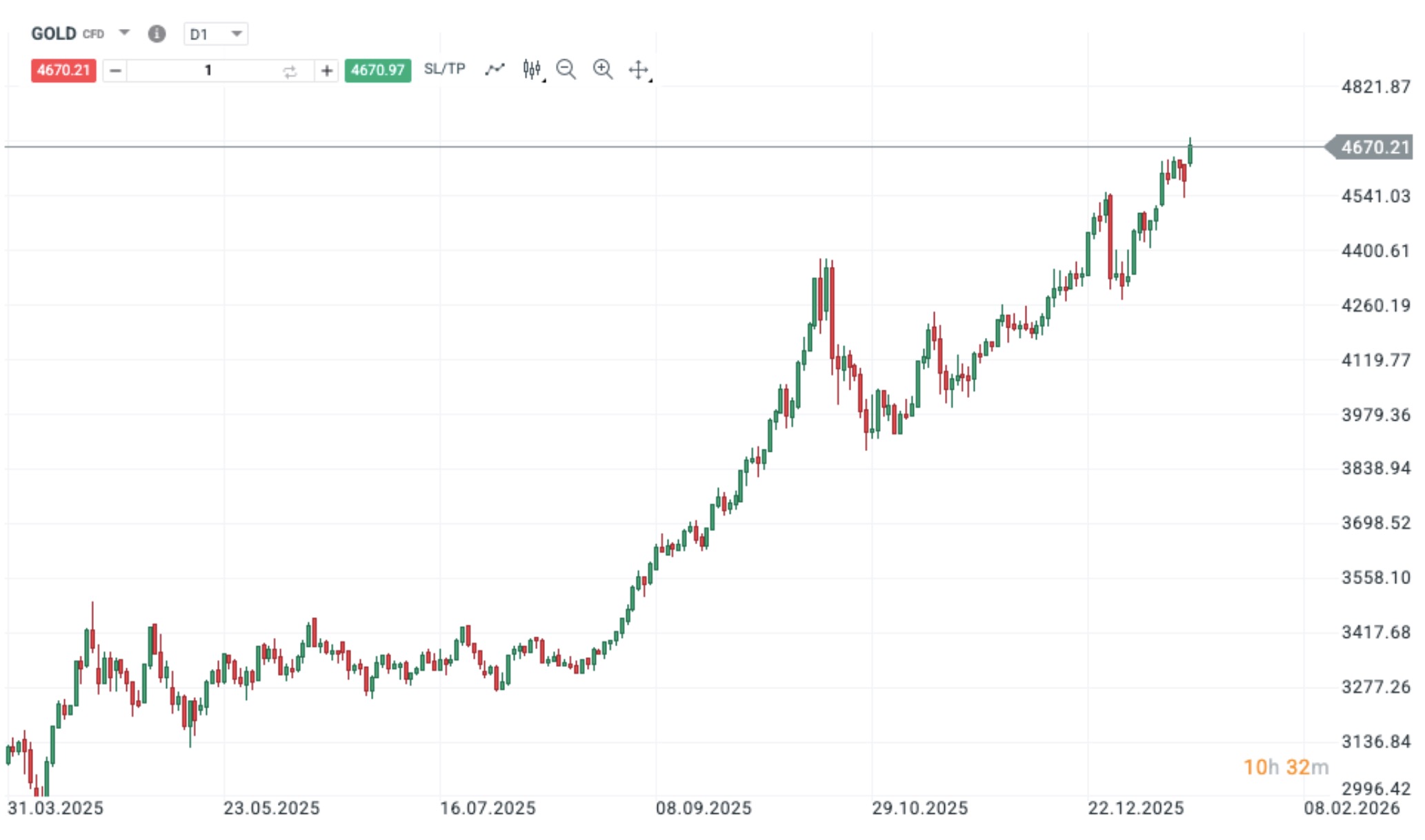 Vývoj ceny zlata (GOLD CFD). Zdroj: Investičná aplikácia XTB. Minulé výsledky nie sú spoľahlivým ukazovateľom budúcich výsledkov.