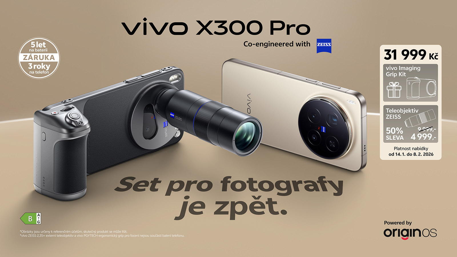 Současná akce dělá z vivo X300 Pro ještě zajímavější nabídku. Telefon nyní pořídíte u vybraných prodejců za 31 999 Kč a jako bonus k němu získáte Grip Kit v hodnotě 4 999 Kč zcela zdarma. Ten zlepšuje ergonomii při focení a natáčení videa a ocení ho každý, kdo bere mobilní fotografii vážně. Ještě o krok blíže profesionální fotografii vás posune nabídka na rozšiřující teleobjektiv ZEISS, který lze se slevovým kódem pořídit s 50% slevou za 4 999 Kč. Akce platí už jen do 8. února.