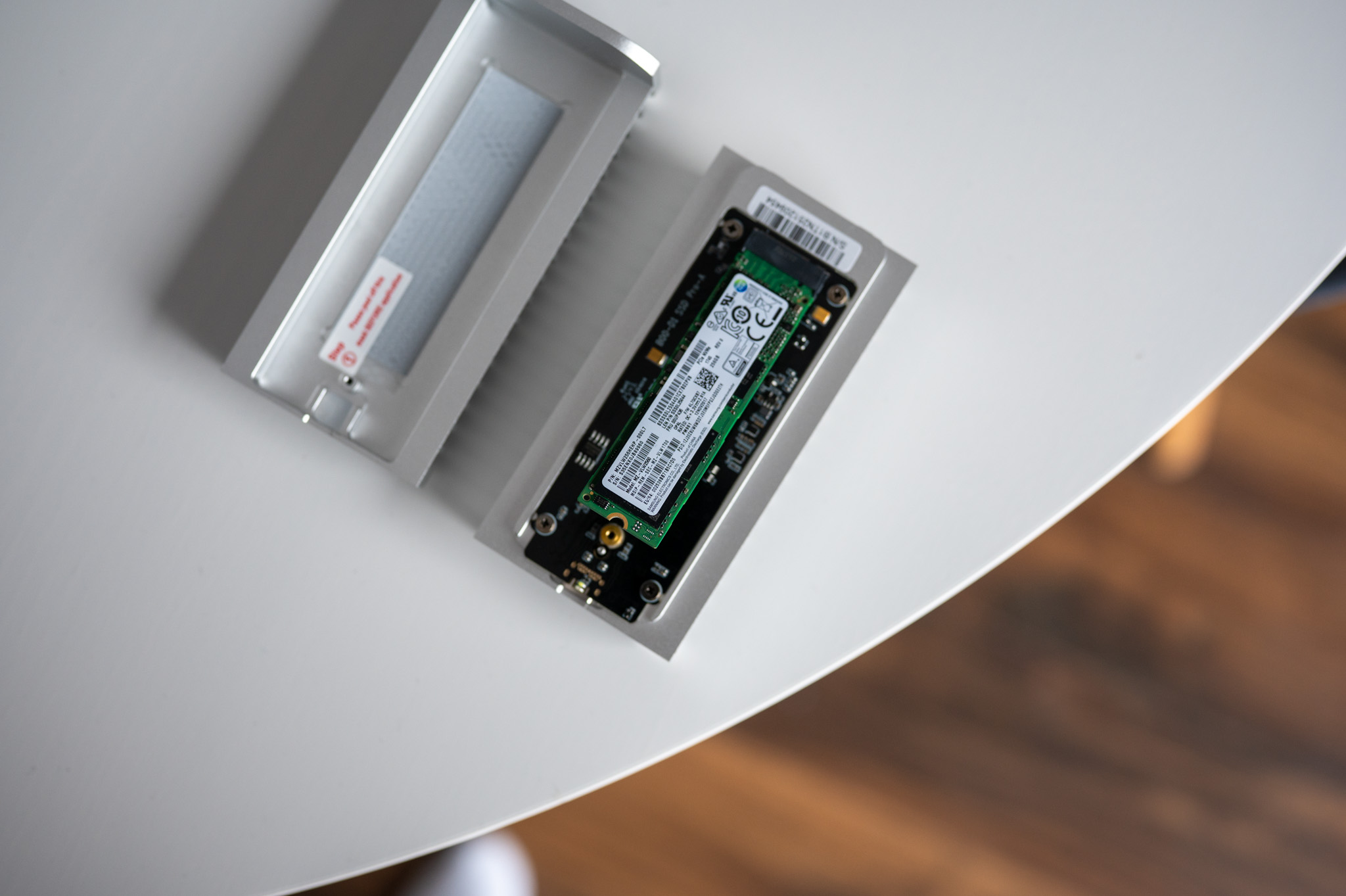 D1 SSD Pro na první pohled vypadá jako další externí box na SSD, jenže tenhle dojem mi vydržel jen pár minut po vybalení. Jakmile ho vezmete do ruky, je jasné, že tohle není levná krabička, ale poctivý kus hardwaru, který cílí úplně jinam než běžné externí disky. Hmotnost, chladný hliník a celkové zpracování dávají okamžitě najevo, že tady se hraje na výkon a dlouhodobou zátěž, ne na líbivý design do vitríny.