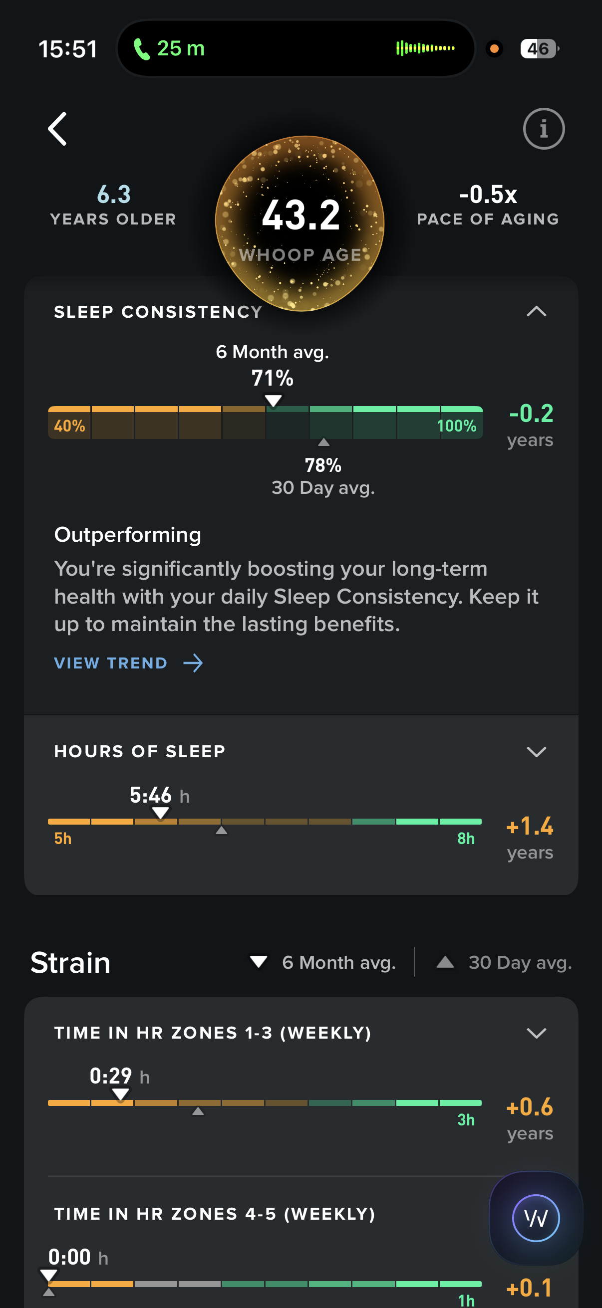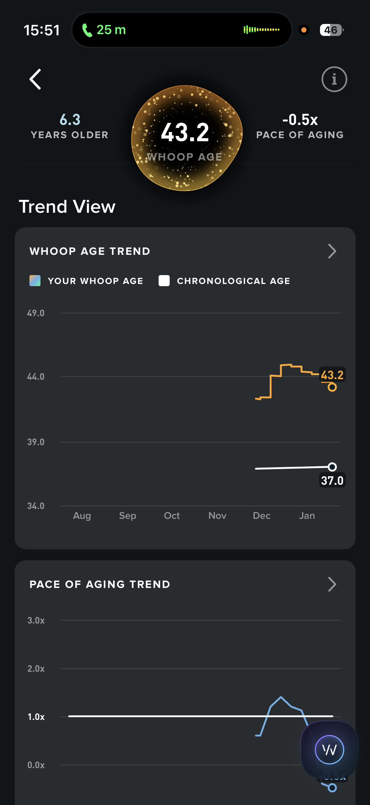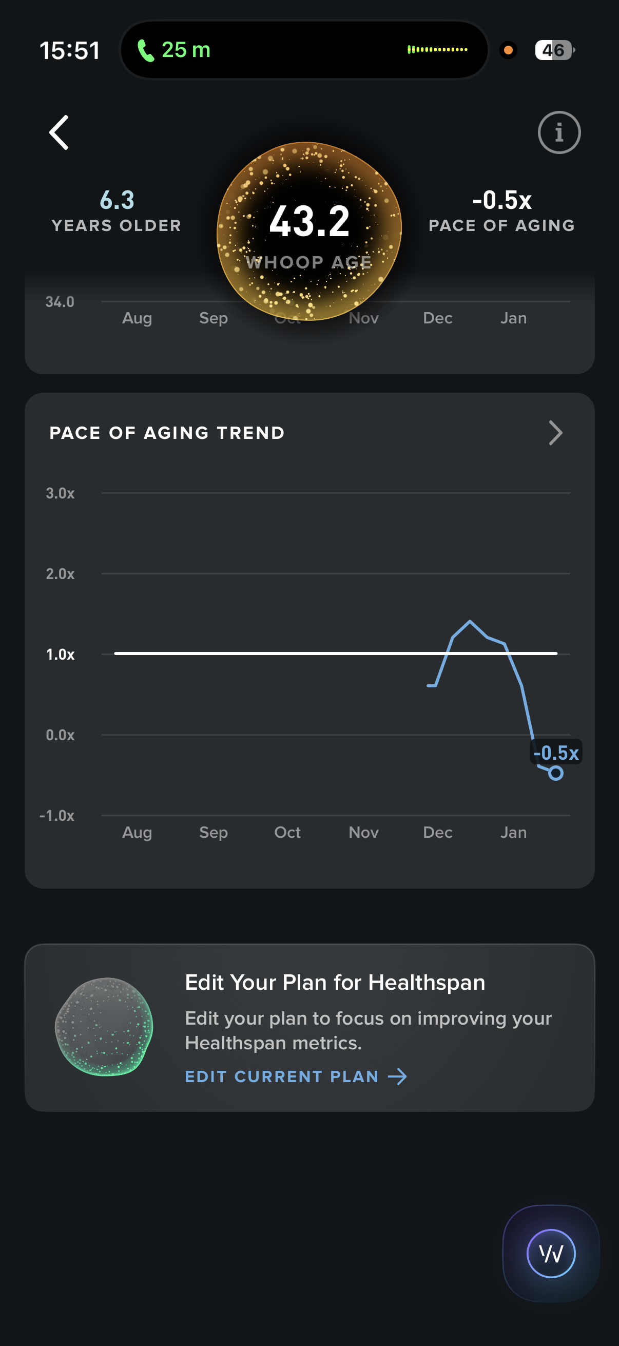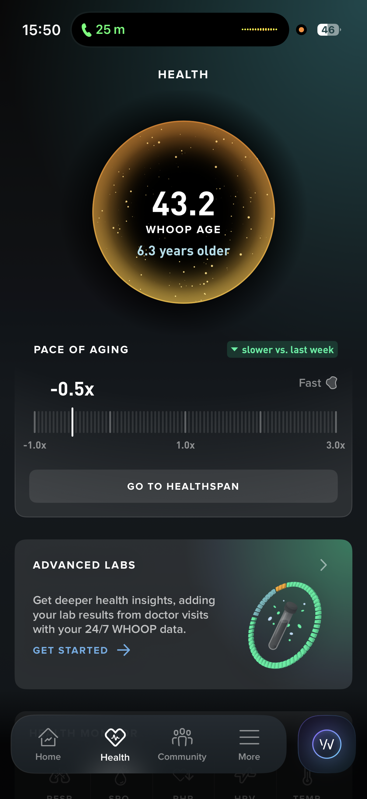 Za oněch 399 € mám k dispozici vše, co Whoop umí. To zahrnuje měření EKG, upozornění na nepravidelný srdeční rytmus, denní odhad krevního tlaku, klidovou tepovou frekvenci, HRV, frekvenci tepu během celého dne, respirační frekvenci, teplotu kůže, délku spánku, spánkové fáze, Sleep Score, Recovery Score, doporučenou potřebu spánku, denní zátěž (Strain), automatickou detekci aktivit, VO₂ max, kardio zátěž, denní připravenost k výkonu, Healthspan (biologický věk), Pace of Aging neboli rychlost stárnutí a trendy jejího vývoje. Důležité je si uvědomit, že veškerá data jsou sbírána 24/7/365. Pokud navíc Whoop představí během vašeho předplatného nějaký nový lepší náramek, tak jej získáte zdarma, pokud máte nejvyšší předplatné, pokud nižší, získáte možnost výhodně přejít na vyšší členství.