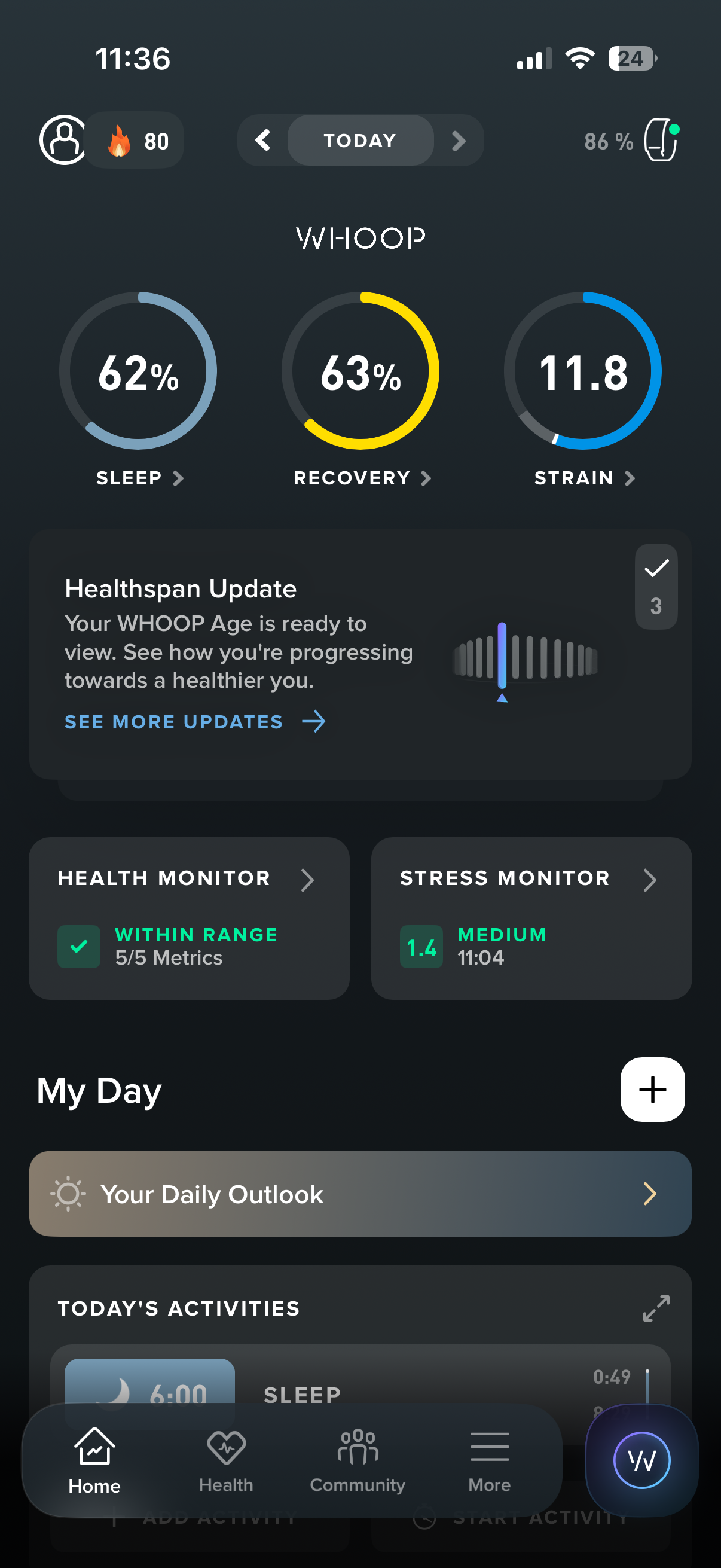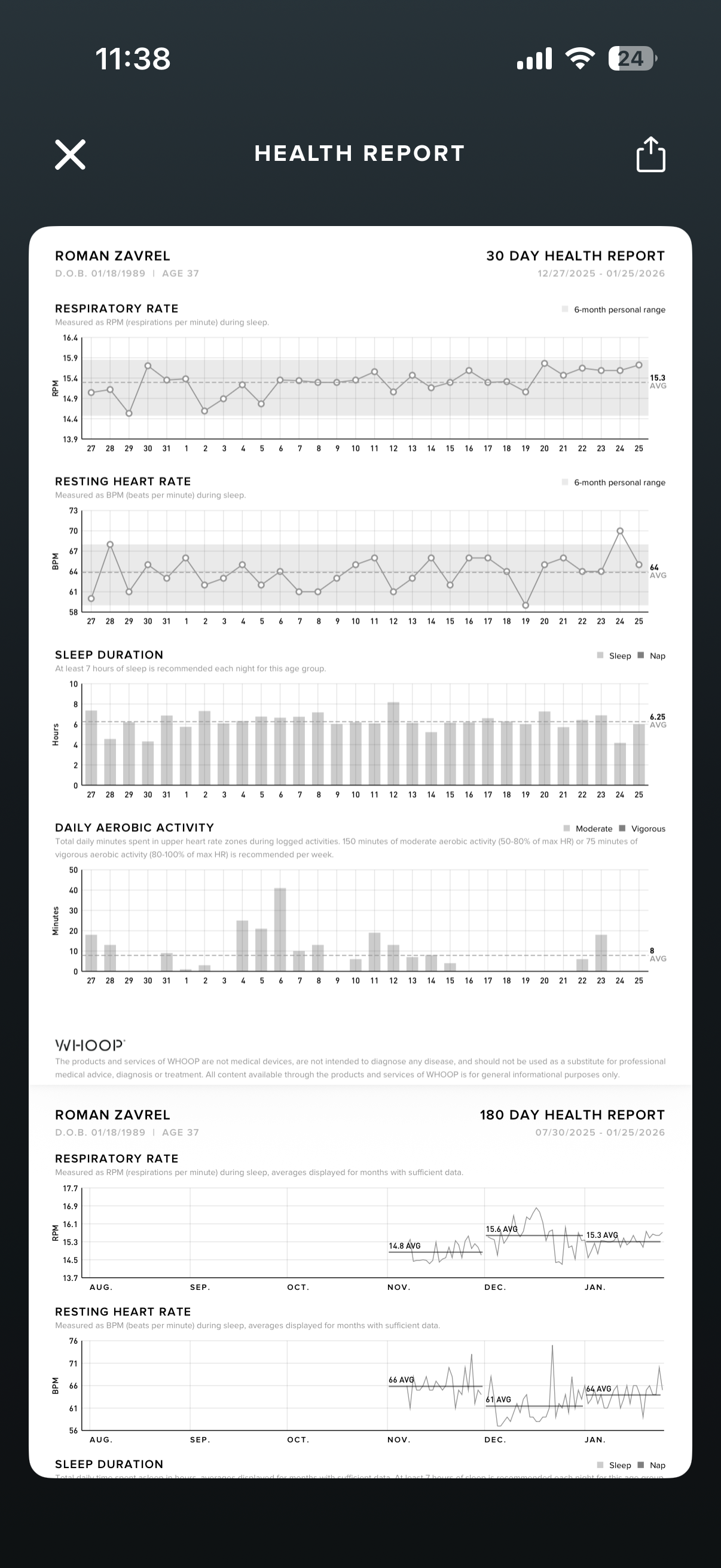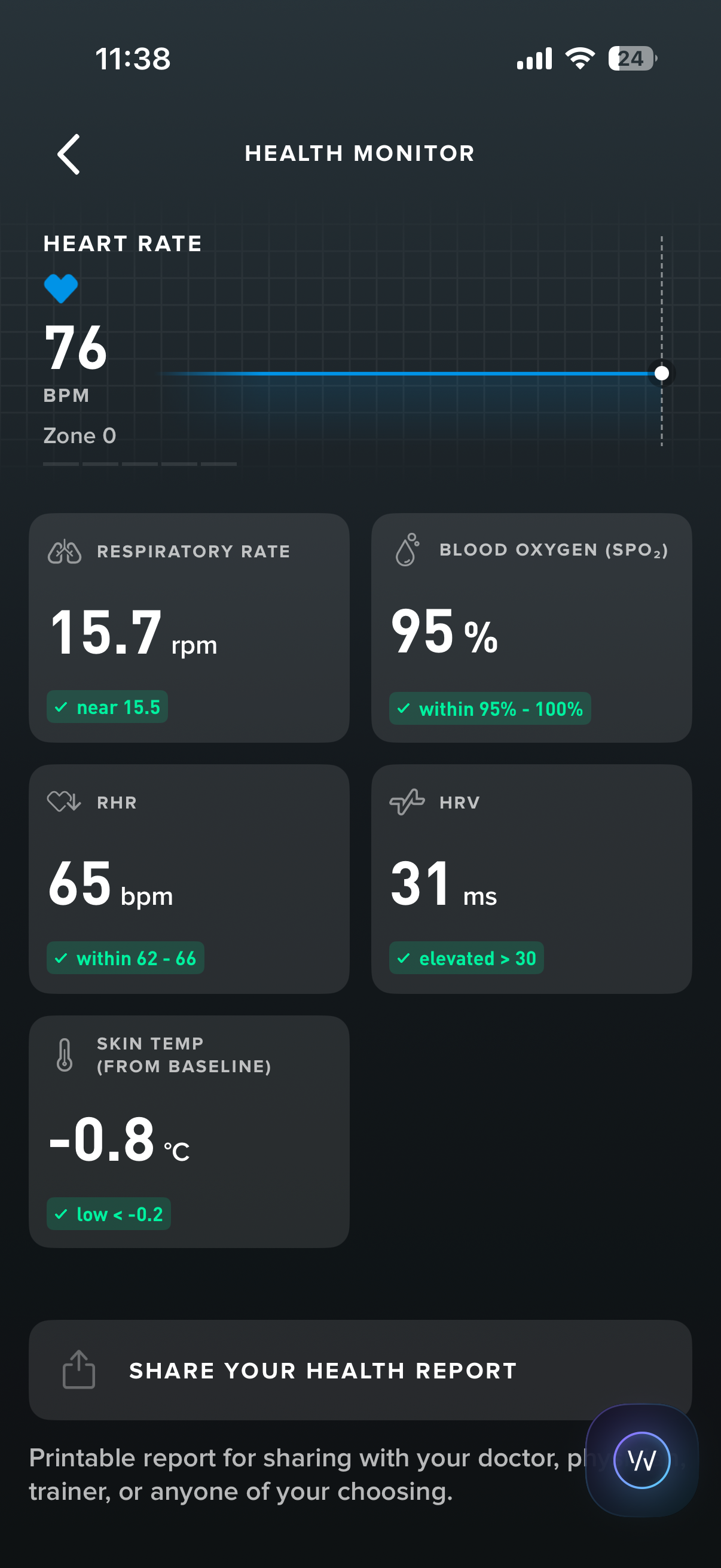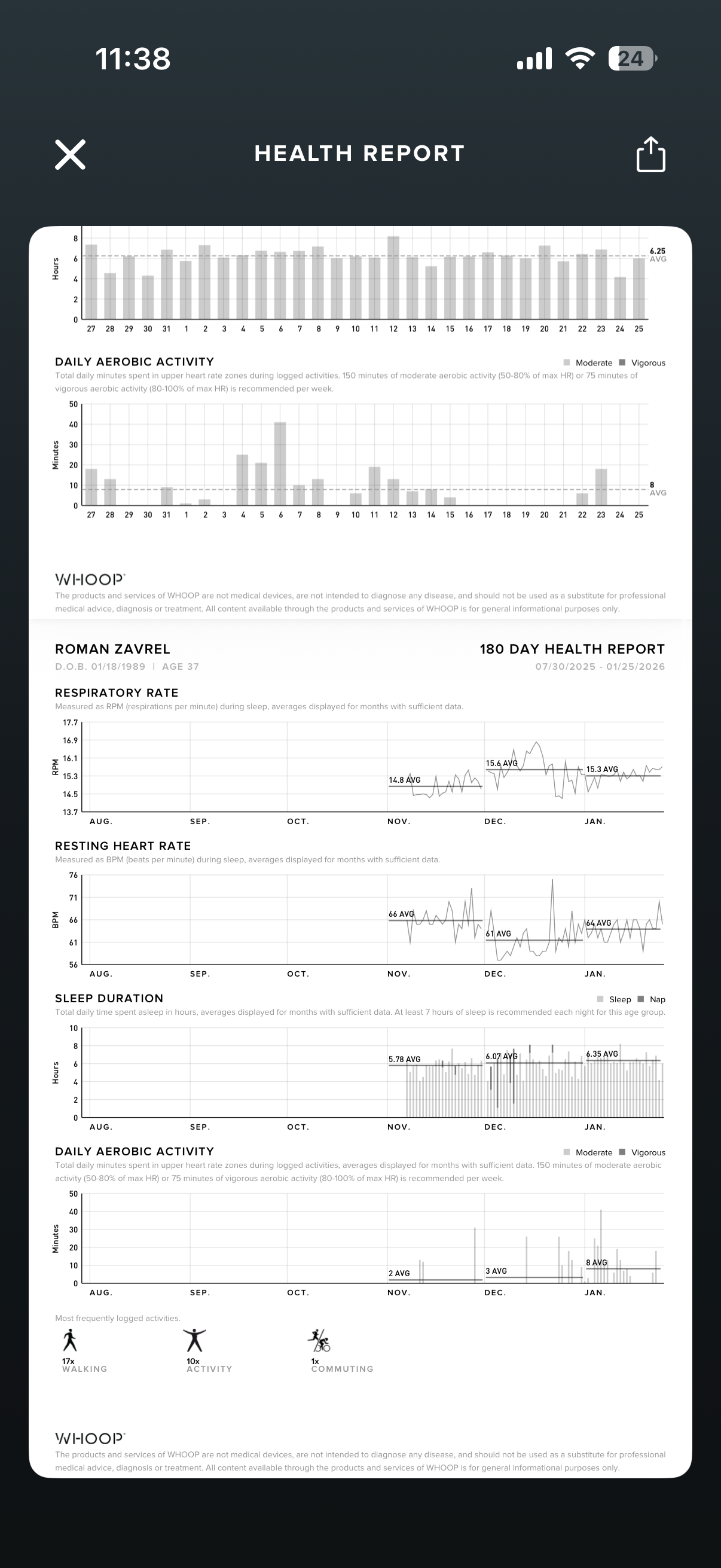 Za oněch 399 € mám k dispozici vše, co Whoop umí. To zahrnuje měření EKG, upozornění na nepravidelný srdeční rytmus, denní odhad krevního tlaku, klidovou tepovou frekvenci, HRV, frekvenci tepu během celého dne, respirační frekvenci, teplotu kůže, délku spánku, spánkové fáze, Sleep Score, Recovery Score, doporučenou potřebu spánku, denní zátěž (Strain), automatickou detekci aktivit, VO₂ max, kardio zátěž, denní připravenost k výkonu, Healthspan (biologický věk), Pace of Aging neboli rychlost stárnutí a trendy jejího vývoje. Důležité je si uvědomit, že veškerá data jsou sbírána 24/7/365. Pokud navíc Whoop představí během vašeho předplatného nějaký nový lepší náramek, tak jej získáte zdarma, pokud máte nejvyšší předplatné, pokud nižší, získáte možnost výhodně přejít na vyšší členství.