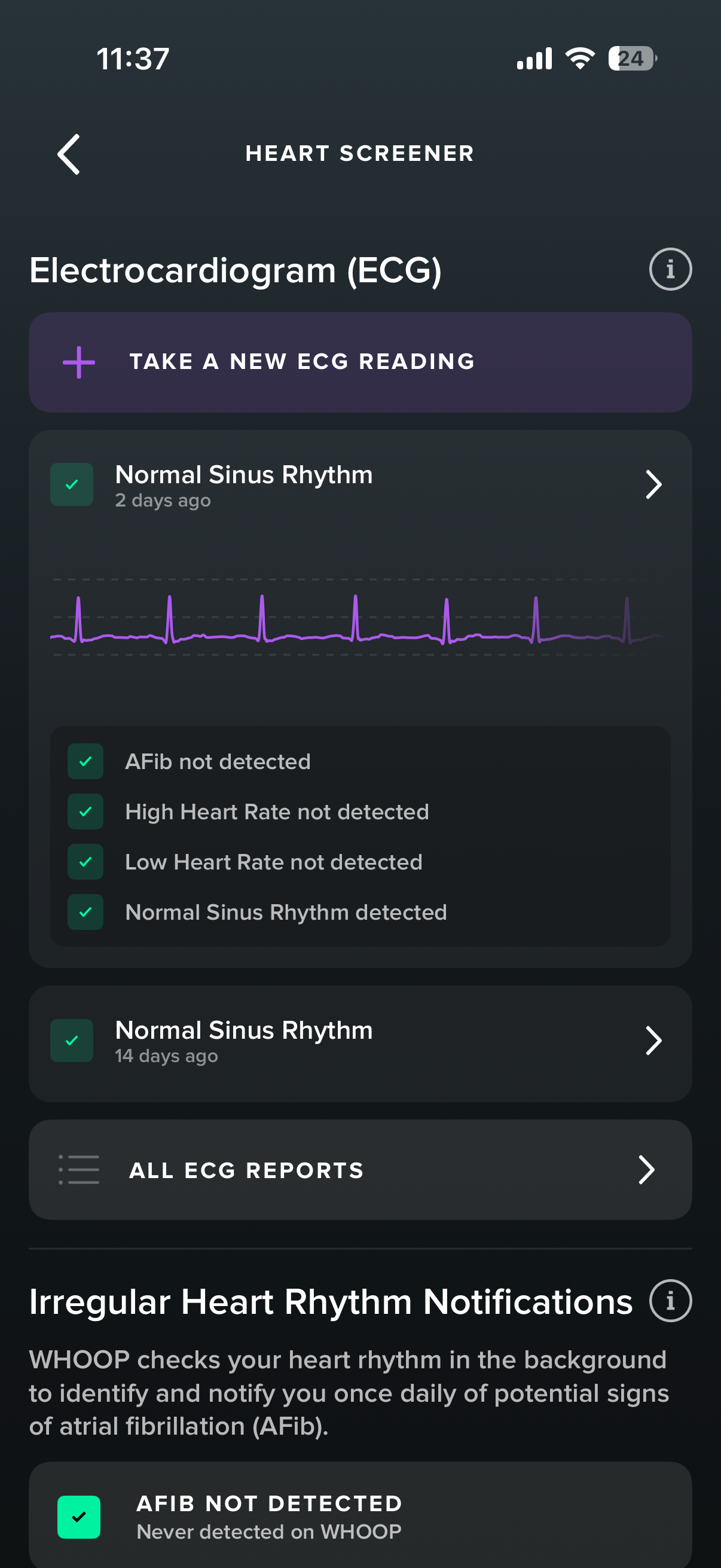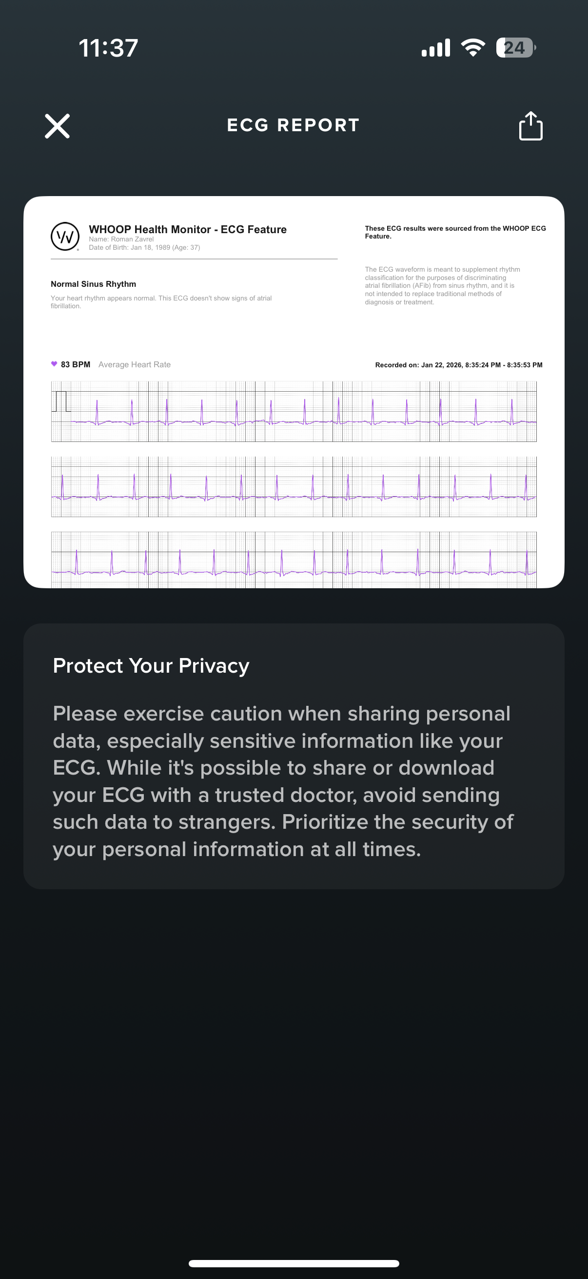 Jediné, co mi u Whoop MG vadí, je fakt, že měření EKG není možné vyvolat bez nutnosti zapnout aplikaci. Stačilo by, kdyby Whoop dovolil aktivovat měření EKG jednoduše tím, že přiložíte prsty na senzory, a po skončení měření vám dal haptickou odezvu. EKG si většinou měříte v situaci, kdy vám je opravdu špatně, cítíte bušení srdce nebo něco podobného, a nemáte zájem zapínat aplikaci a proklikávat se k zahájení měření. To je věc, na které bych byl opravdu rád, aby Whoop zapracoval.