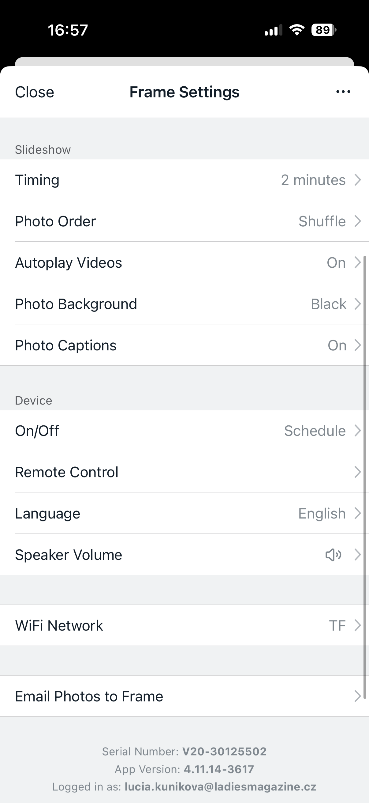 Často zmiňované „neomezené úložiště“ je vhodné vnímat v širším kontextu. Samotný rám samozřejmě nemá neomezenou interní paměť, ale slouží spíše jako zobrazovací zařízení, které si dočasně ukládá pouze aktuálně používaný obsah. Veškeré fotografie jsou ukládány v cloudu služby Aura, kde nejsou stanoveny žádné limity na počet nahraných snímků ani alb. Z pohledu uživatele tak není nutné řešit kapacitu, mazání starších fotografií ani jejich přesouvání mezi zařízeními. Co se mi líbí je možnost zaslat na mailovou adresu, která vám je při vytvoření účtu vygenerována fotografie a ty se následně zobrazí okamžitě přímo na rámečku. Pokud například koupíte rámeček rodičům, můžete jim do nej kdykoli máte nějakou novou zajímavou fotku poslat fotografii přímo přes email, ať už jste kdekoli na světě.