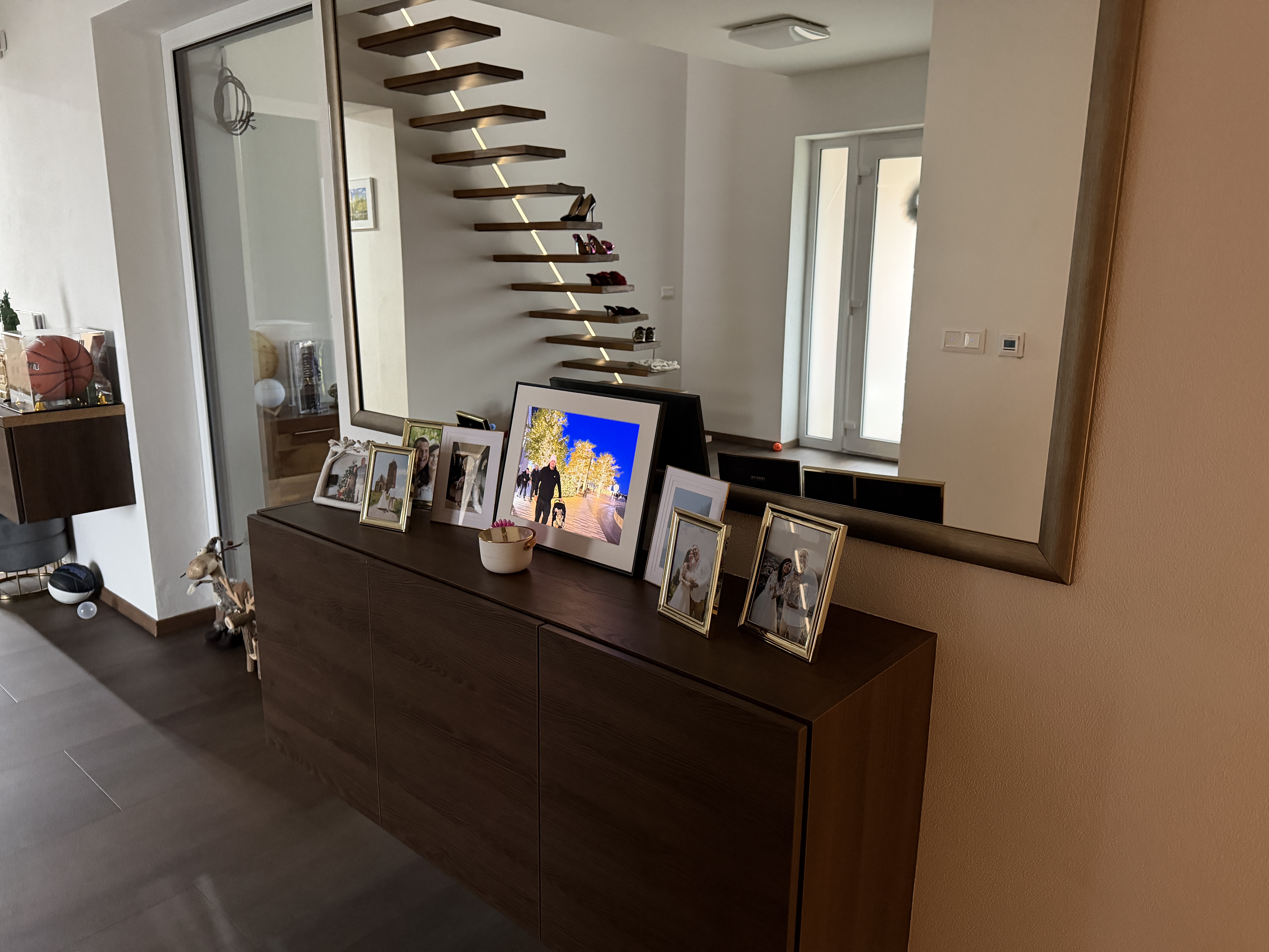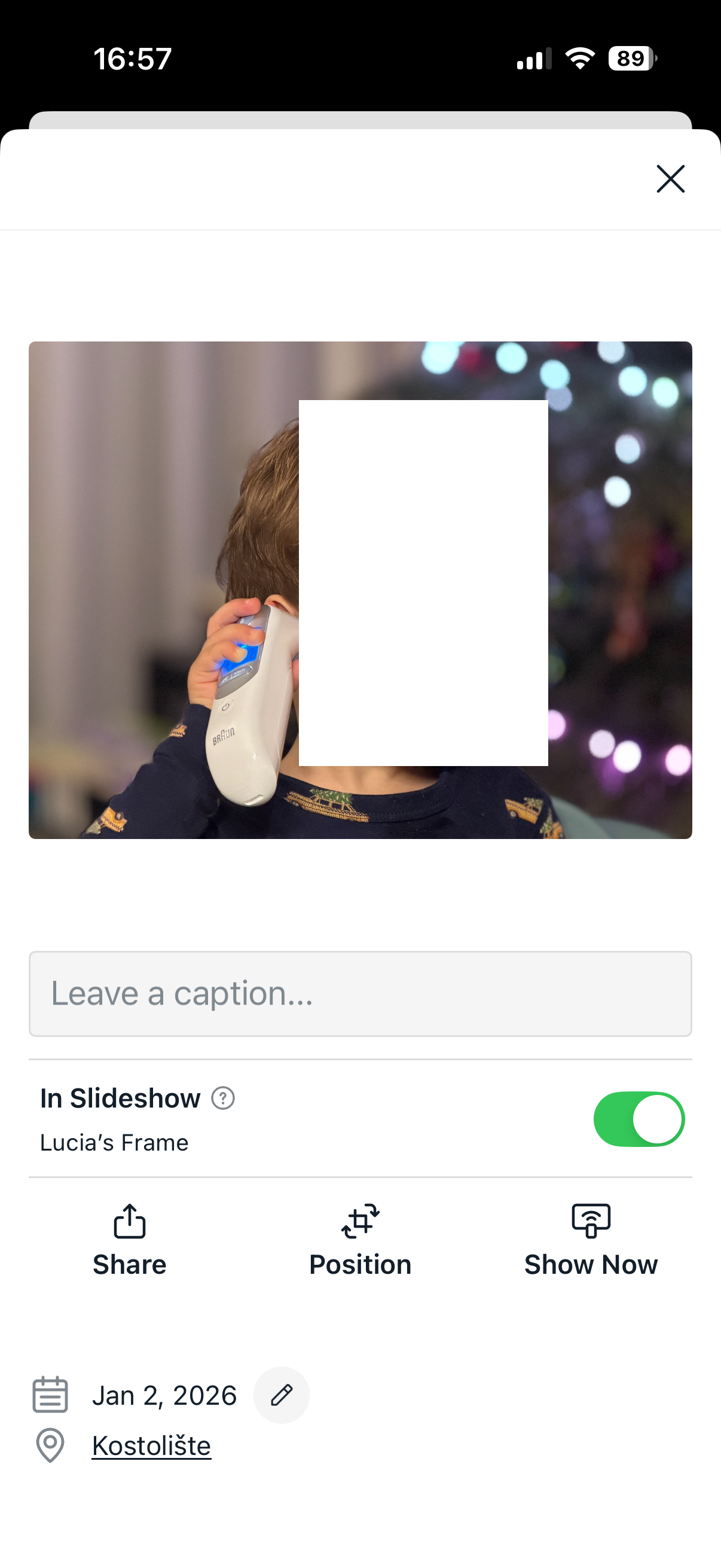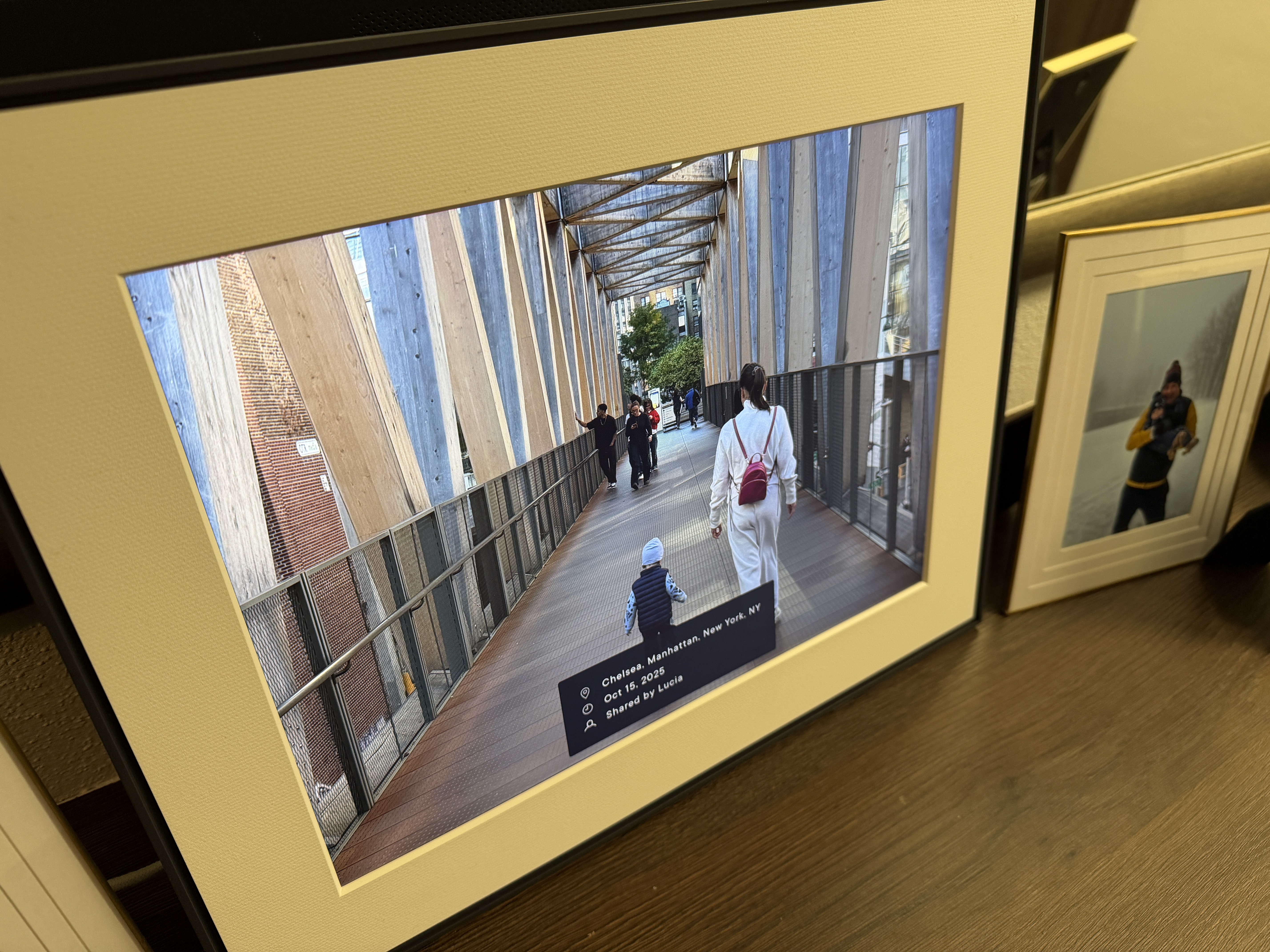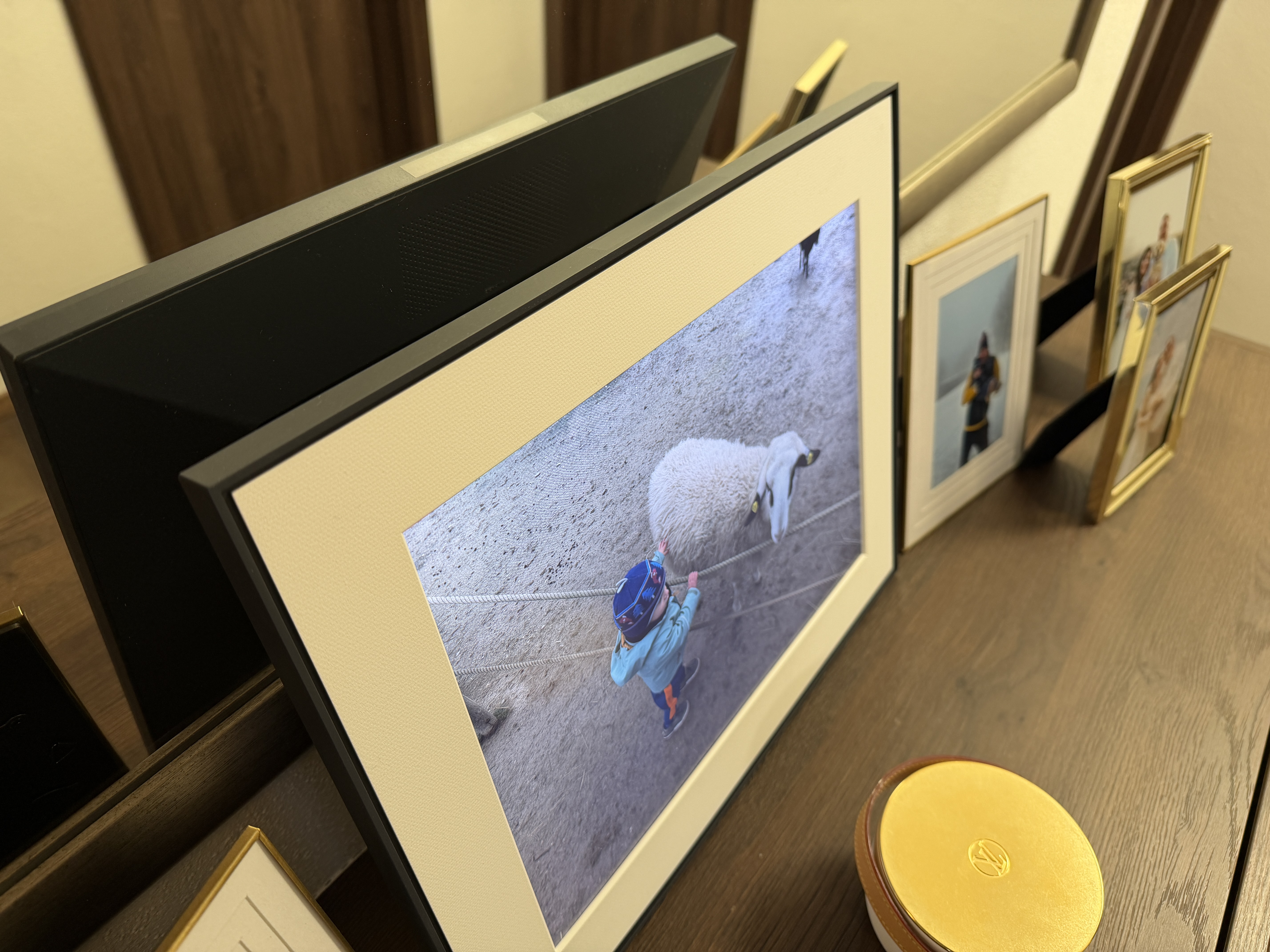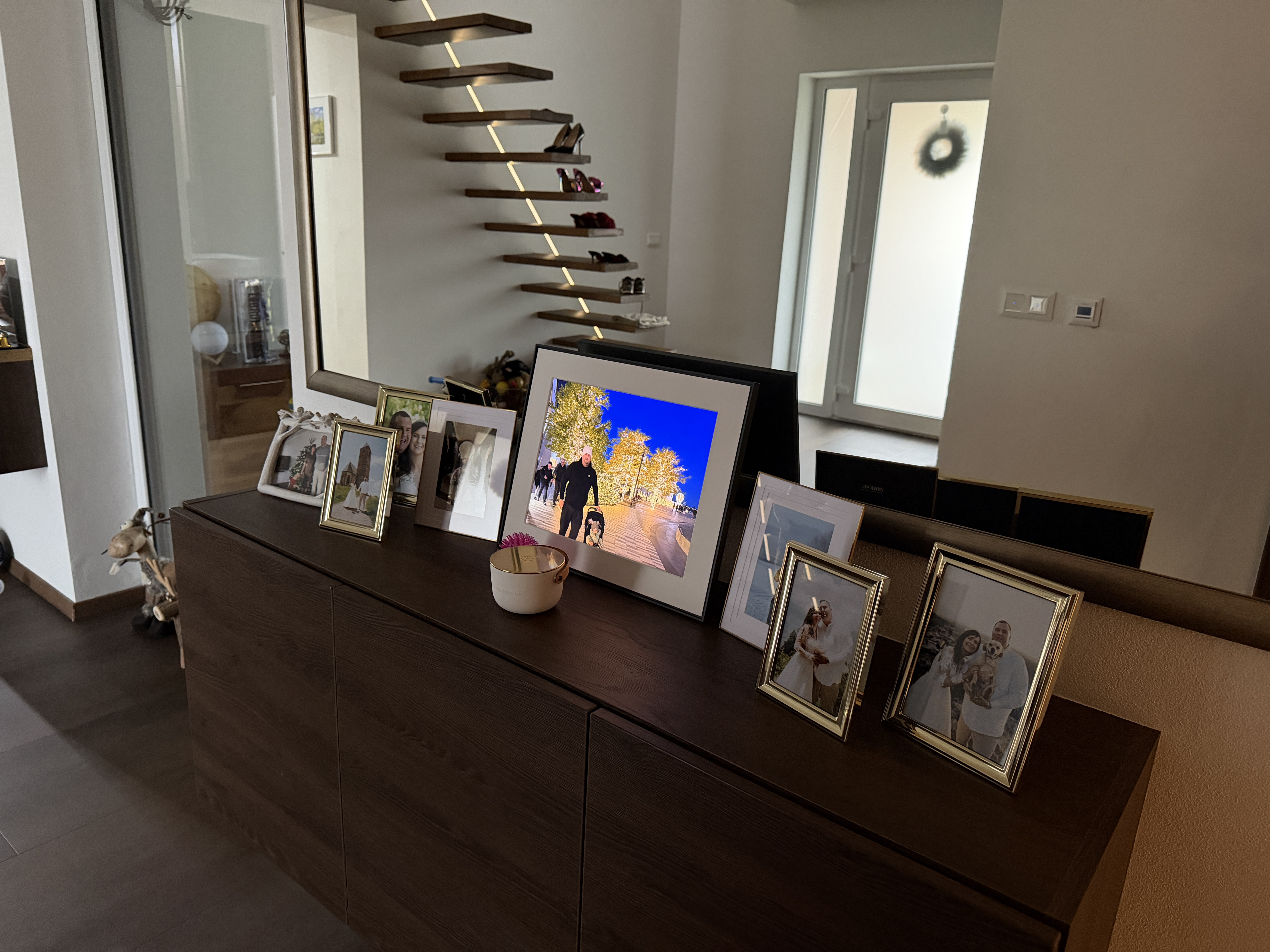 Vzhledem k tomu ,že máme poměrně velký interiér, volil jsem největší variantu, tedy 15″ displej, kde je navíc potřeba počítat s tím, že okolo disopleje máte ještě část samotného rámečku, jedná se tedy o opravu velký fotorámeček, který potřebuje svůj prostor, aby odkonale vynikl v interiéru. Patnáctipalcový displej s rozlišením 1600 × 1200 pixelů a poměrem stran 4:3 je zvolen s ohledem na skutečné používání. Právě tento formát odpovídá většině fotografií pořízených chytrými telefony, a není proto nutné snímky nepřirozeně ořezávat nebo doplňovat černými pruhy. Obraz působí přirozeně, barvy nejsou přepálené a antireflexní povrch výrazně omezuje odlesky i v prosvětlených místnostech. V běžném provozu tak rám nepůsobí jako digitální displej, ale spíše jako kvalitní tištěná fotografie a to je právě to, čím se liší od čehokoli jiného, co dnes najdete na trhu.