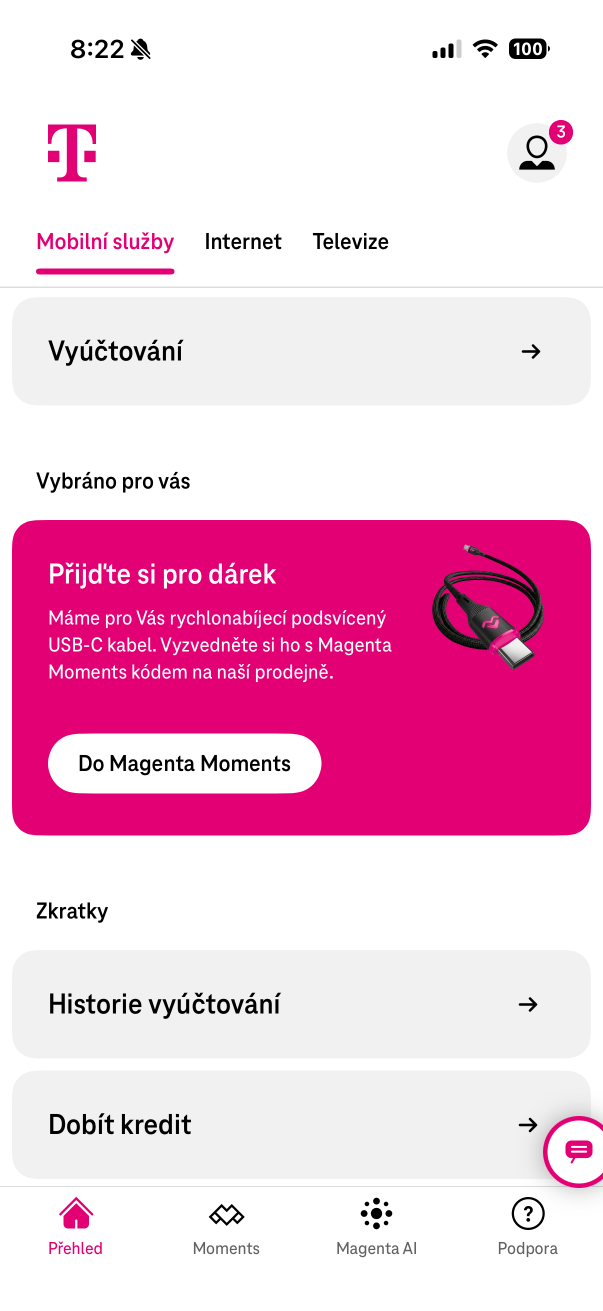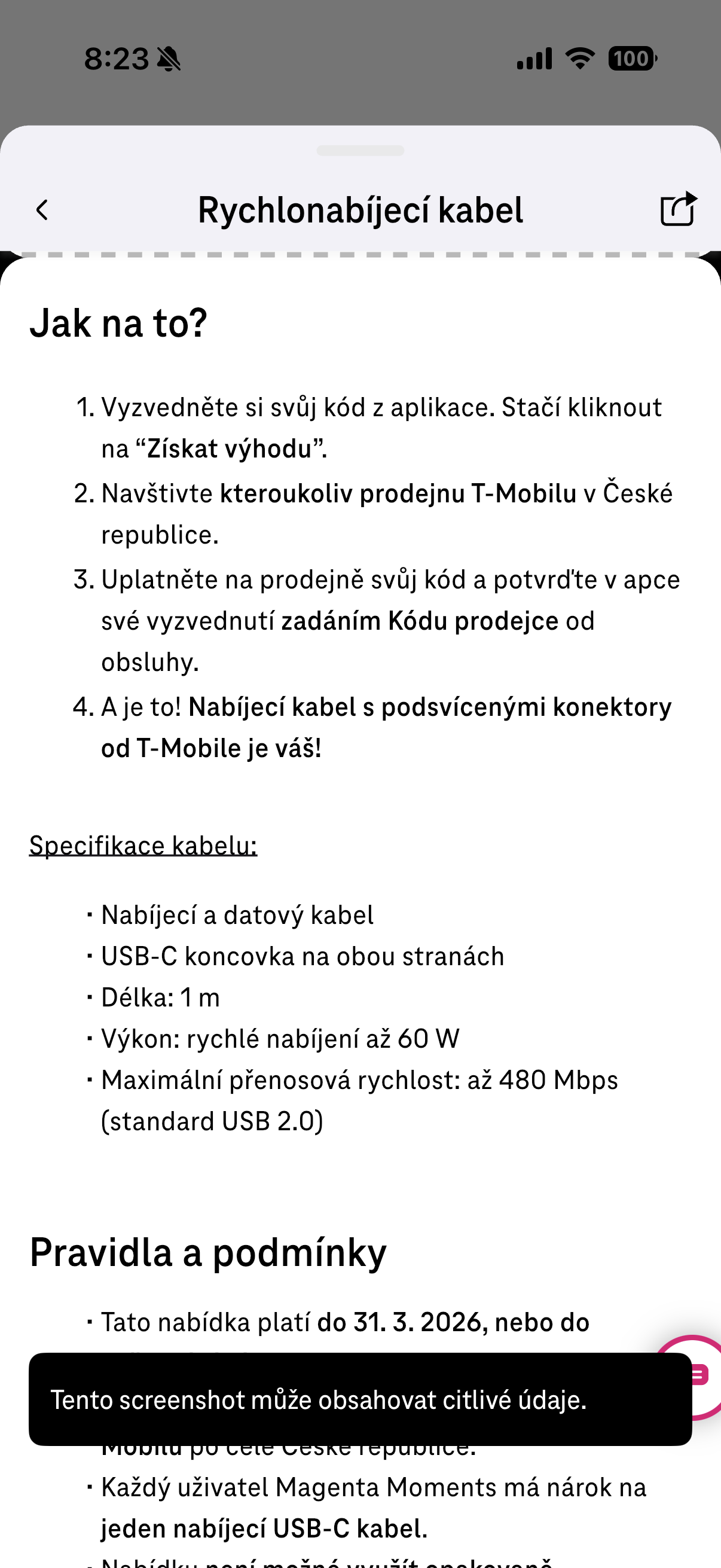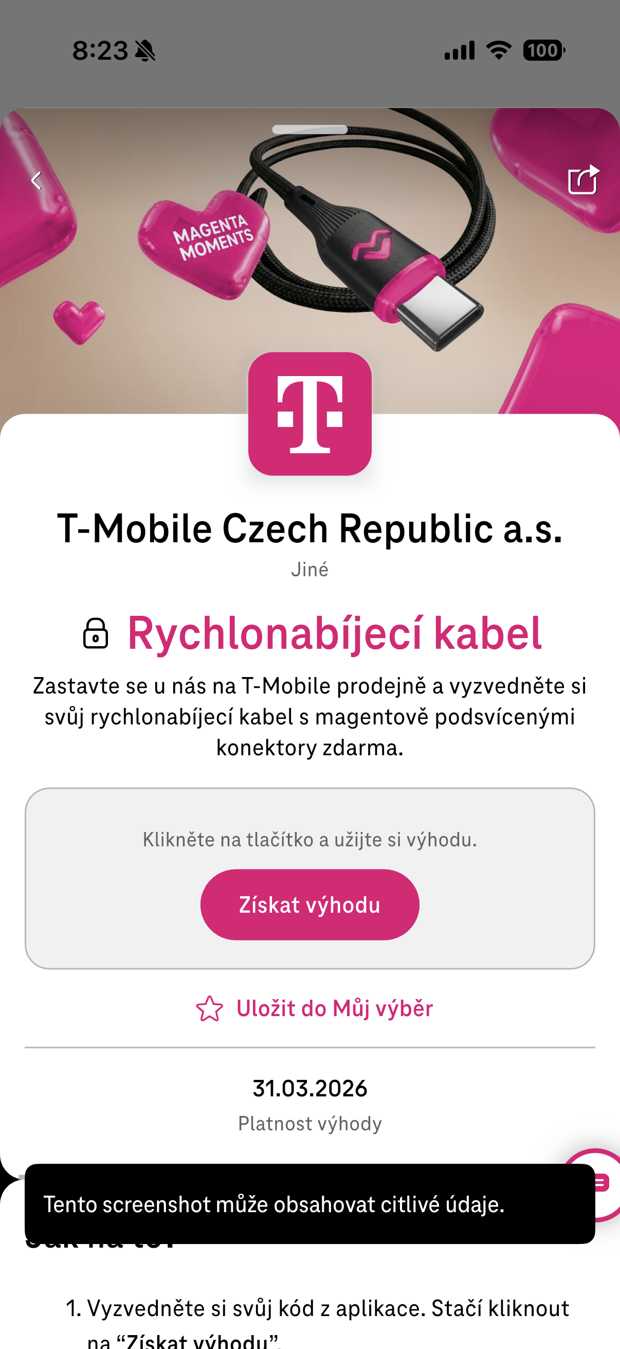 Abyste kabel získali, stačí splnit velmi jednoduchou podmínku a to sice mít ve svém telefonu nainstalovanou aplikaci Magenta Moments a v ní být coby klient T-Mobile přihlášený. Pak už stačí jen s telefonem a aplikací dorazit na některou z poboček, na které ukážete váš kód prodejci, ten vám následně předá jeho kód pro ověření v aplikaci a kabel je váš. Jedná se tedy o jednoduchou záležitost a hlavně otázku chvilky, která se určitě vyplatí za tento kabílek obětovat.