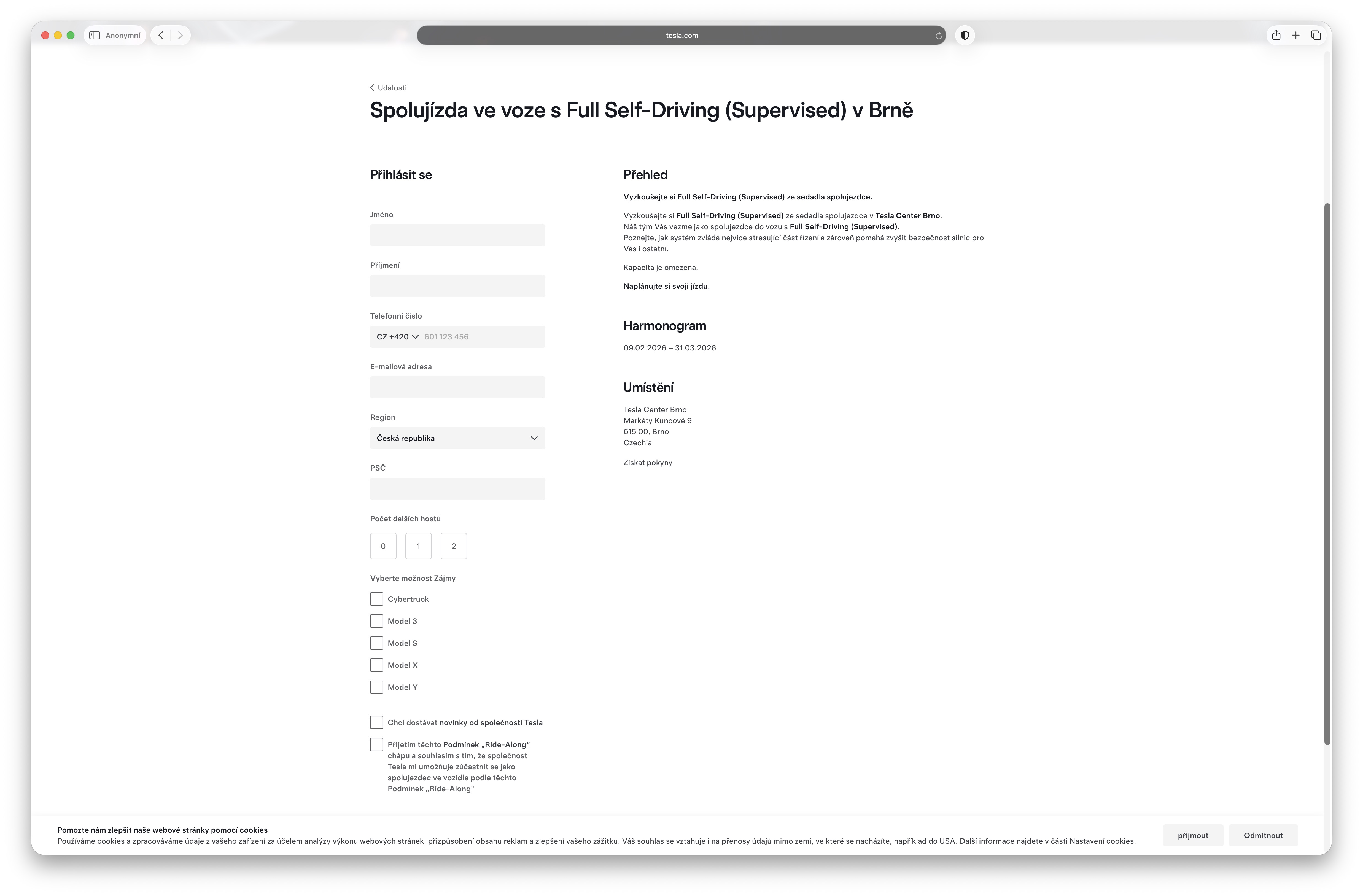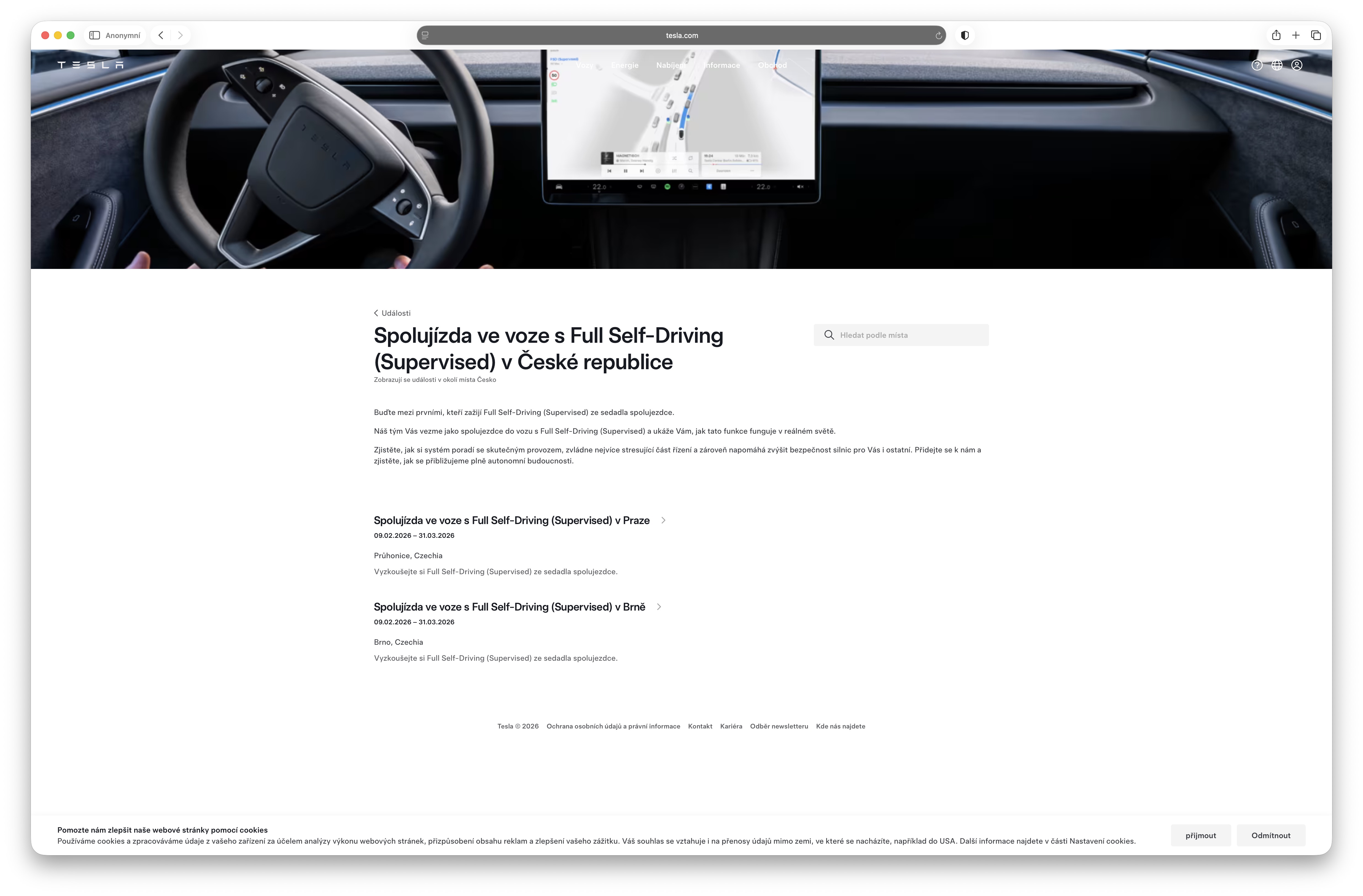 „Buďte mezi prvními, kteří zažijí Full Self-Driving (Supervised) ze sedadla spolujezdce. Náš tým Vás vezme jako spolujezdce do vozu s Full Self-Driving (Supervised) a ukáže Vám, jak tato funkce funguje v reálném světě. Zjistěte, jak si systém poradí se skutečným provozem, zvládne nejvíce stresující část řízení a zároveň napomáhá zvýšit bezpečnost silnic pro Vás i ostatní. Přidejte se k nám a zjistěte, jak se přibližujeme plně autonomní budoucnosti,“ láká Tesla na svých oficiálních stránkách pro Českou republiku s tím, že testovací jízdy s autonomním pilotem budou probíhat v Praze a Brně a to konkrétně od 9. 2. do 31. 3. letošního roku. Zajímavé je pak i to, že s sebou můžete jednak vzít další až 3 lidi a také to, že si můžete při rezervaci zvolit preferovaný vůz, ve kterém byste se chtěli projet. Jistota, že v něm pojedete, sice samozřejmě není 100%, ale bude-li to prodejce schopen zrealizovat, určitě daný vůz využije.