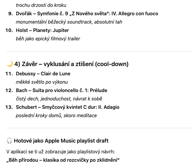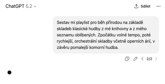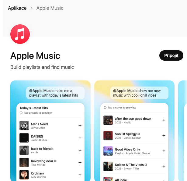 Teoreticky lze playlist pro Apple Music vytvořit i přes ChatGPT. Ten dokáže prohledávat katalog Apple Music a doporučit konkrétní skladby podle zadání. Zkoušela jsem to a funguje to, ale je to spíš experiment než pohodlná každodenní funkce. Nativní řešení přímo v aplikaci by bylo nesrovnatelně praktičtější.
