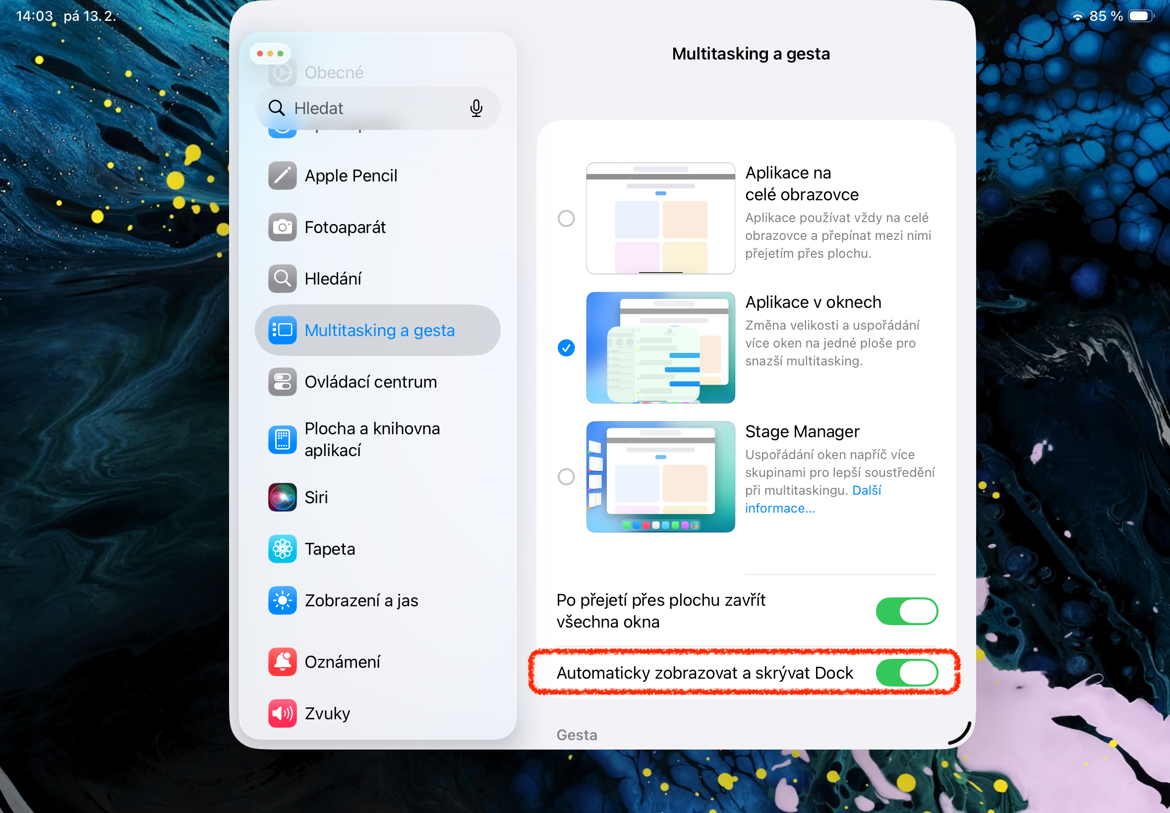 Multitaskingová možnost „Aplikace v oknech“ je zcela evidentně snaha Applu přiblížit prostředí iPadOS operačnímu systému macOS z Maců. Okna se totiž v tomto režimu na iPadech chovají víceméně stejně jako v případě macOS a to včetně horní lišty nabídek či trojice barevných „koleček“ pro ukončení, minimalizaci či naopak maximalizaci daného okna. Aby pak byl dojem oken á la macOS na iPadu dokonalý, je za mě klíčové si v Nastavení – Multitasking a gesta zkontrolovat, zda máte aktivovanou možnost Automaticky zobrazovat a skrývat Dock.