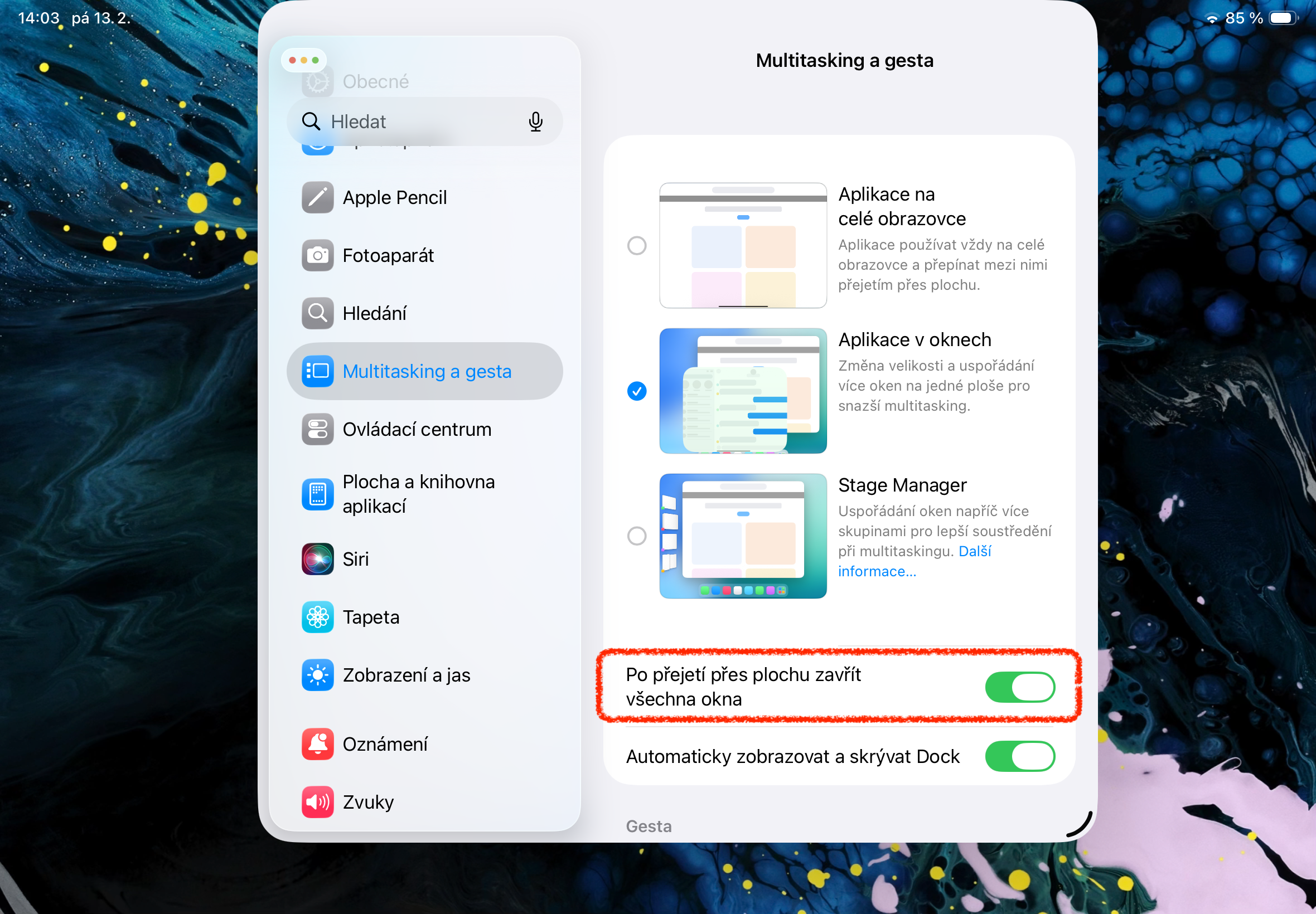 Druhé nastavení, které se mi osvědčilo, pak najdete na stejném místě. Jedná se konkrétně o přepínač Po přejetí přes plochu zavřít všechna okna s tím, že jakmile tuto funkci zapnete, přestanou se vám maximalizované aplikace „skrývat po okrajích displeje, ze kterého je lze rychle maximalizovat, ale jsou skryty v klasickém multitaskingovém panelu spuštěných aplikací, který vytáhnete stejně jako na iPhonu zespodu přes ovládací lištu. Ne každému toto nastavení samozřejmě bude vyhovovat, protože leckdo určitě rád aplikace zapne právě rychleji přes jejich částečné zobrazení po okrajích, ale za mě osobně je aktivace této funkce zajištění větší přehlednosti a čistoty systému.