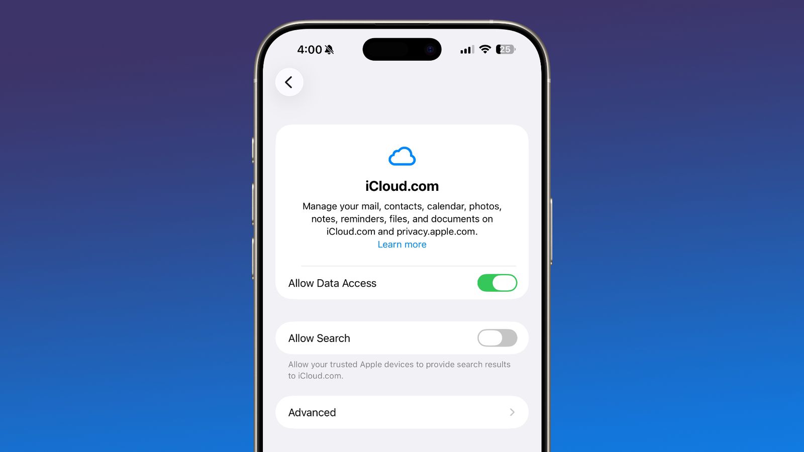 V Nastavení → iCloud přibývá dole položka iCloud.com, která nahrazuje starý přepínač pro přístup k datům na webu. Nově je tu i volba „Allow Search“, aby důvěryhodná zařízení mohla poskytovat výsledky vyhledávání pro iCloud.com.