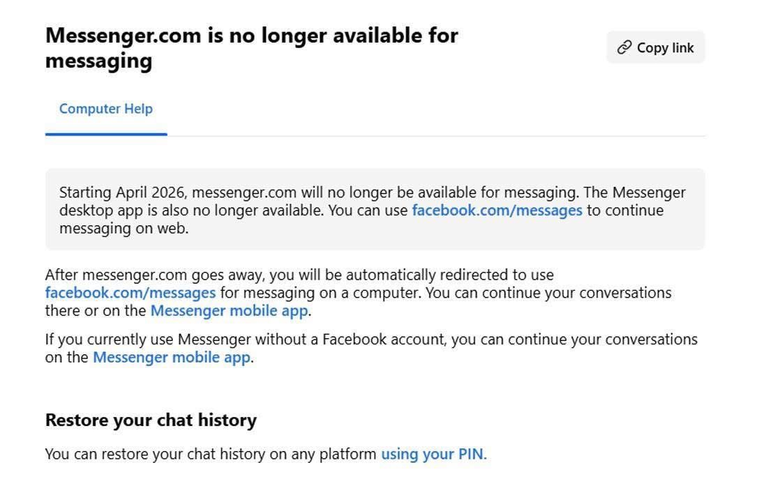 Loni v prosinci Meta zařízla aplikaci Facebook Messenger pro Windows a macOS. Uživatelé přitom tehdy dostali jasné doporučení přesunout se do mobilní aplikace, potažmo na web. Jenže řada lidí Messenger na počítači používala i bez facebookového účtu, a proto se pro ně přirozeně stal útočištěm web na adrese Messenger.com. Ani tahle varianta ale podle všeho nemá dlouhého trvání. Uživatelé po celém světě totiž hlásí, že jim začíná tato webová stránka zobrazovat okno informující o tom, že messenger.com bude od 15. dubna letošního roku vypnut.